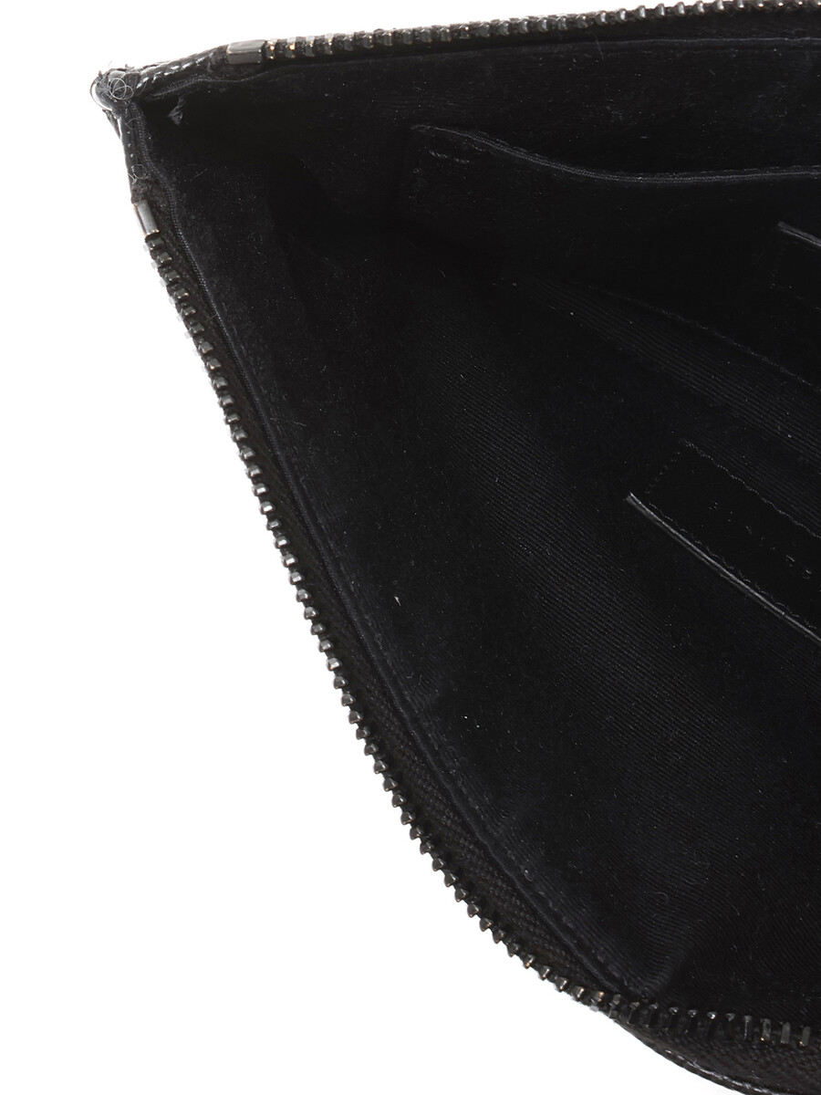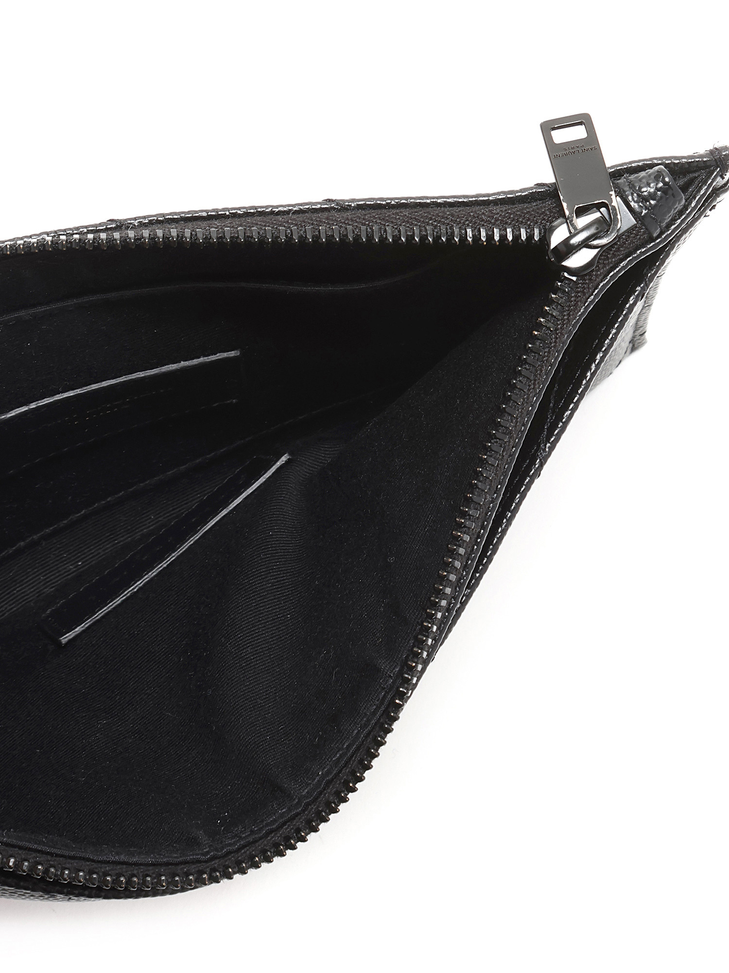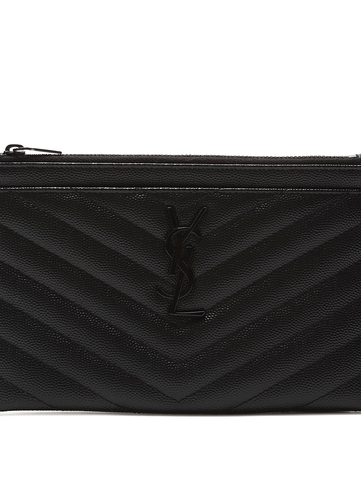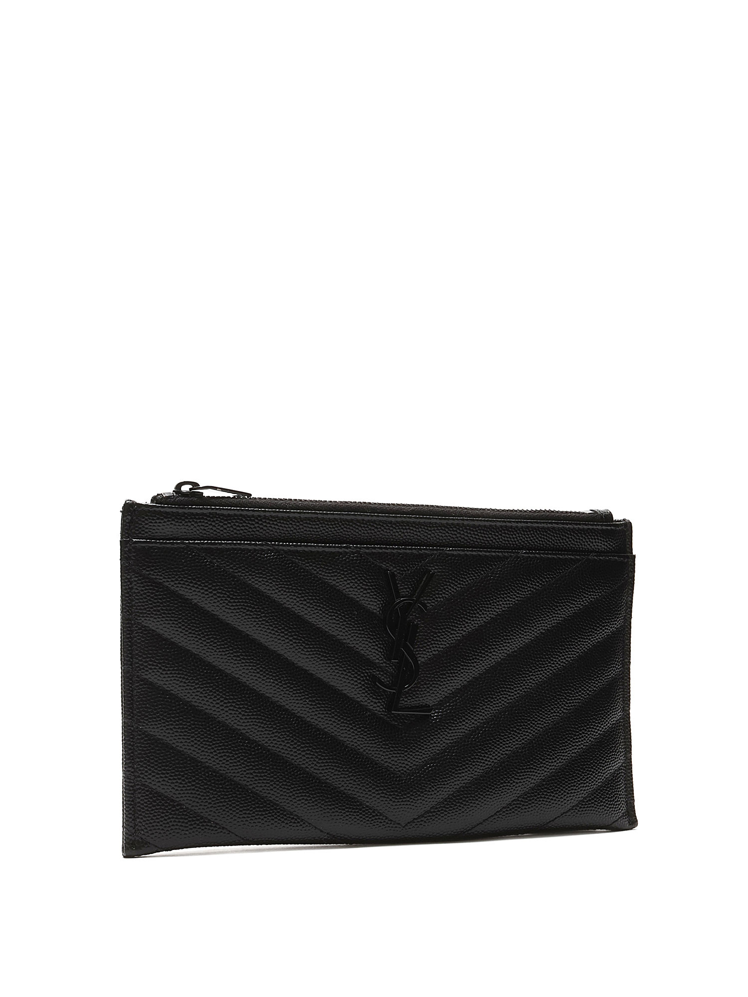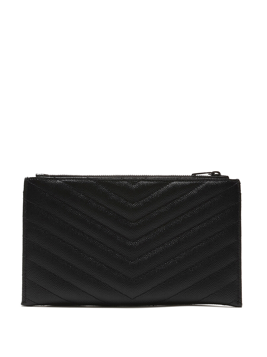 Chevron-pattern quilted leather pouch in black. Tonal black hardware. Top zipper closure. Comes with a dustbag.