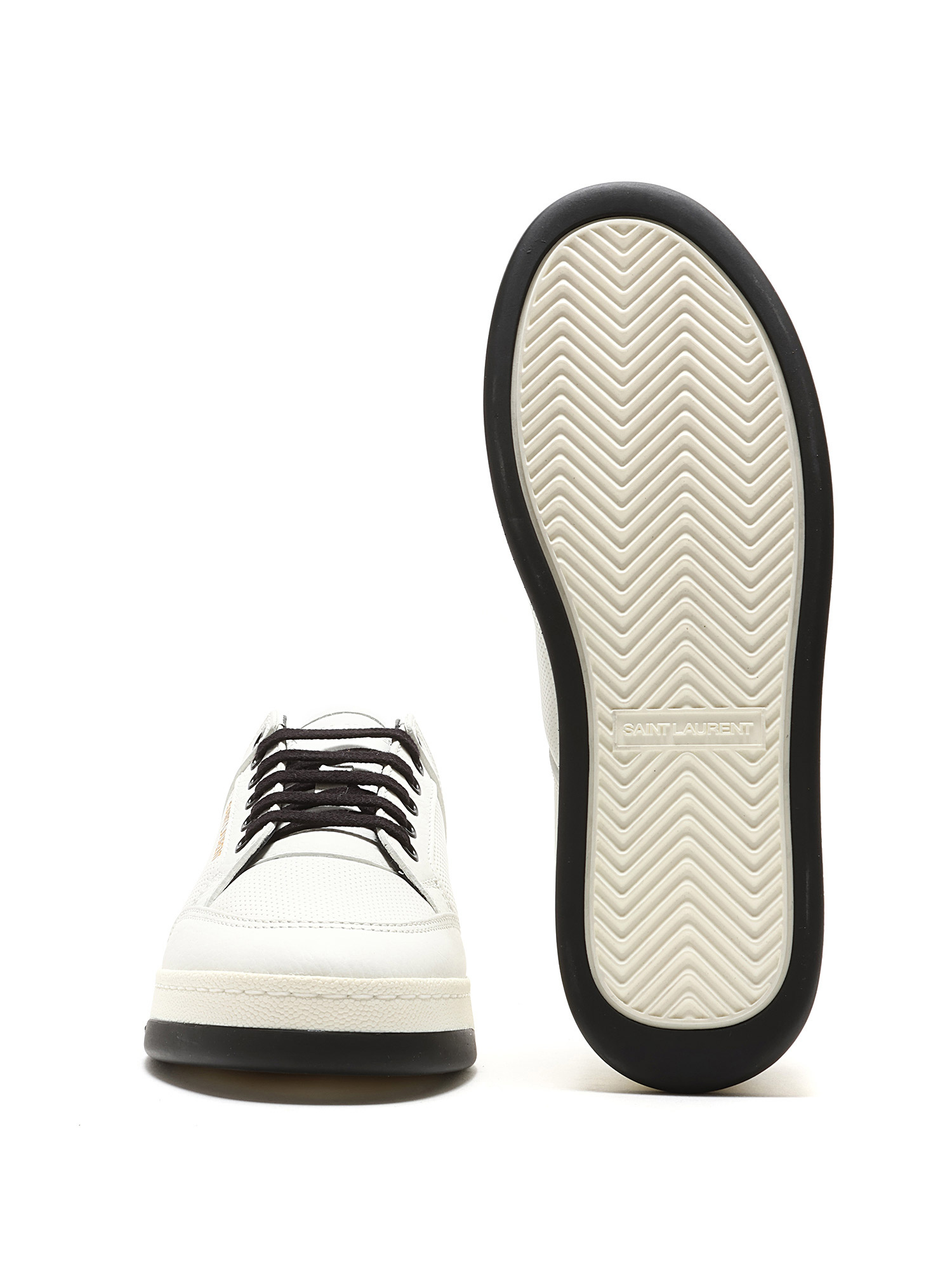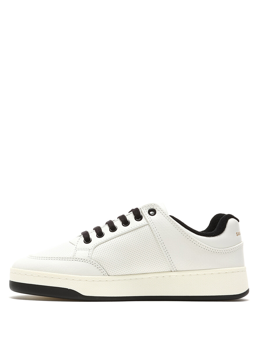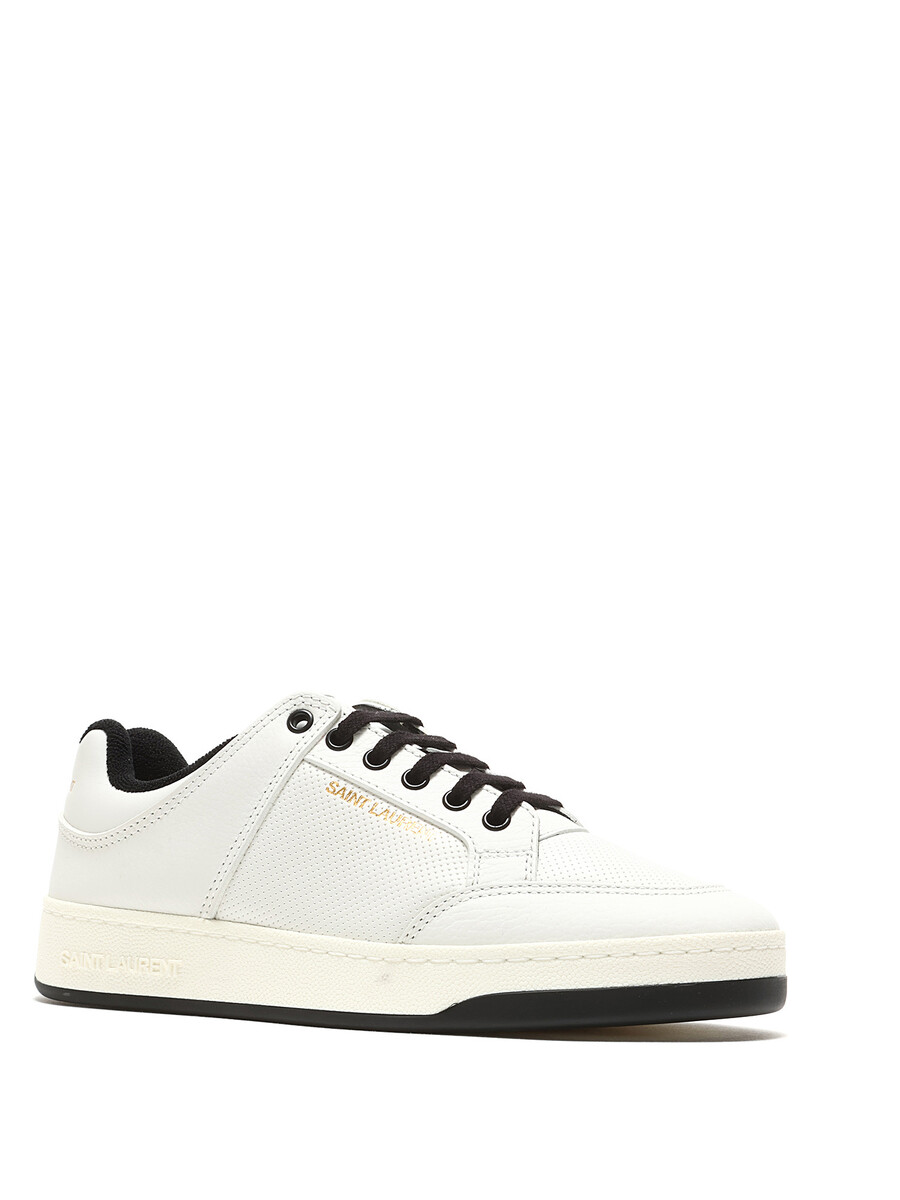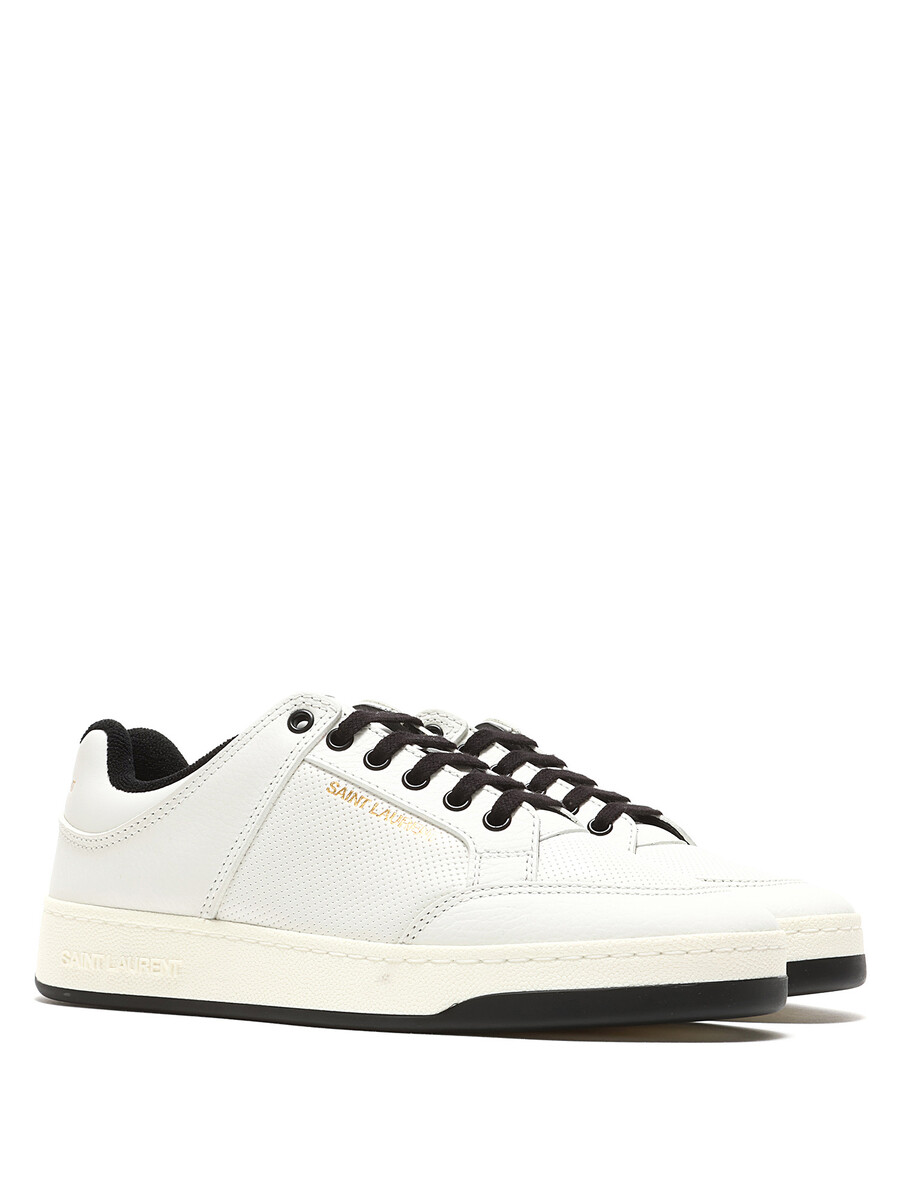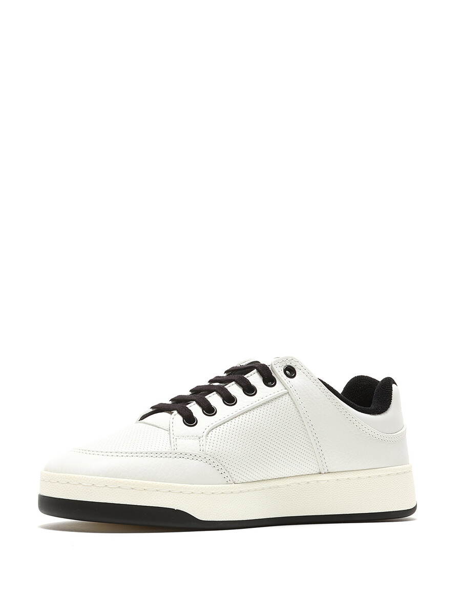 Perforated leather low top sneakers in white with black accents. Lace-up closure with metal eyelets. Round toe. Flat rubber sole.