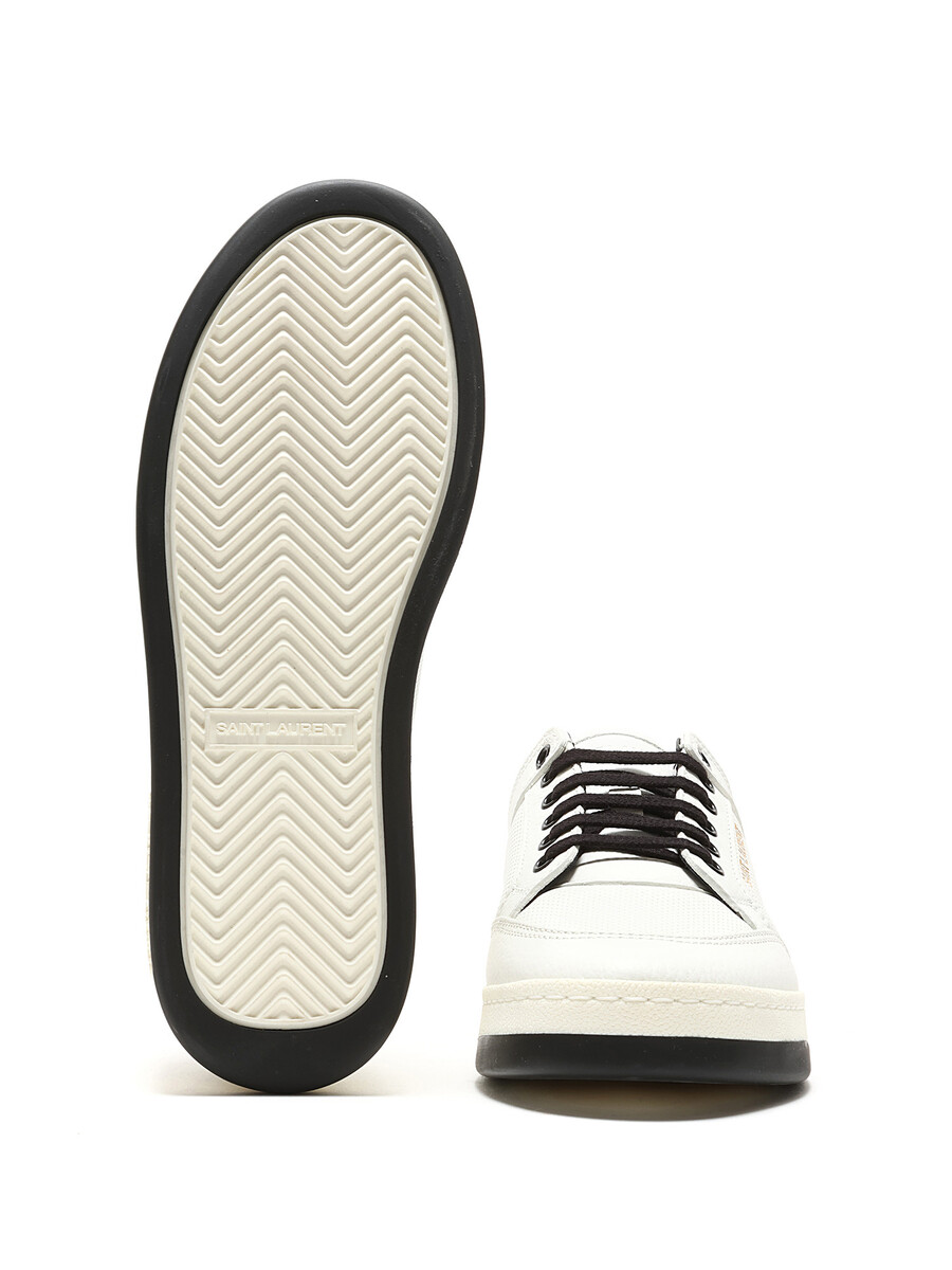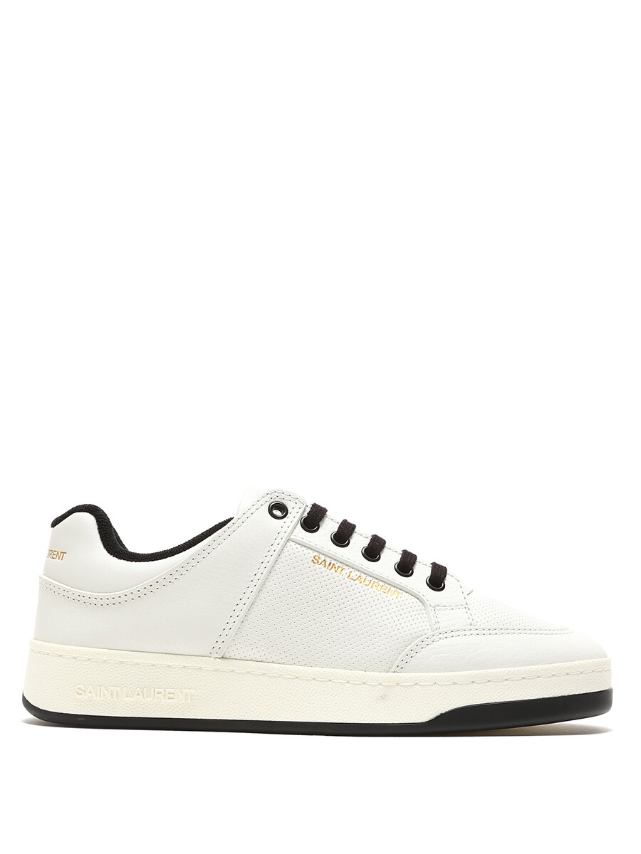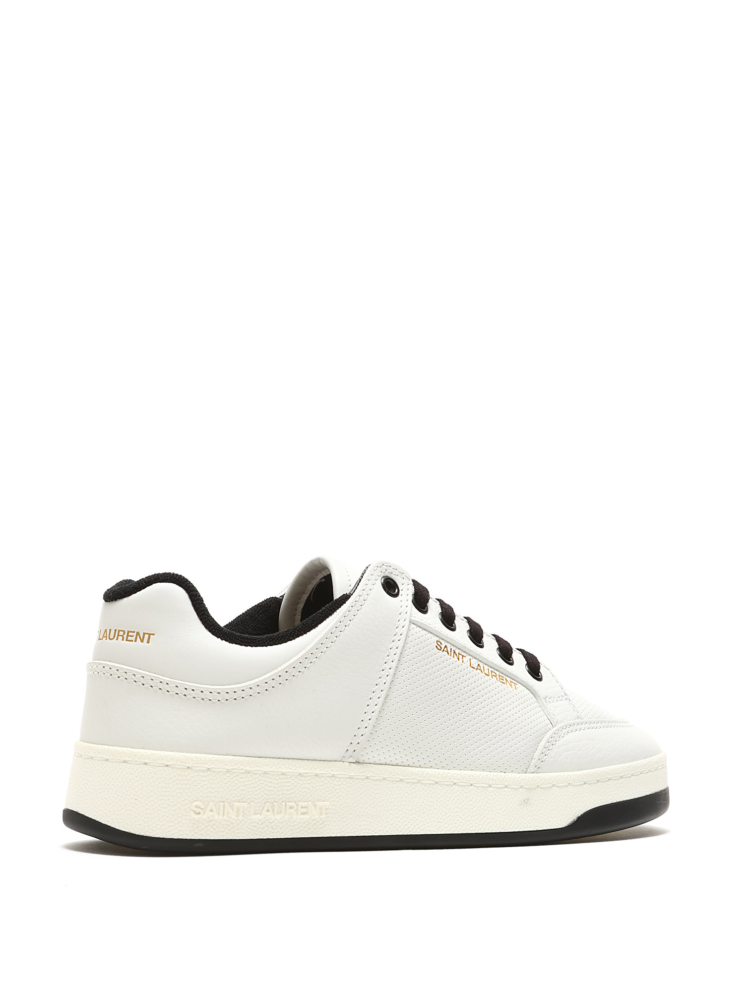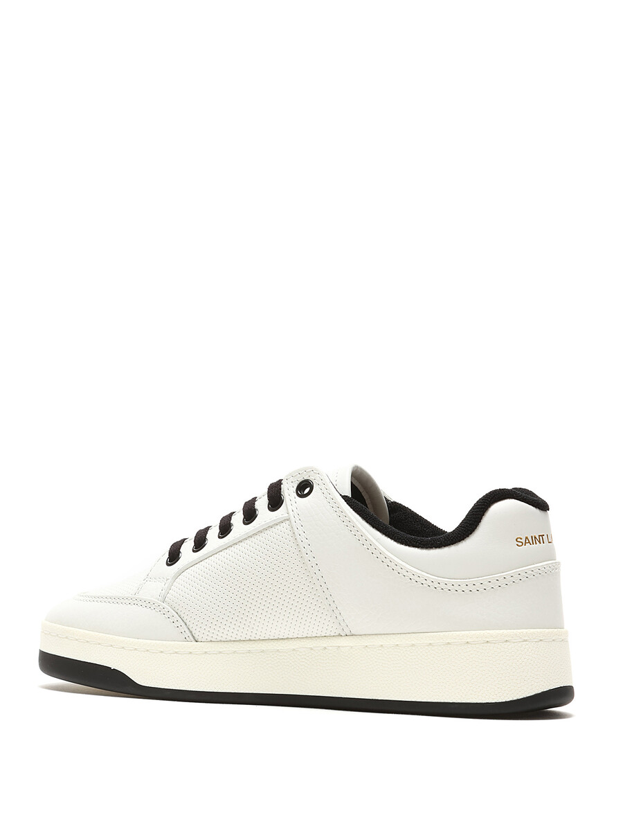 Perforated leather low top sneakers in white with black accents. Lace-up closure with metal eyelets. Round toe. Flat rubber sole.