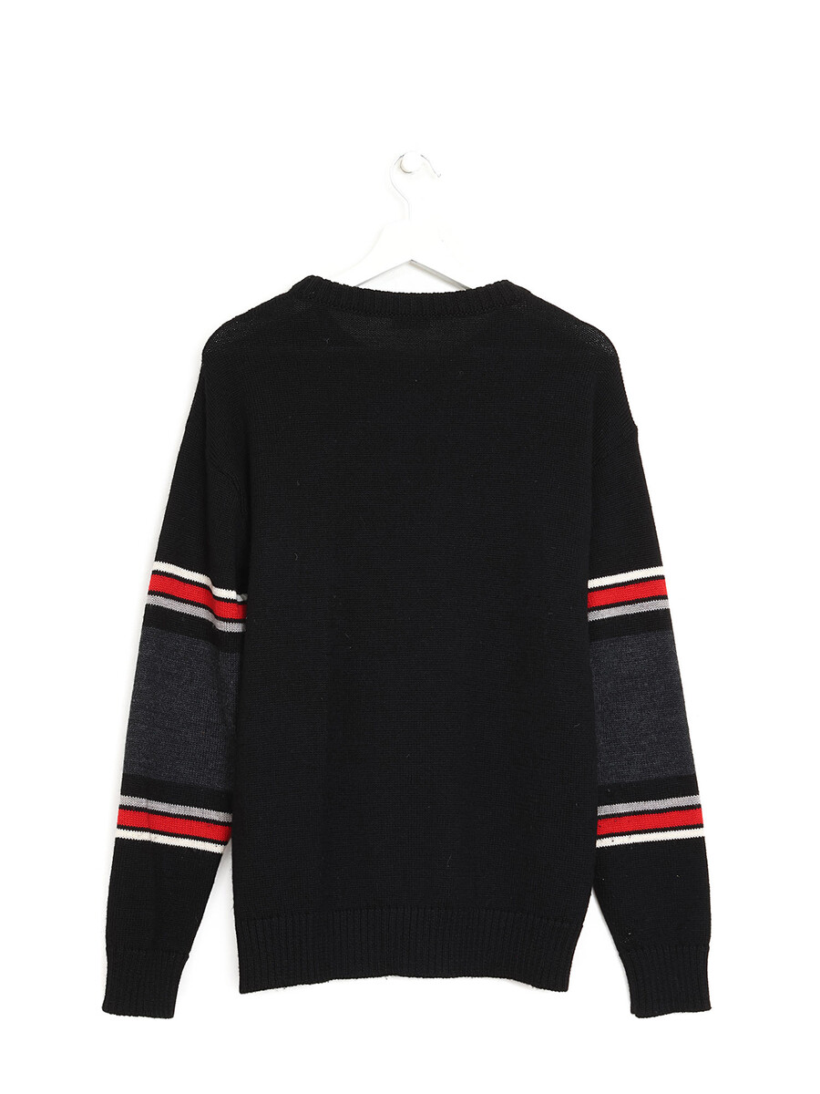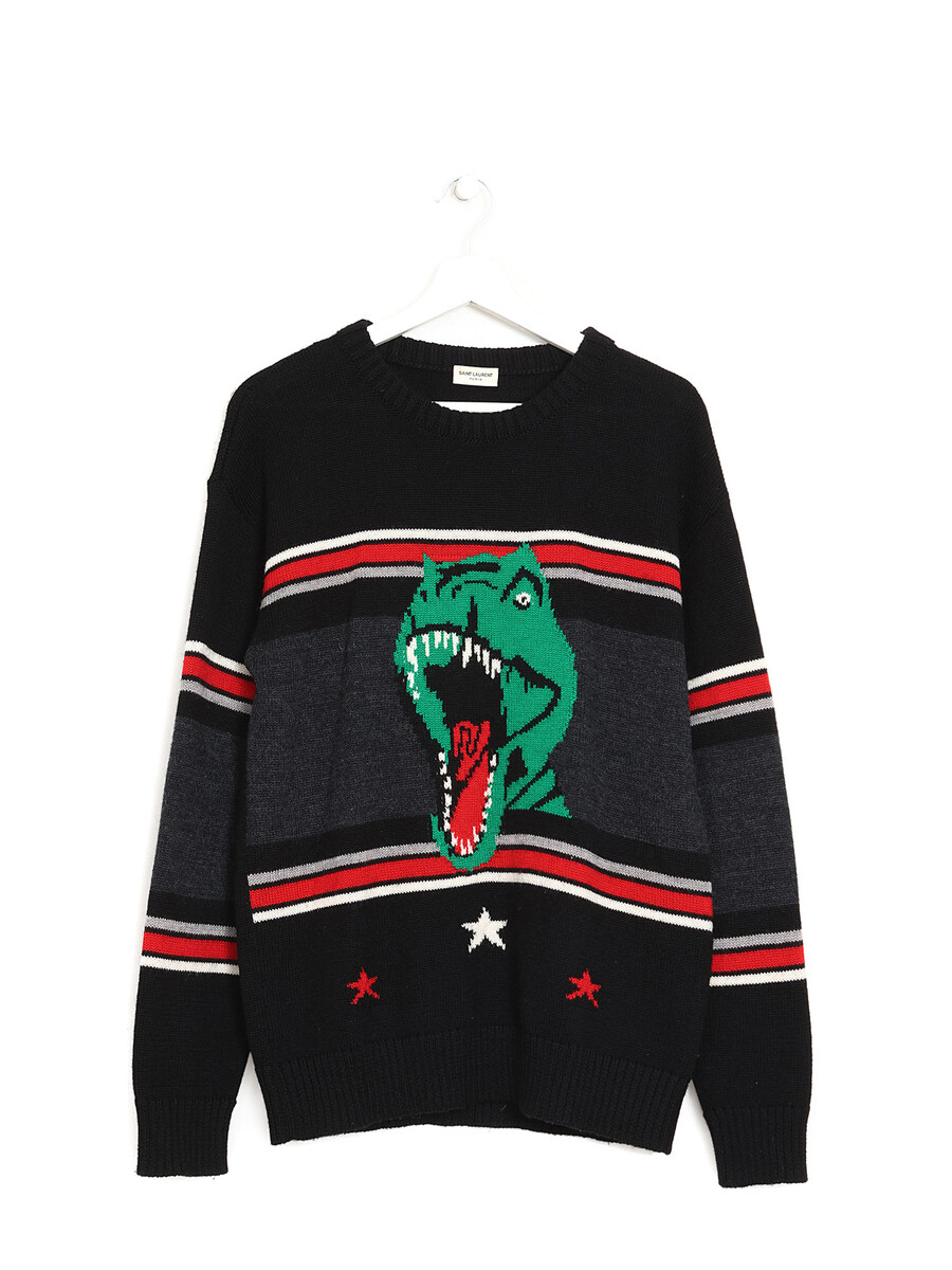 Long sleeve wool knit sweater featuring a playful dinosaur graphic and striped design in black with green, red, and white accents. Crew neckline.