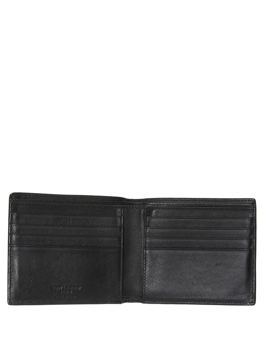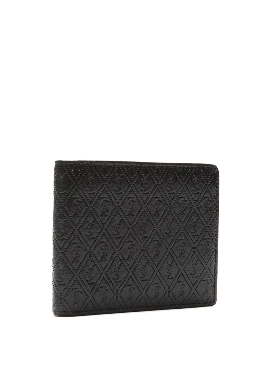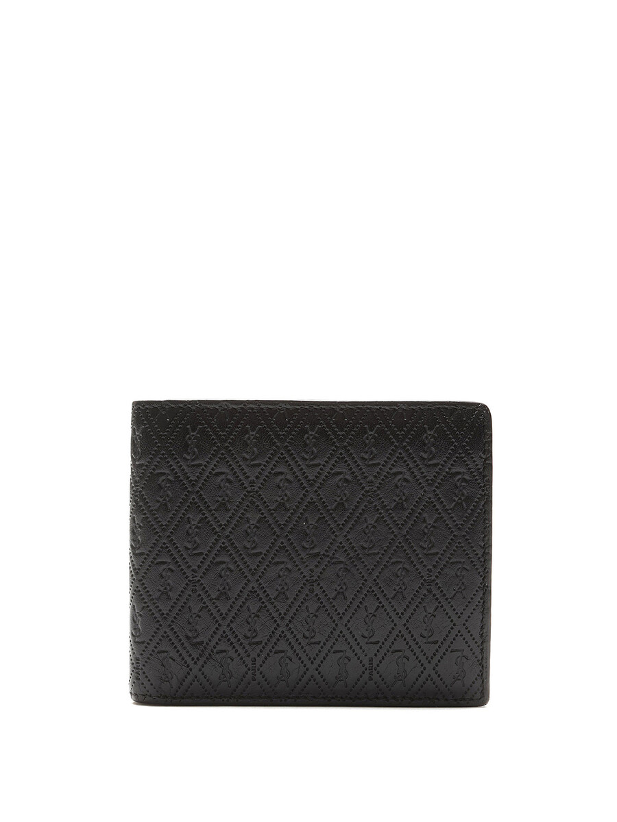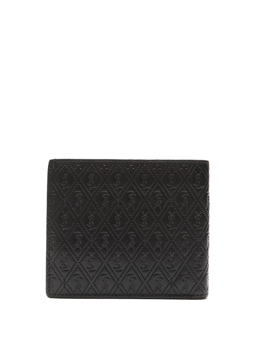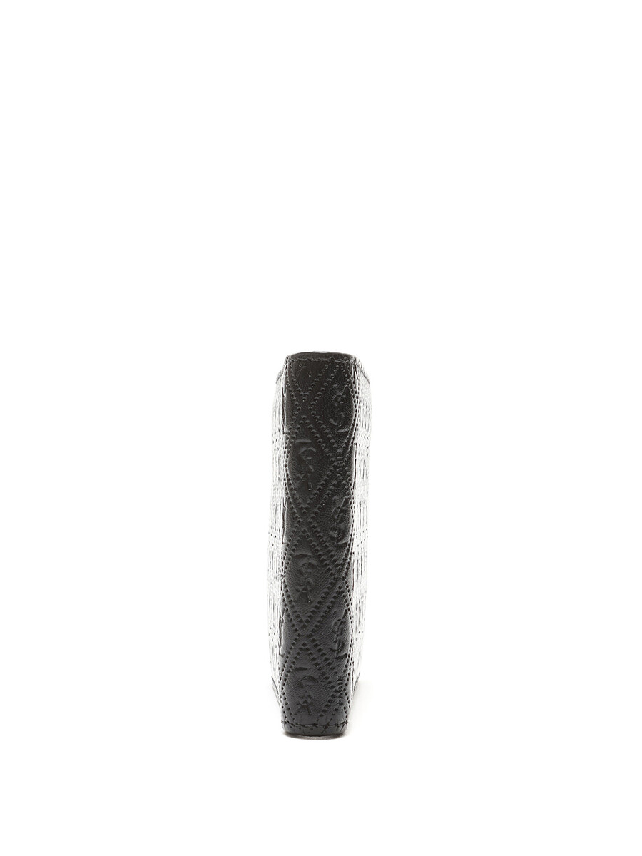 Quilted calf leather wallet in black. Features embossed logo pattern. Compact design.