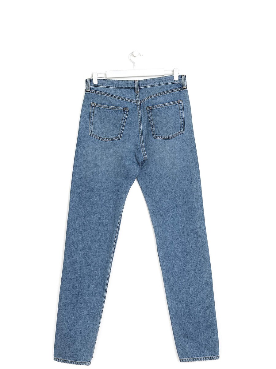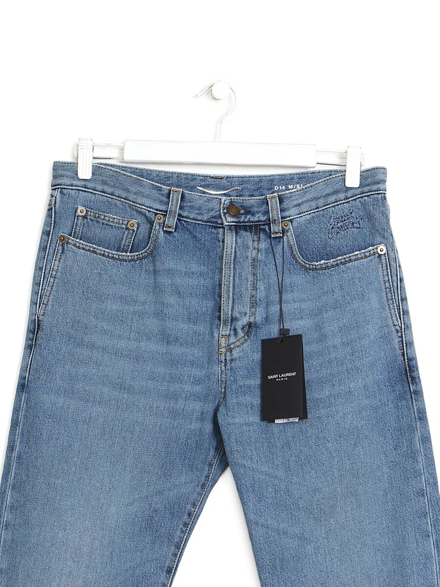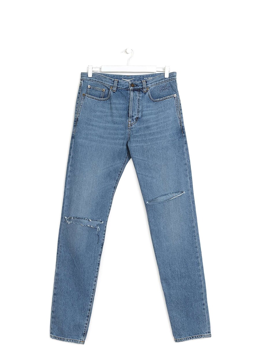 Lightly distressed slim-fit jeans in a faded wash. Button fly closure. Five-pocket styling.