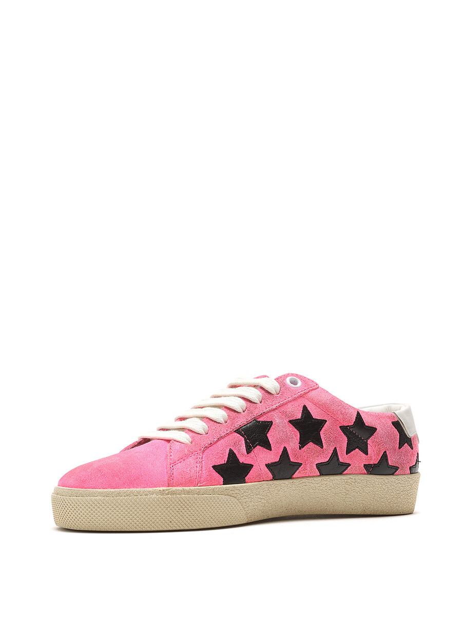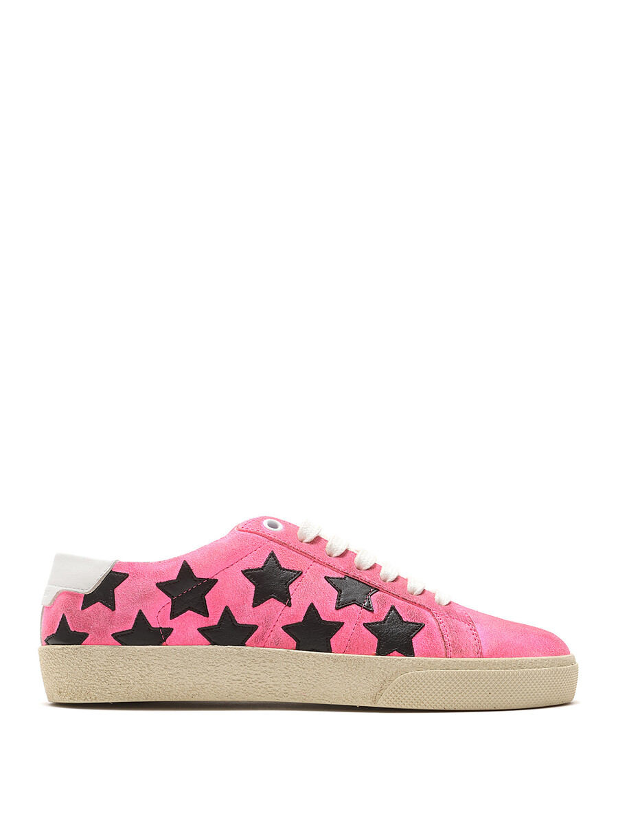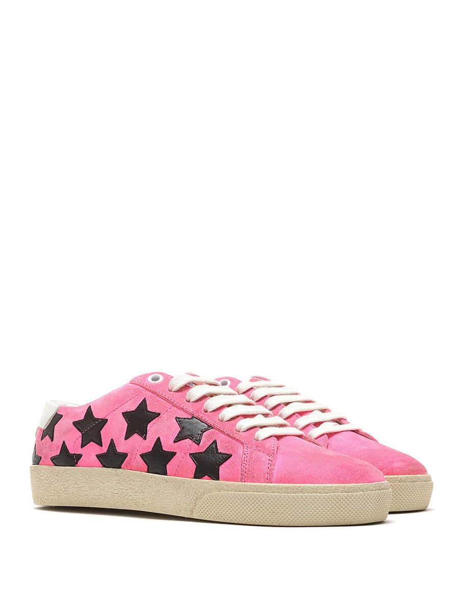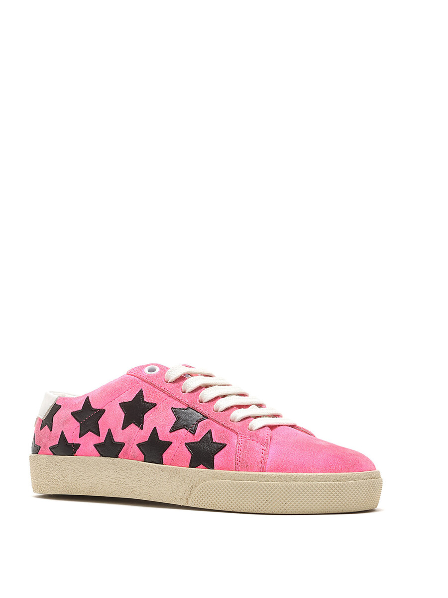 Low-top suede sneakers in a pink and black star pattern. Round toe design with lace-up closure. Textured rubber sole. With box.