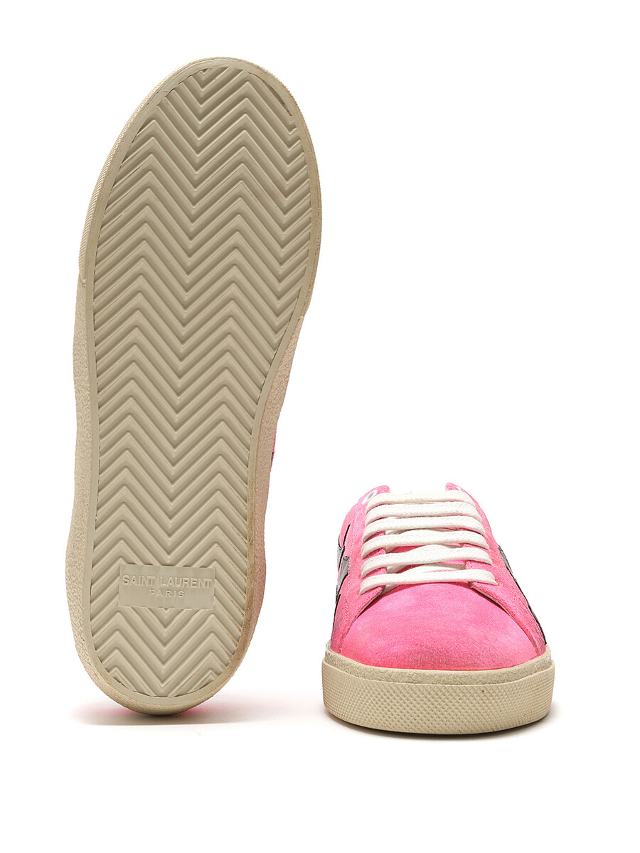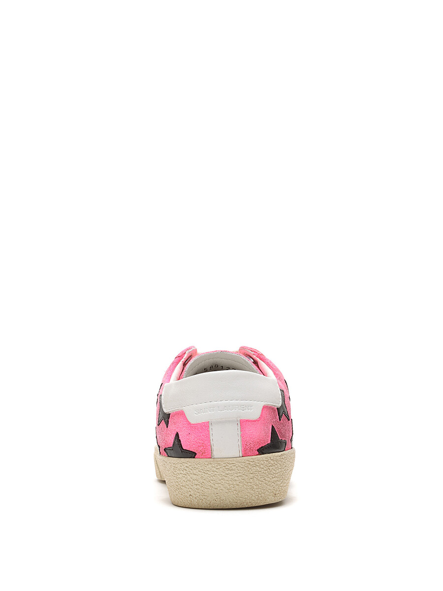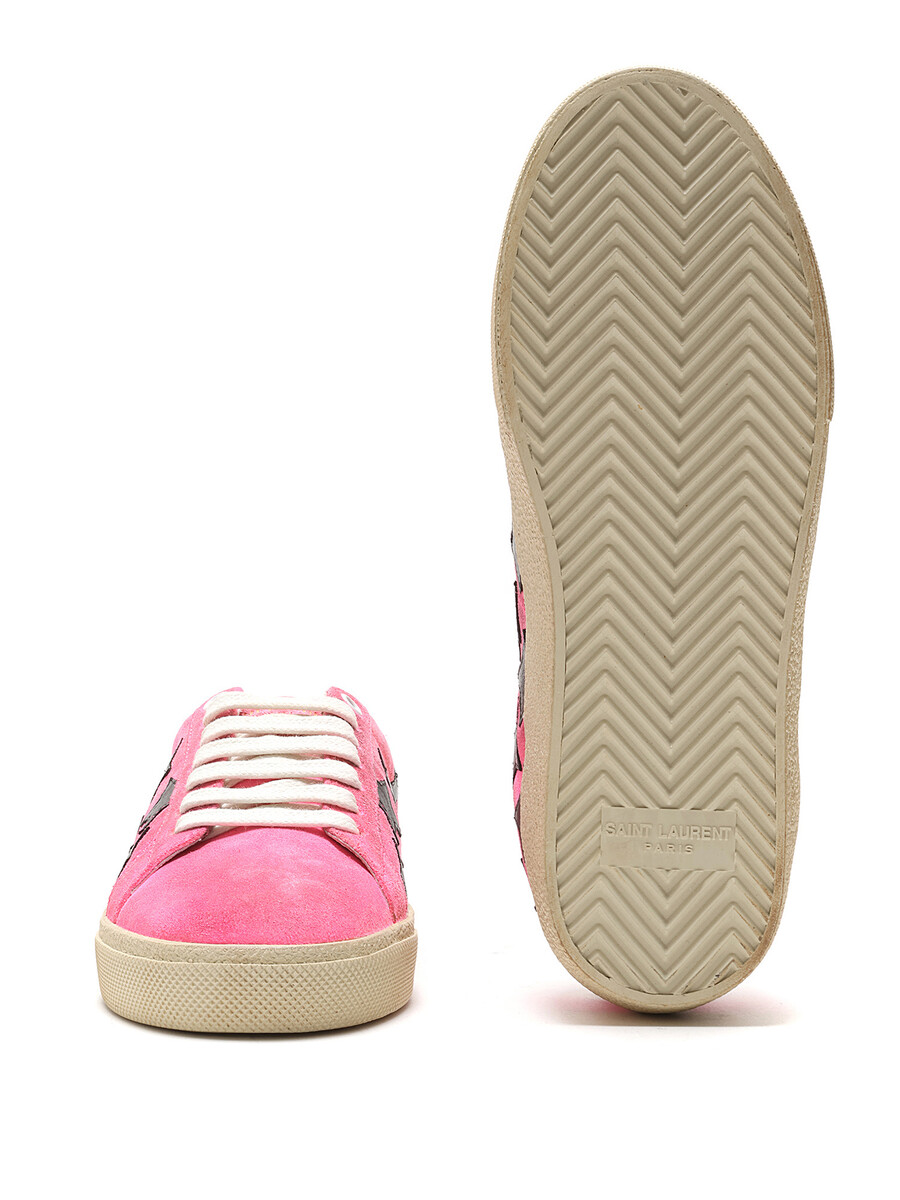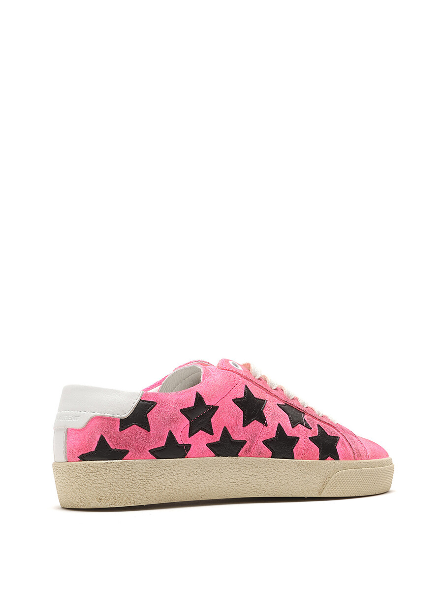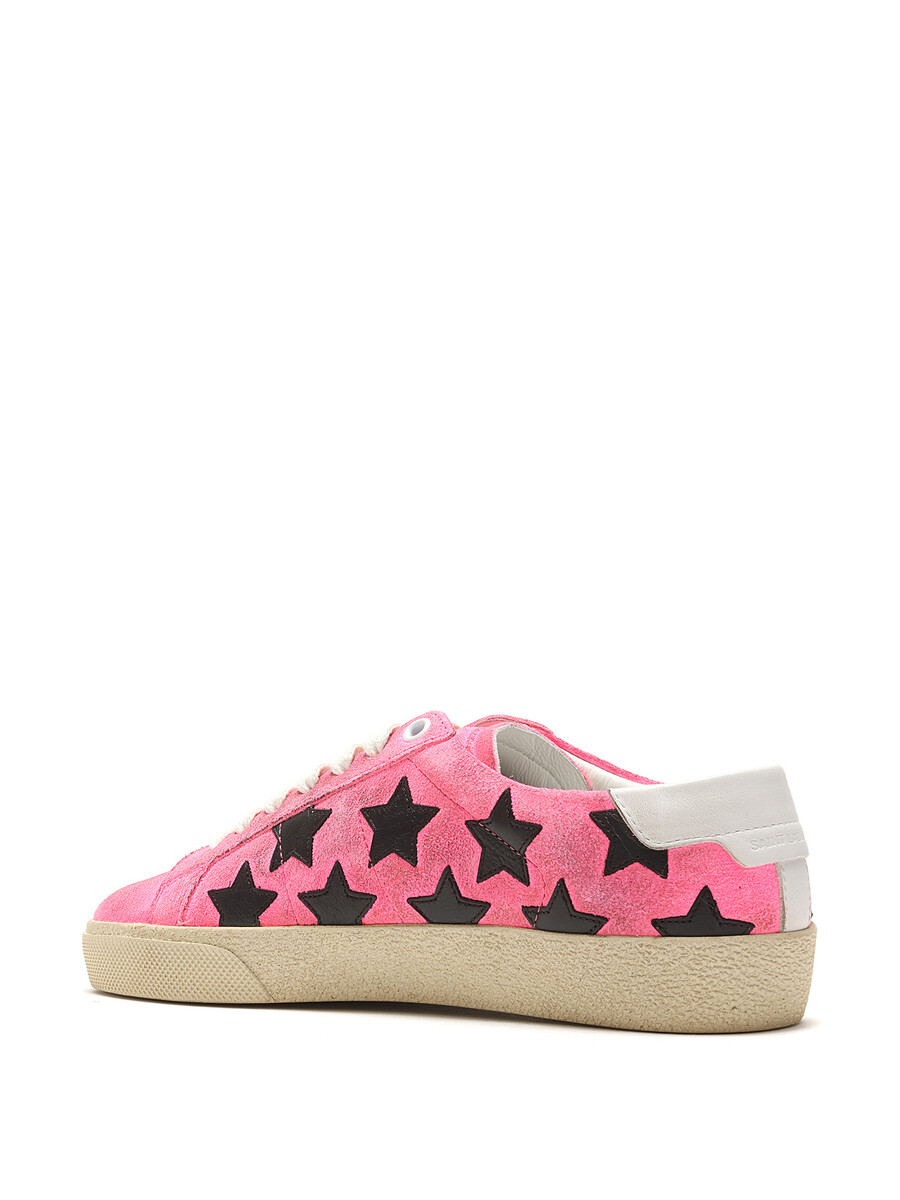 Low-top suede sneakers in a pink and black star pattern. Round toe design with lace-up closure. Textured rubber sole. With box.