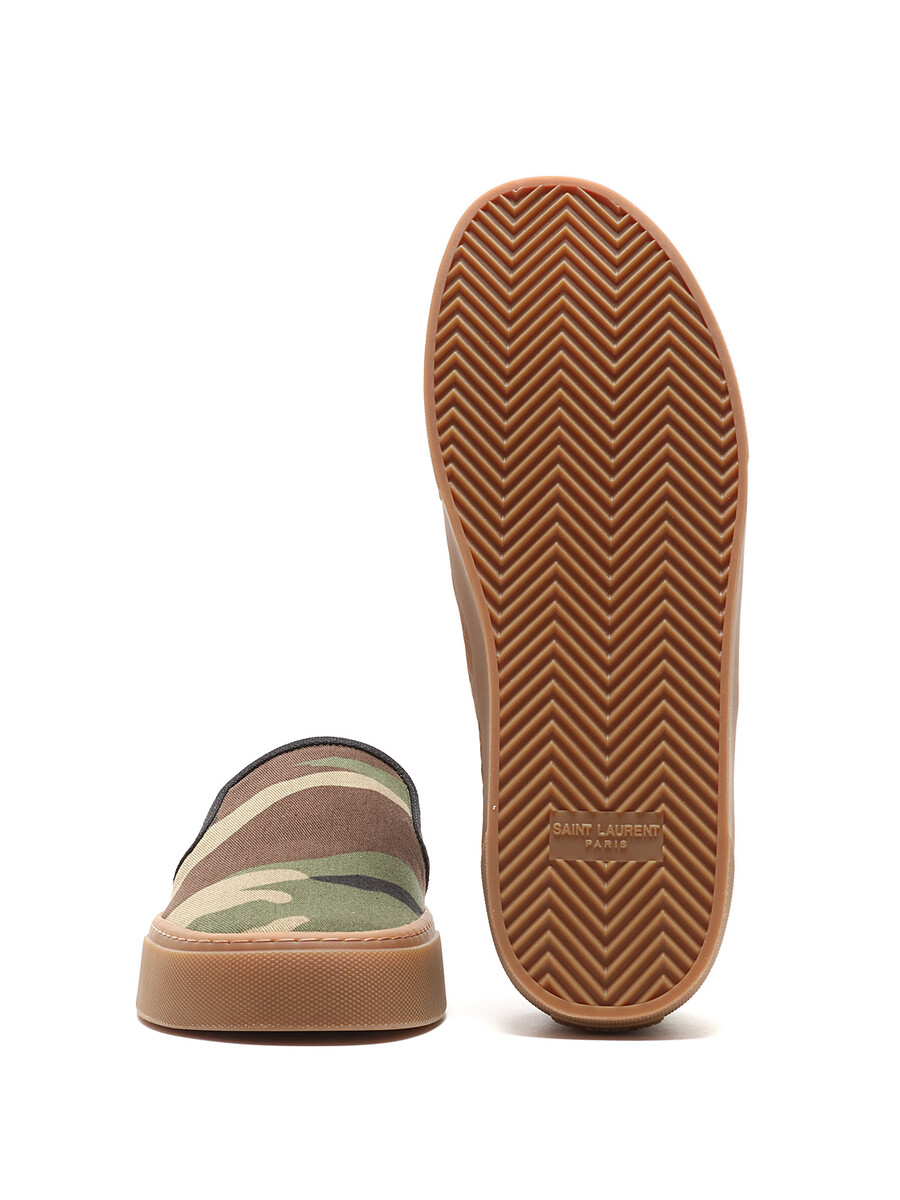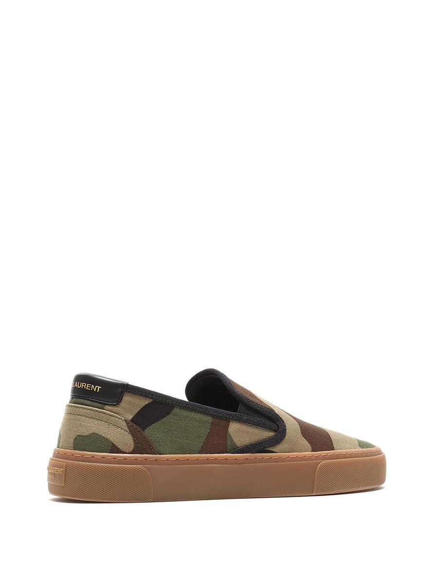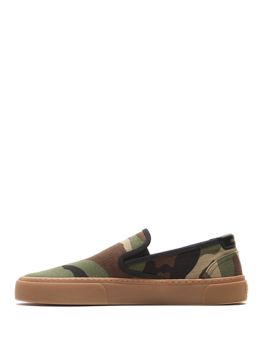 Camouflage green and brown slip-on sneakers in canvas featuring tonal stitching and gum sole. Slip-on closure with elastic side gores. Closed round toe style. Rubber sole.