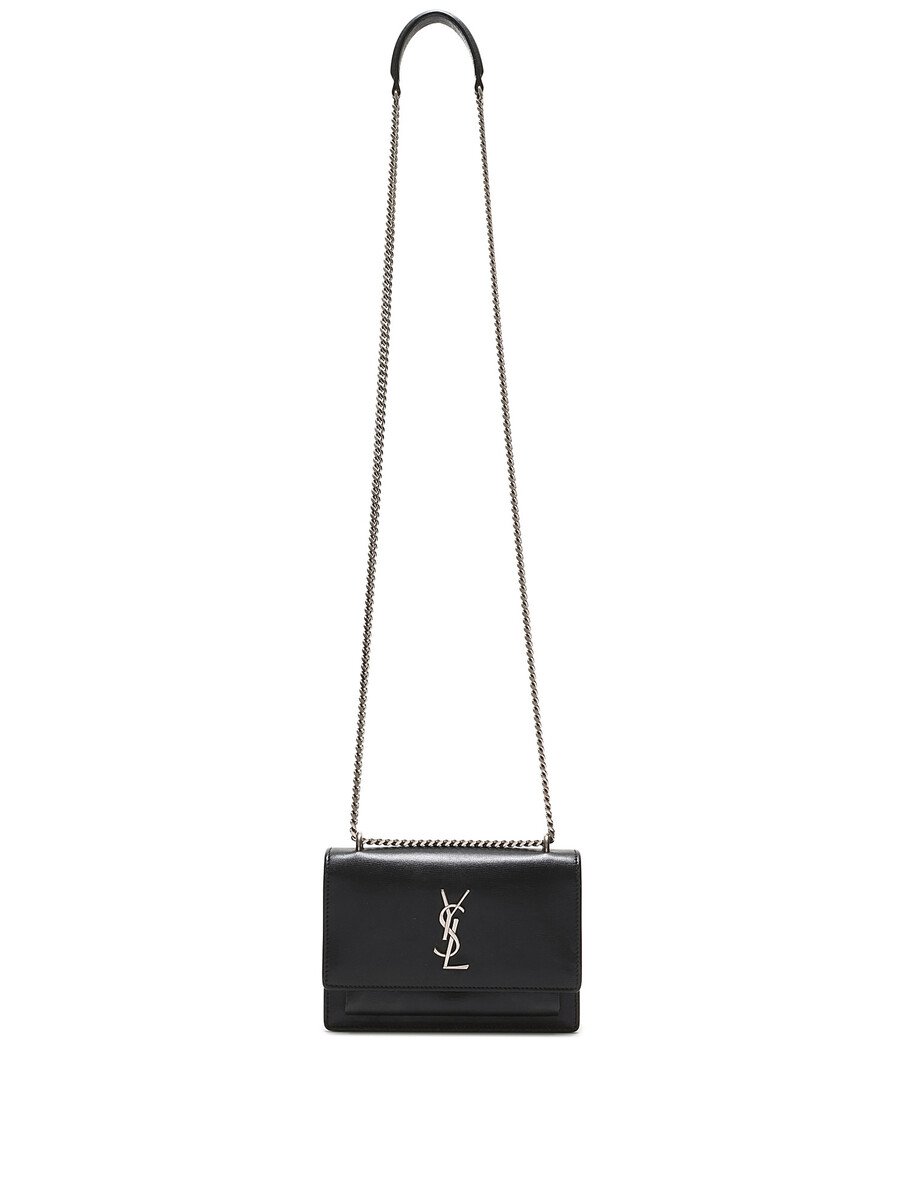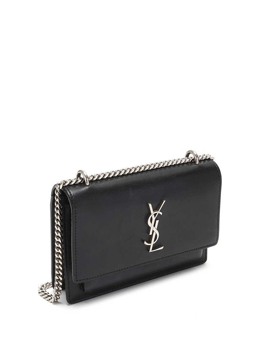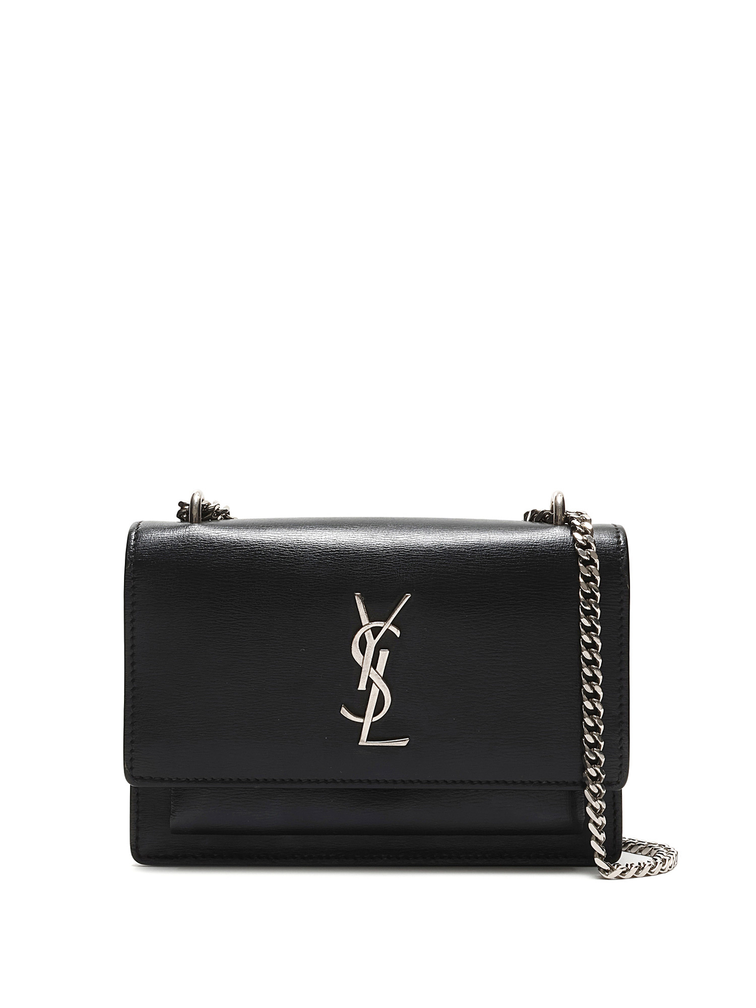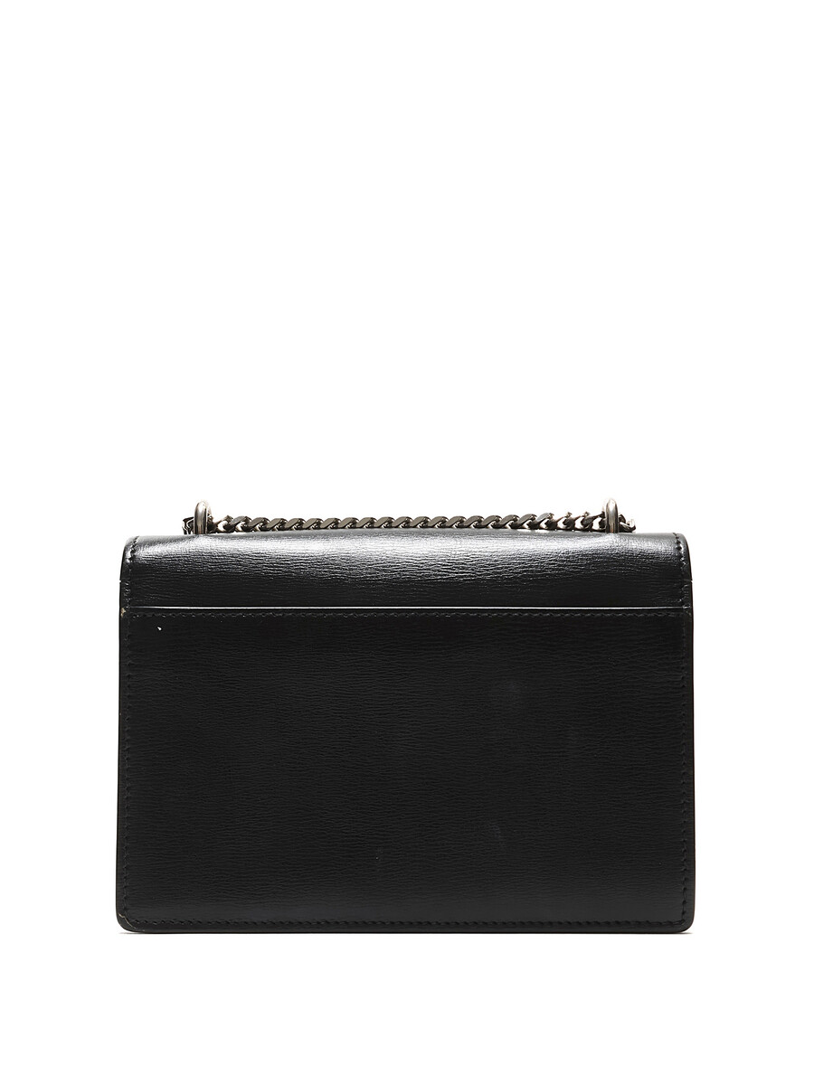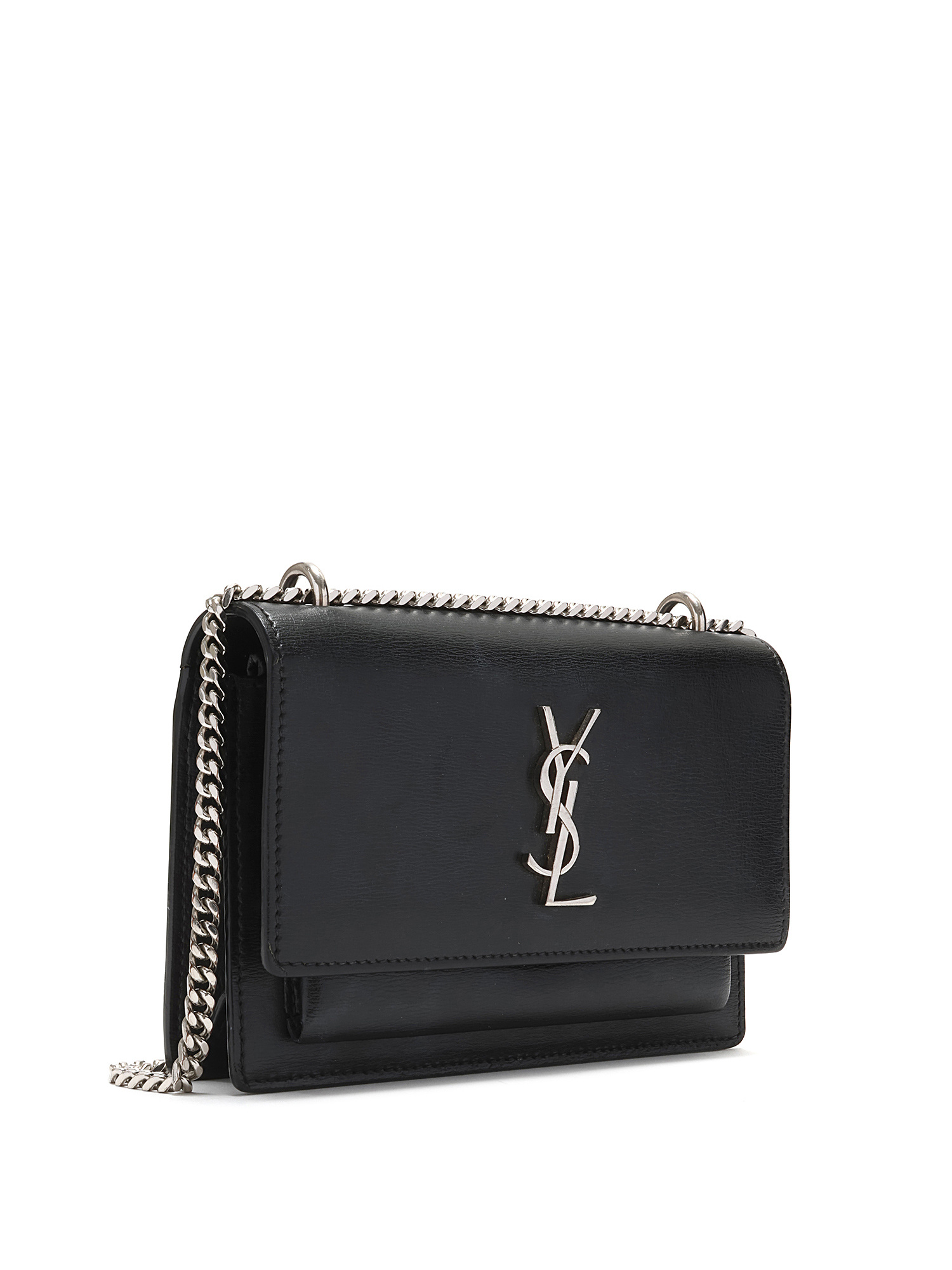 Mini leather shoulder bag in black with Cassandre logo. Magnetic flap closure. Silver-tone chain strap with leather shoulder pad.