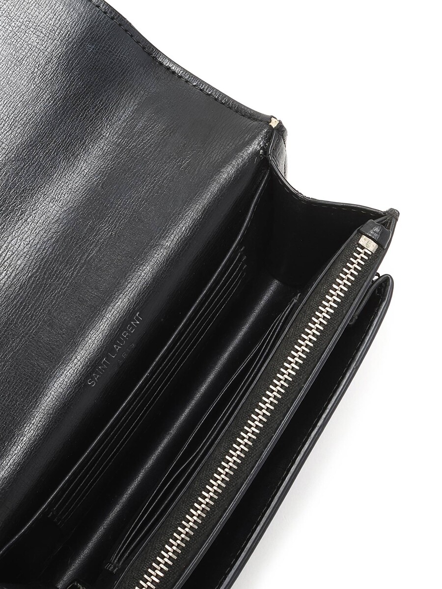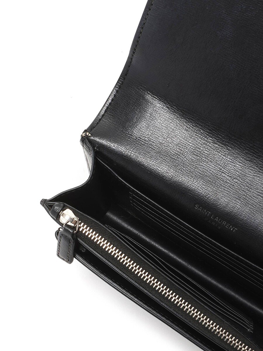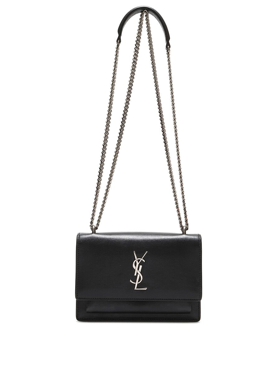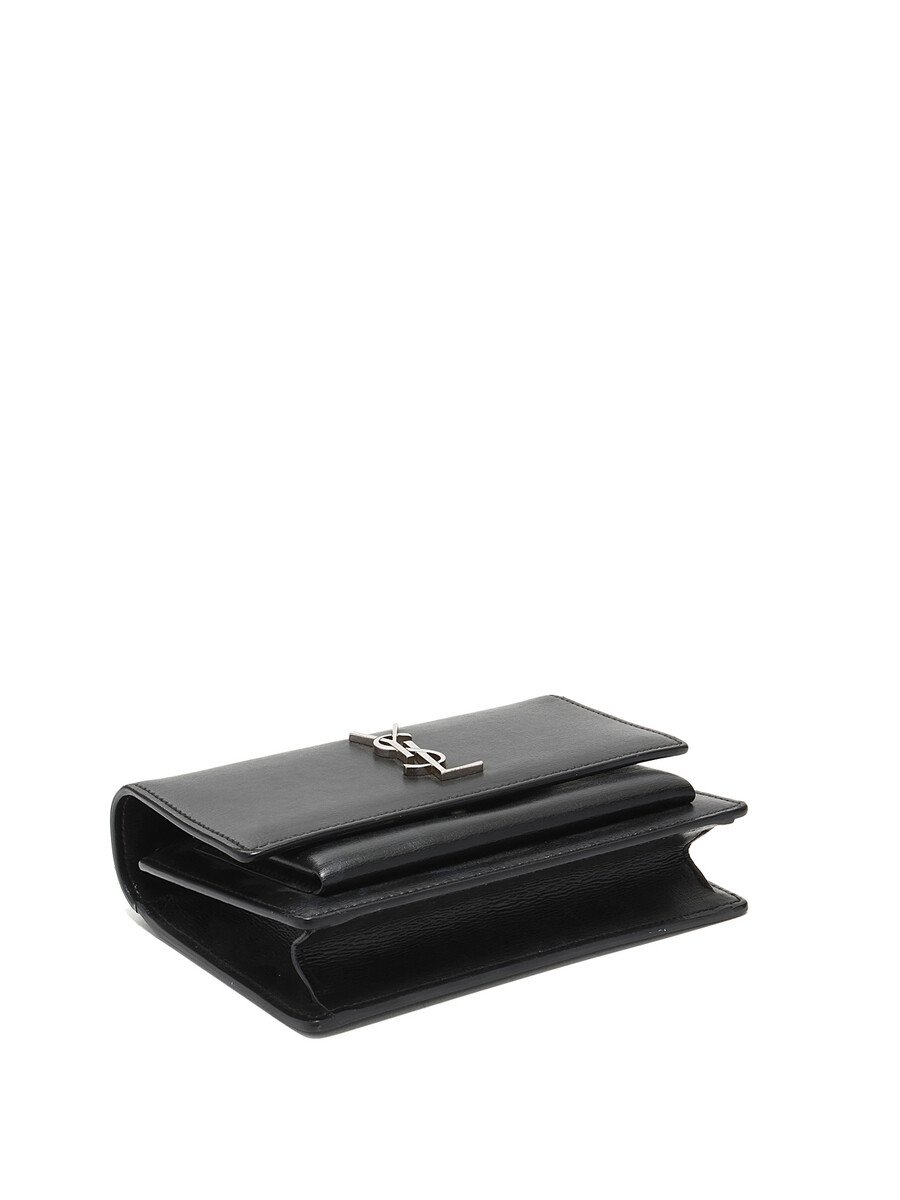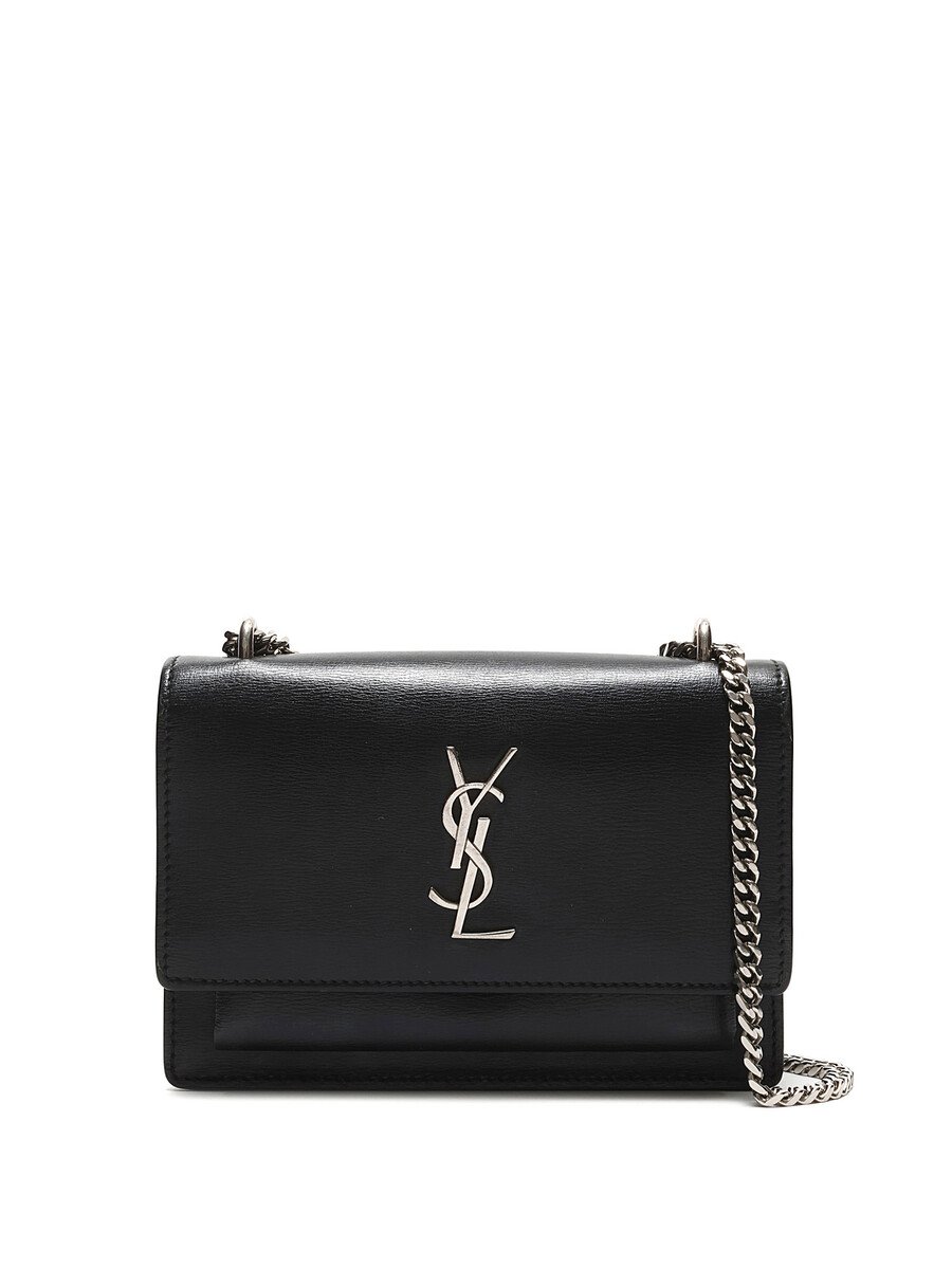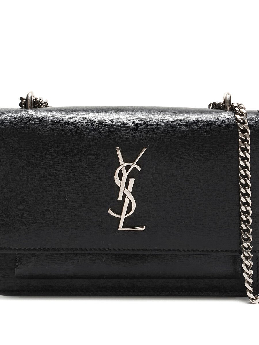 Mini leather shoulder bag in black with Cassandre logo. Magnetic flap closure. Silver-tone chain strap with leather shoulder pad.