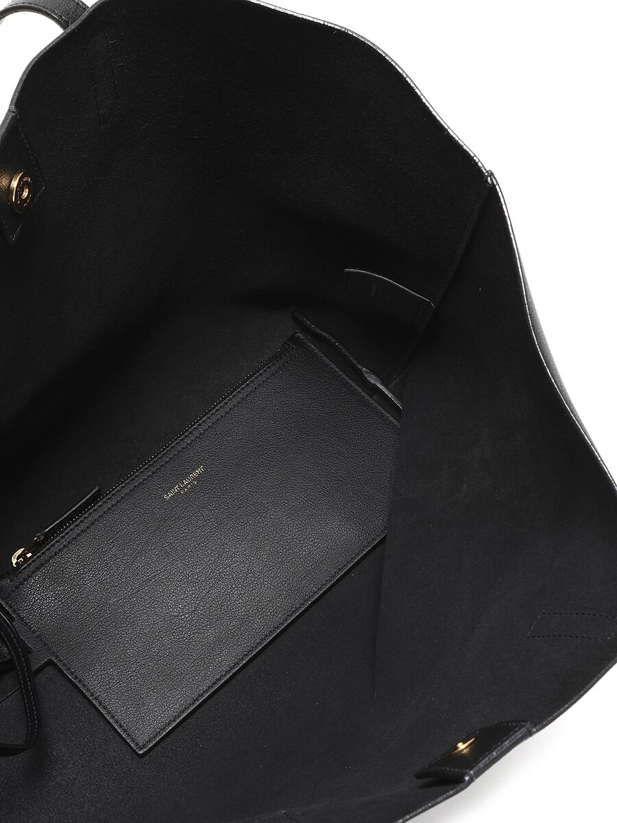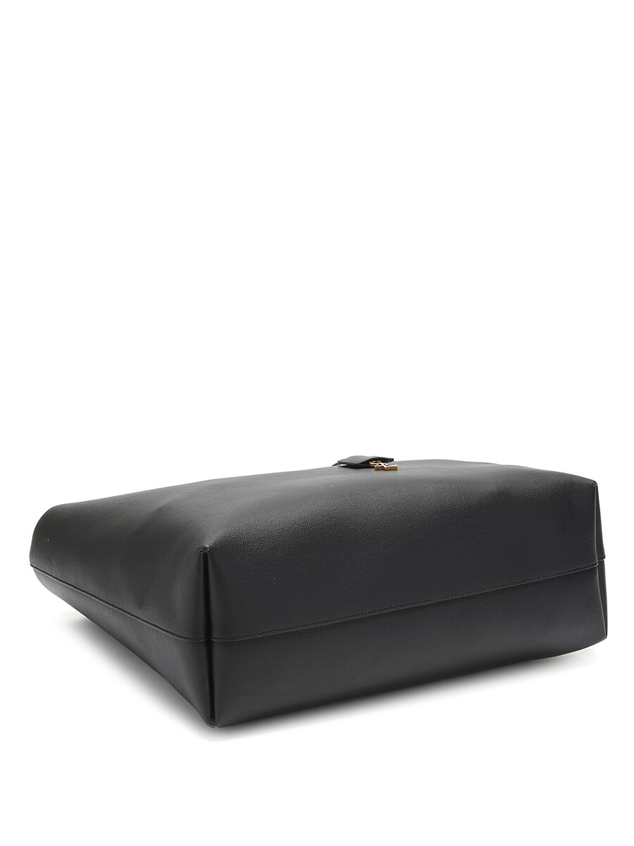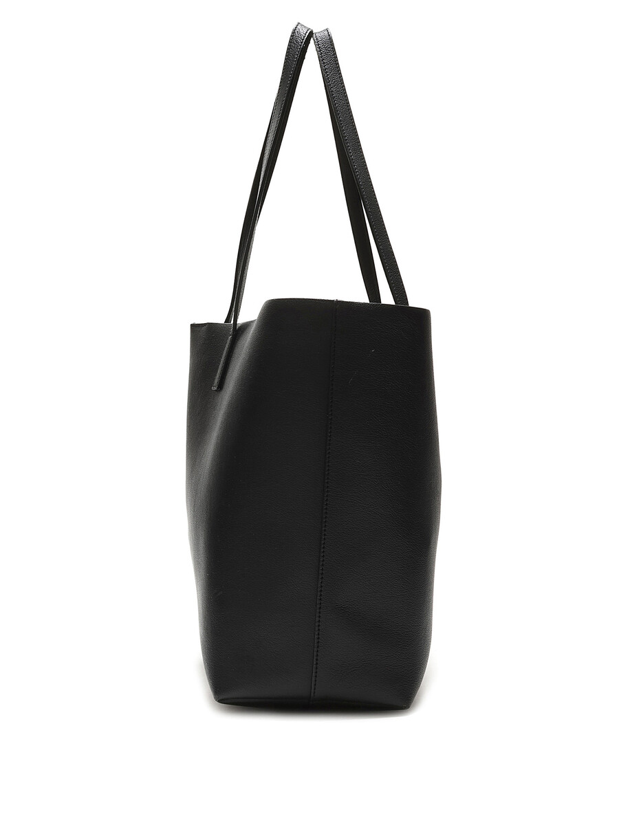 Black grained leather tote bag with flat leather handles and tonal stitching. Spacious interior.
