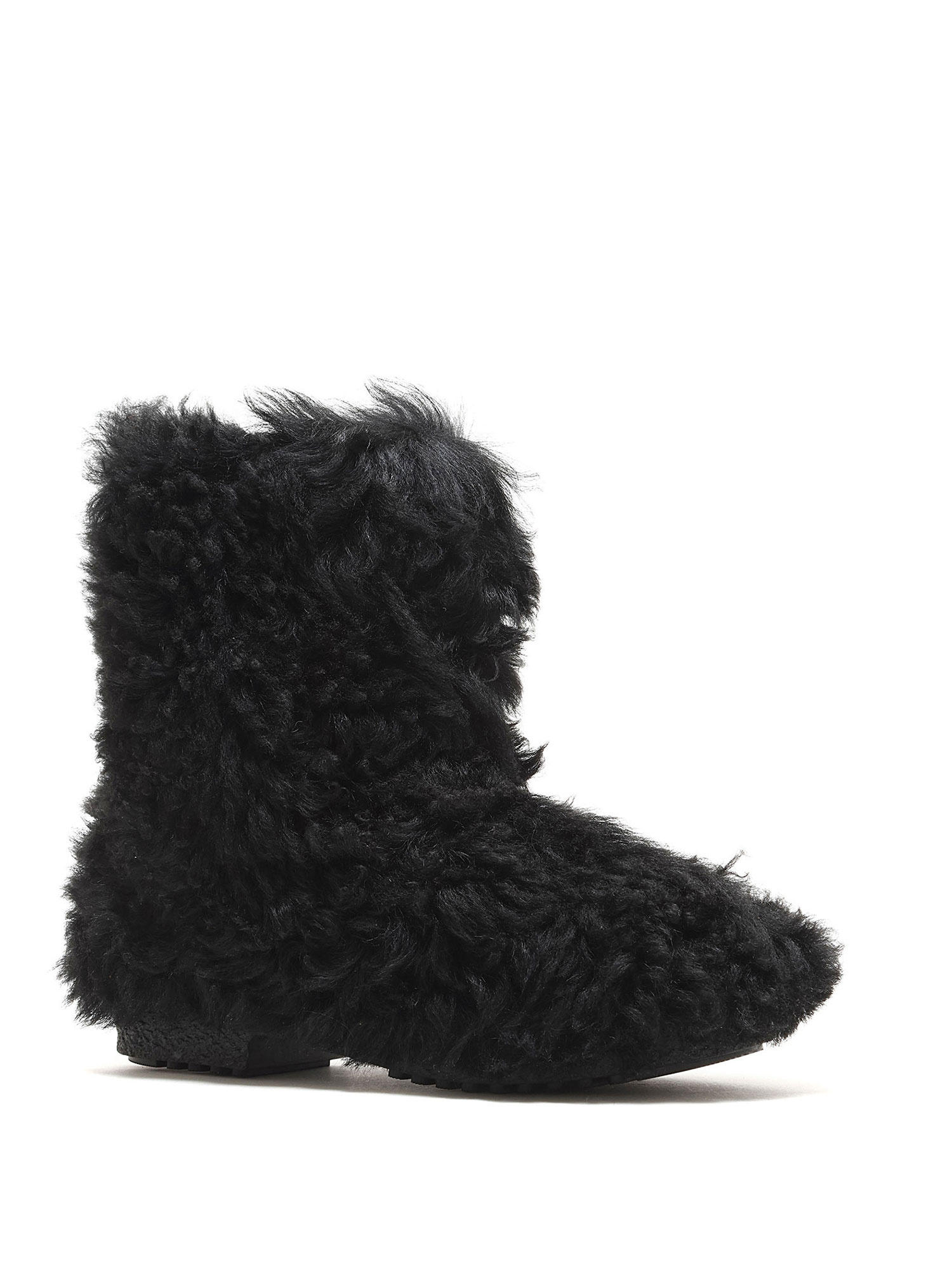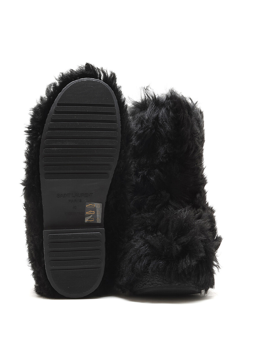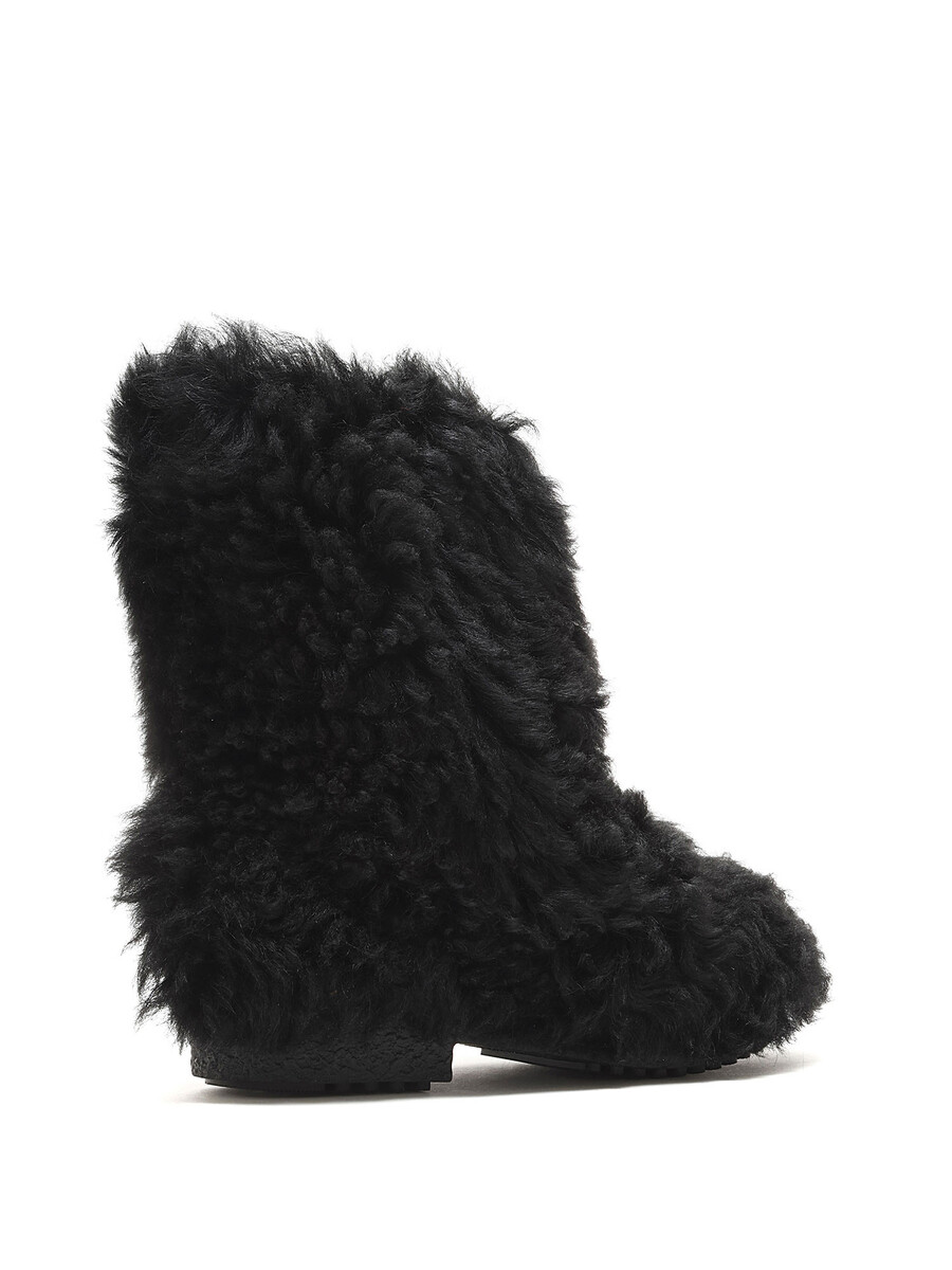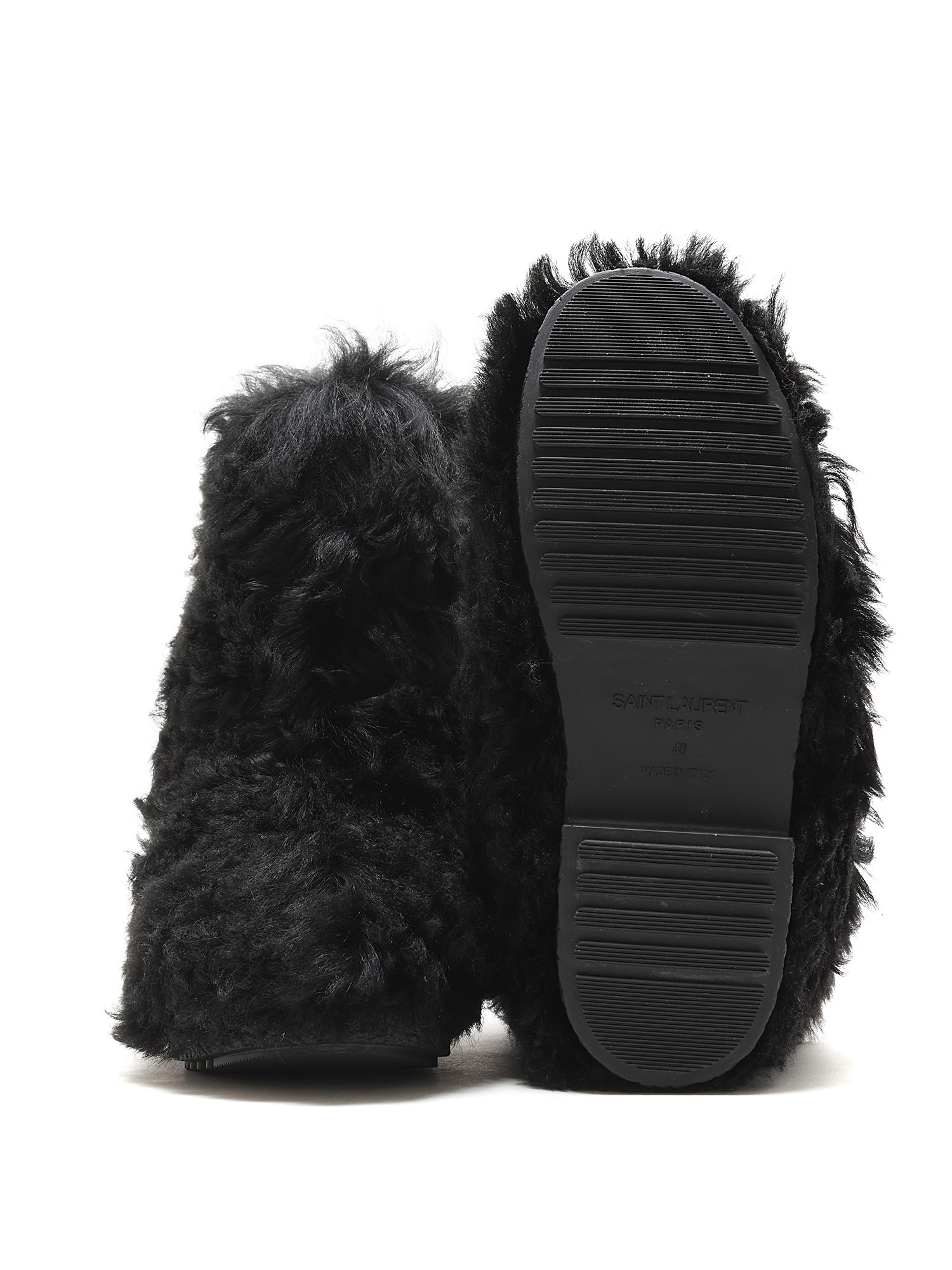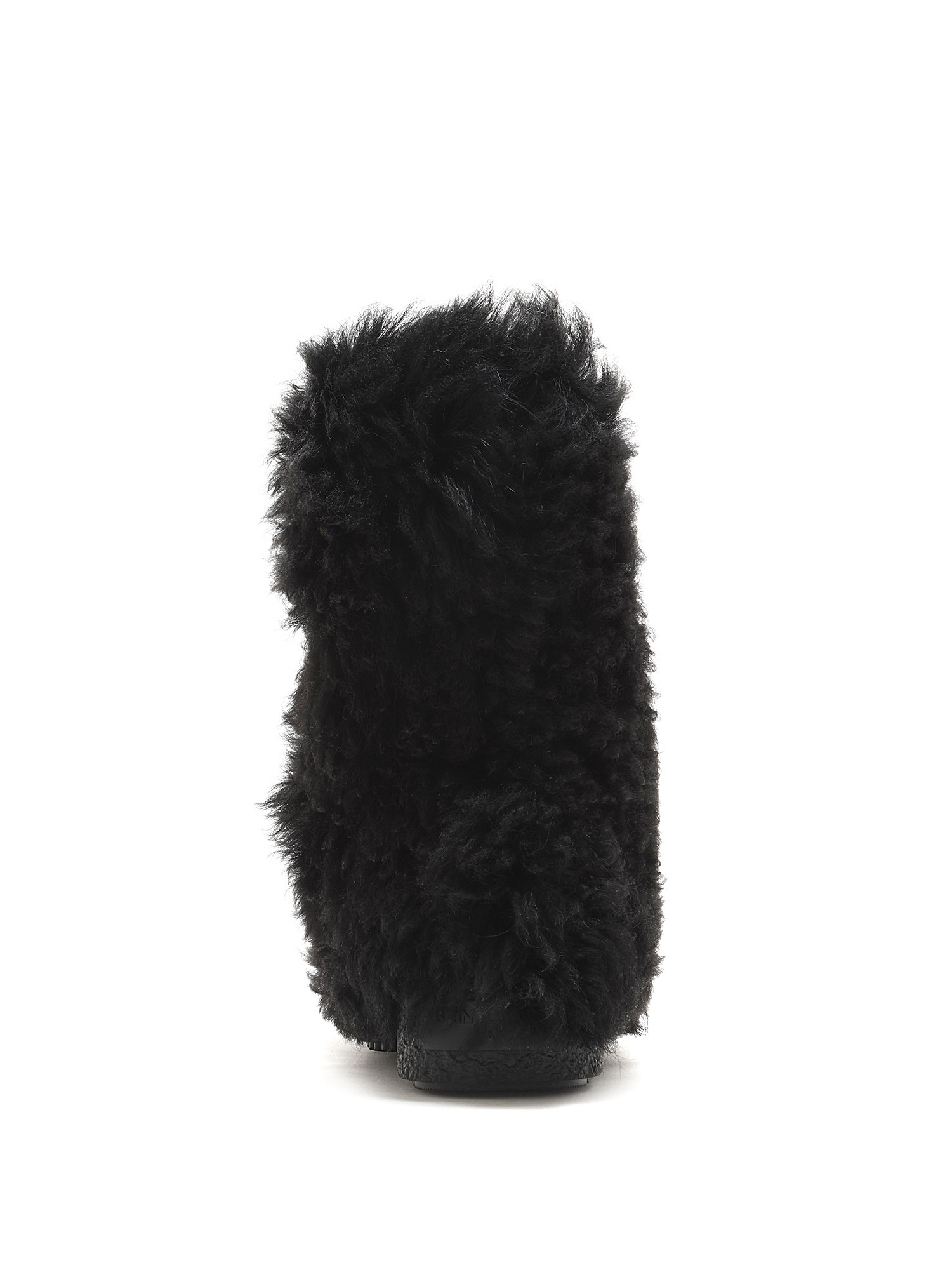Black suede ankle boots featuring slip-on style with round toe. Furry lambskin upper. Rubber sole.