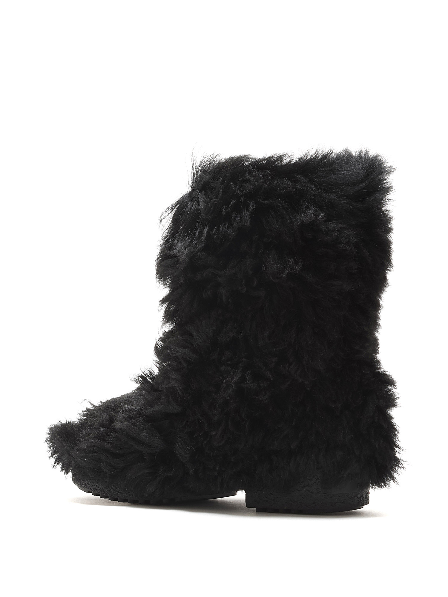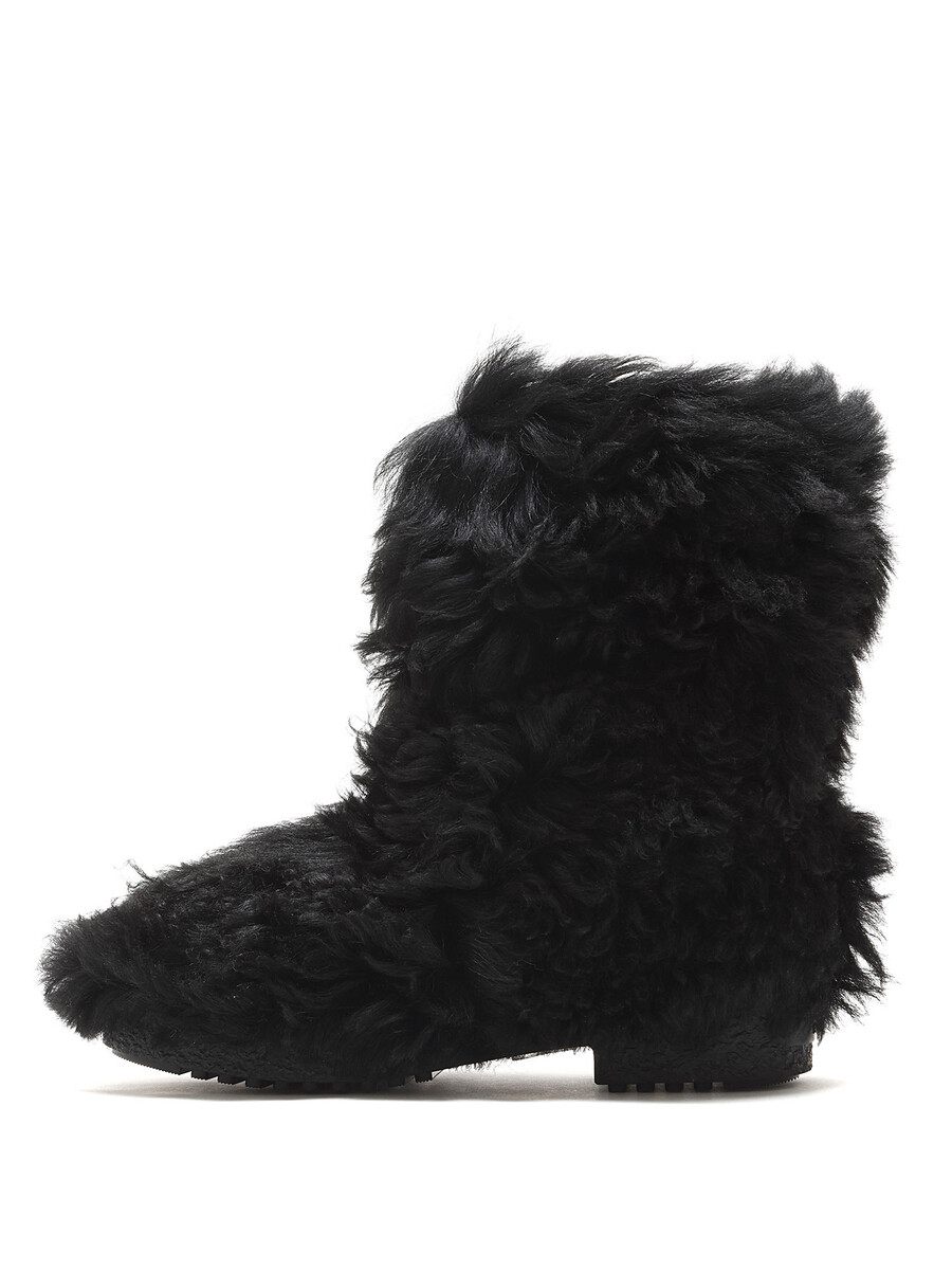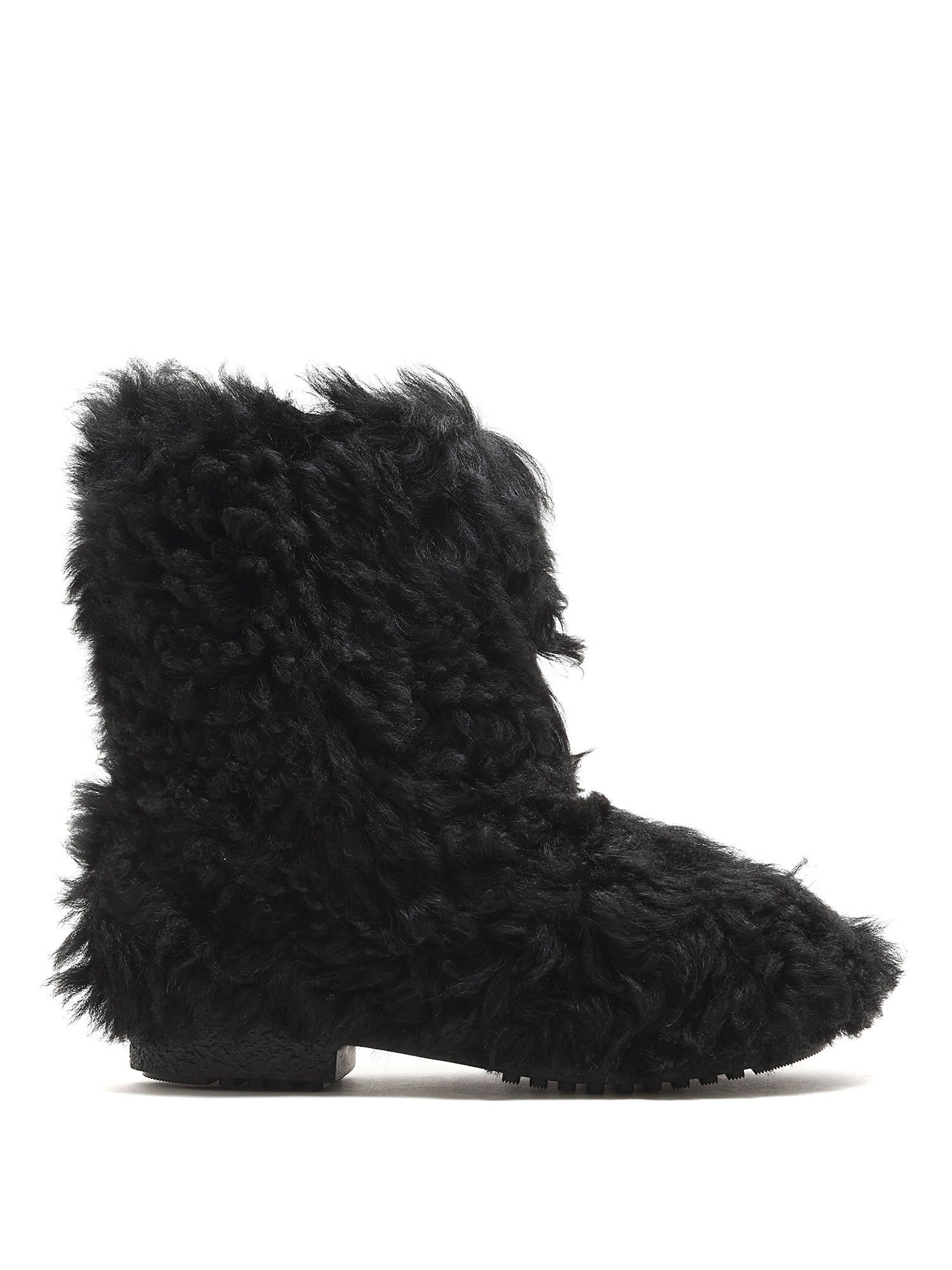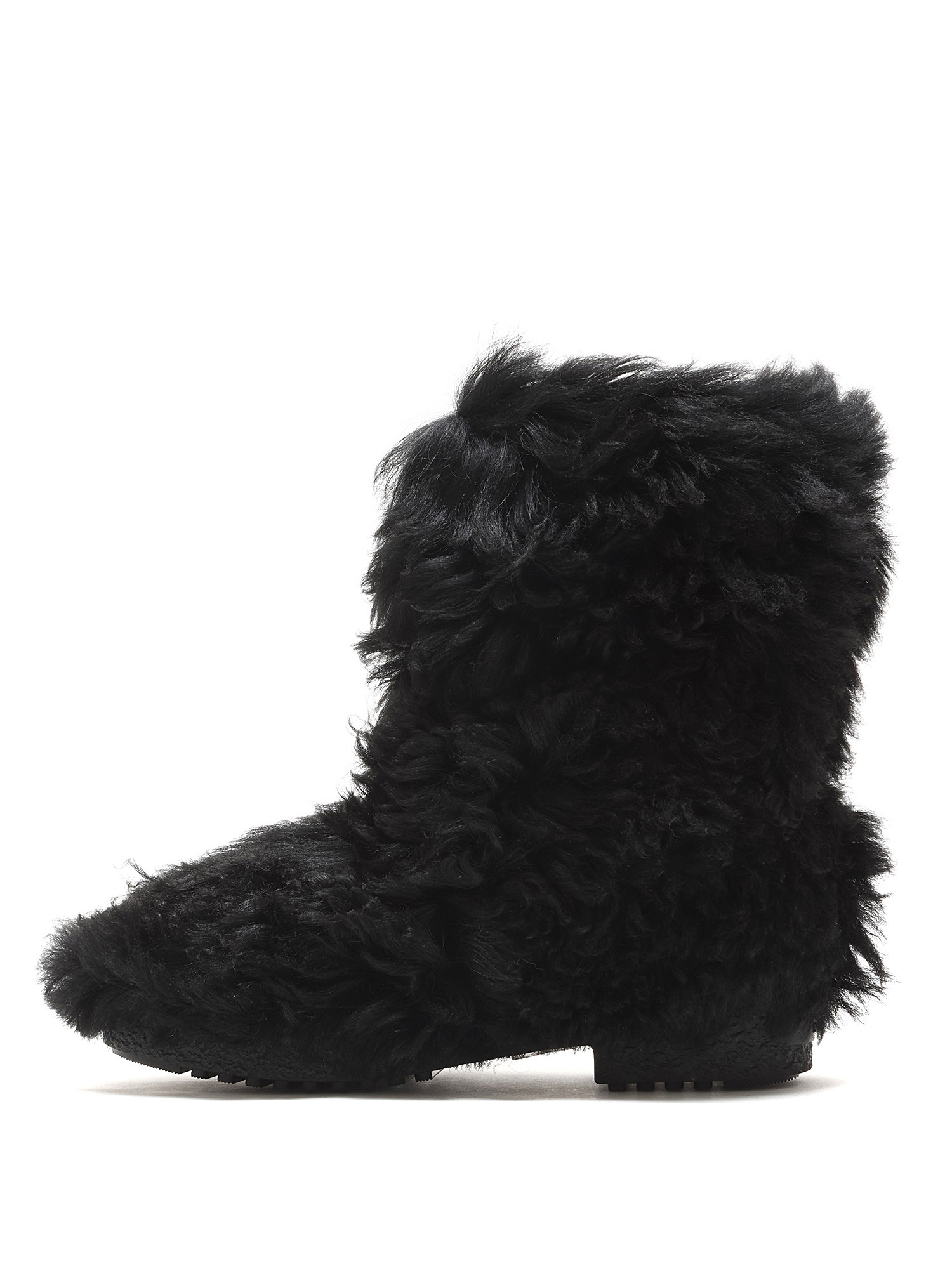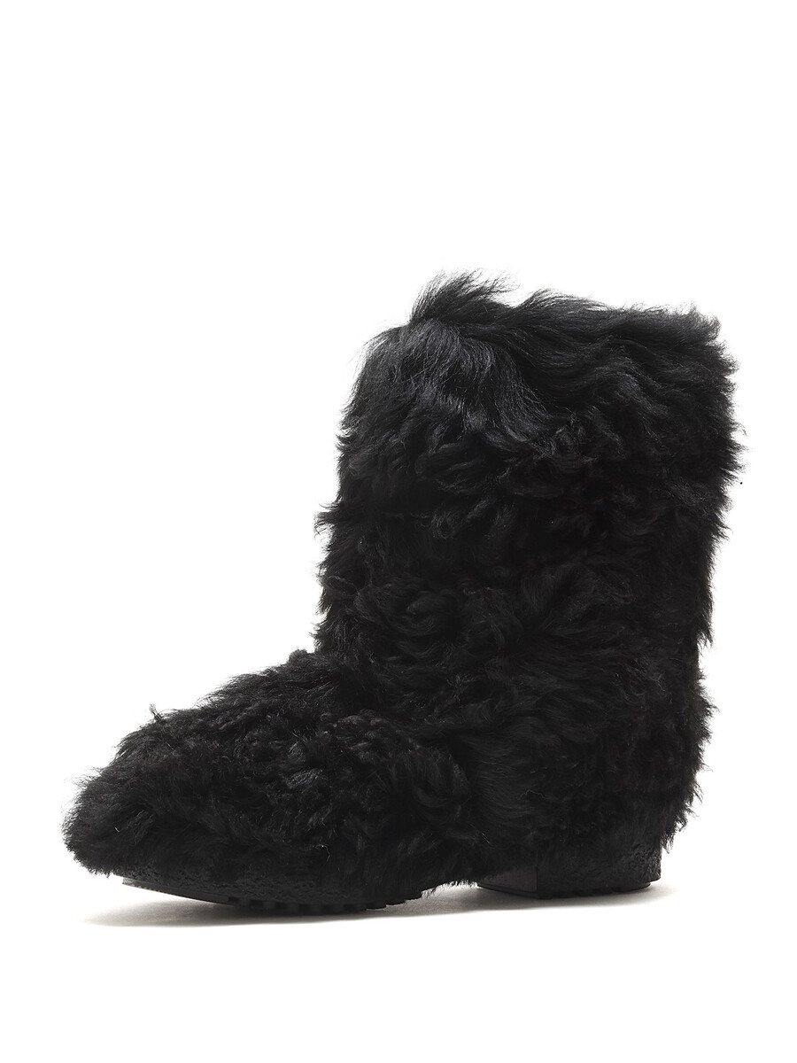 Black suede ankle boots featuring slip-on style with round toe. Furry lambskin upper. Rubber sole.