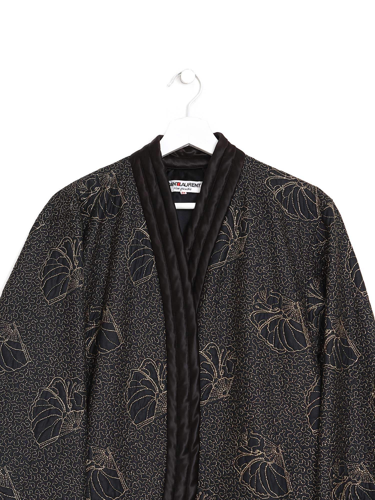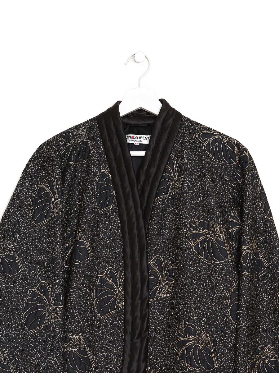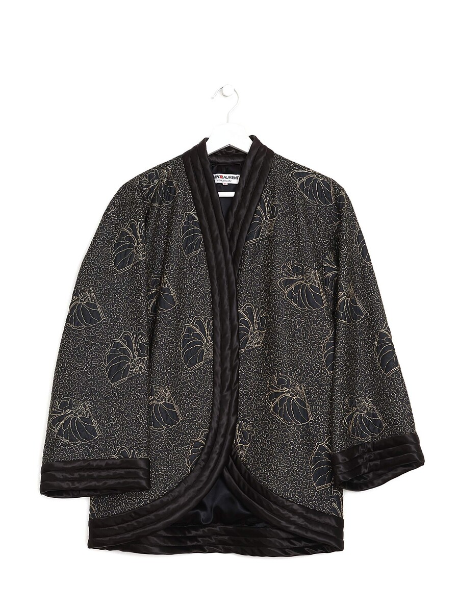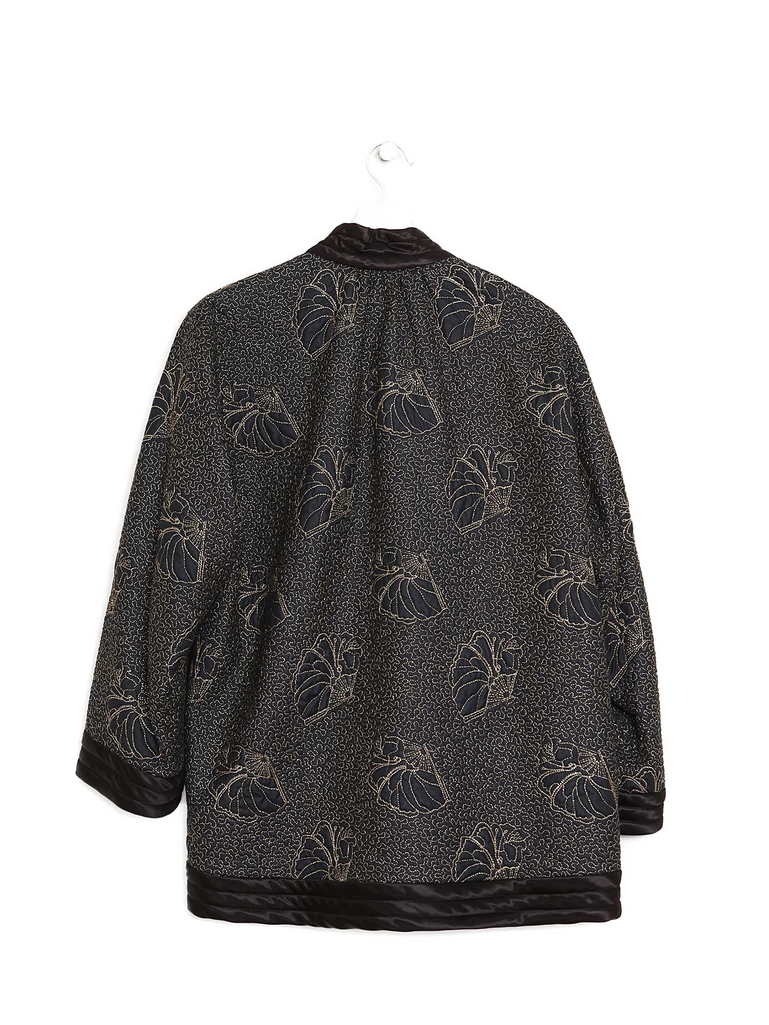 Long sleeve black satin kimono jacket with intricate gold seashell embroidery and quilted texture.
