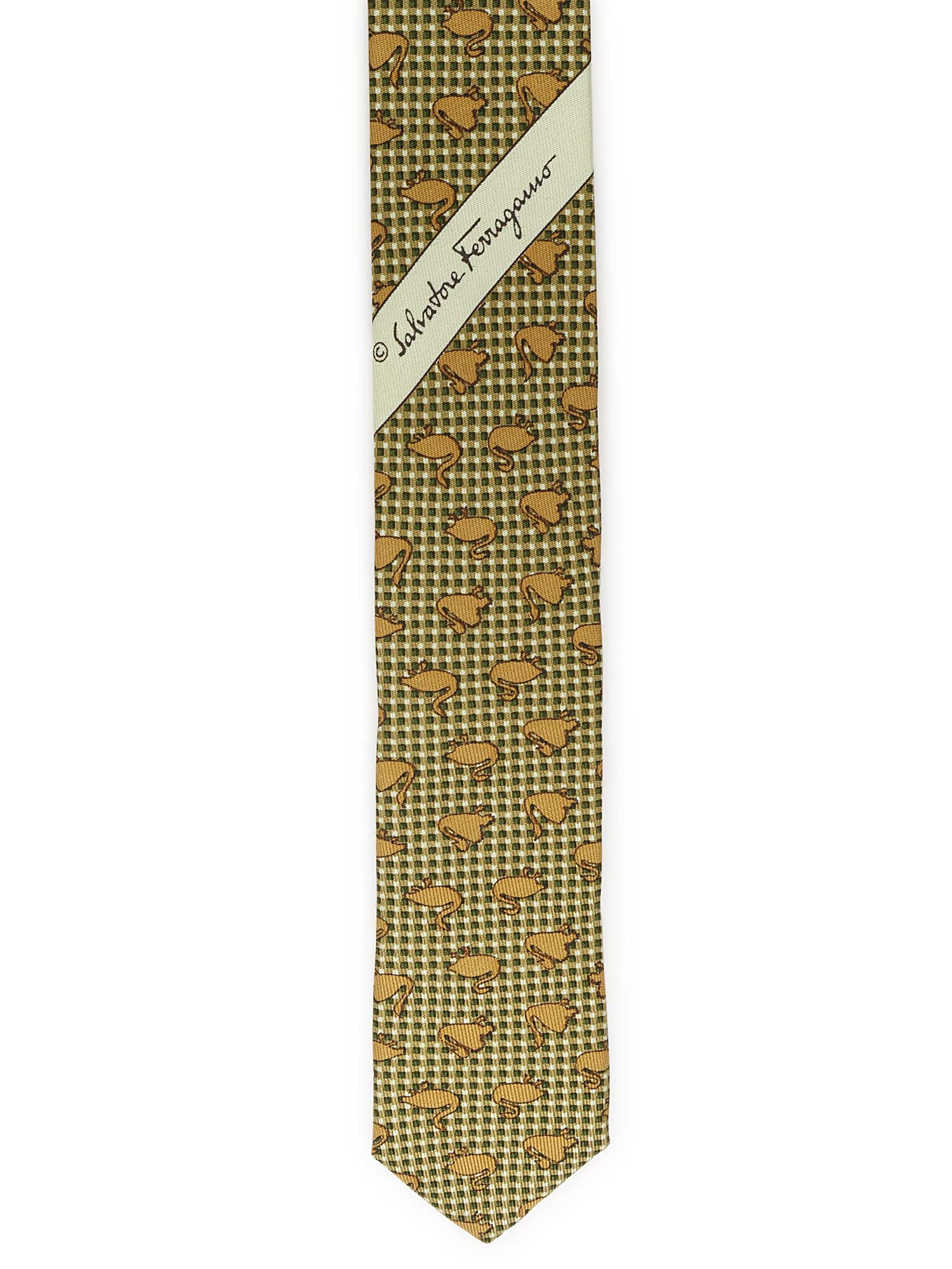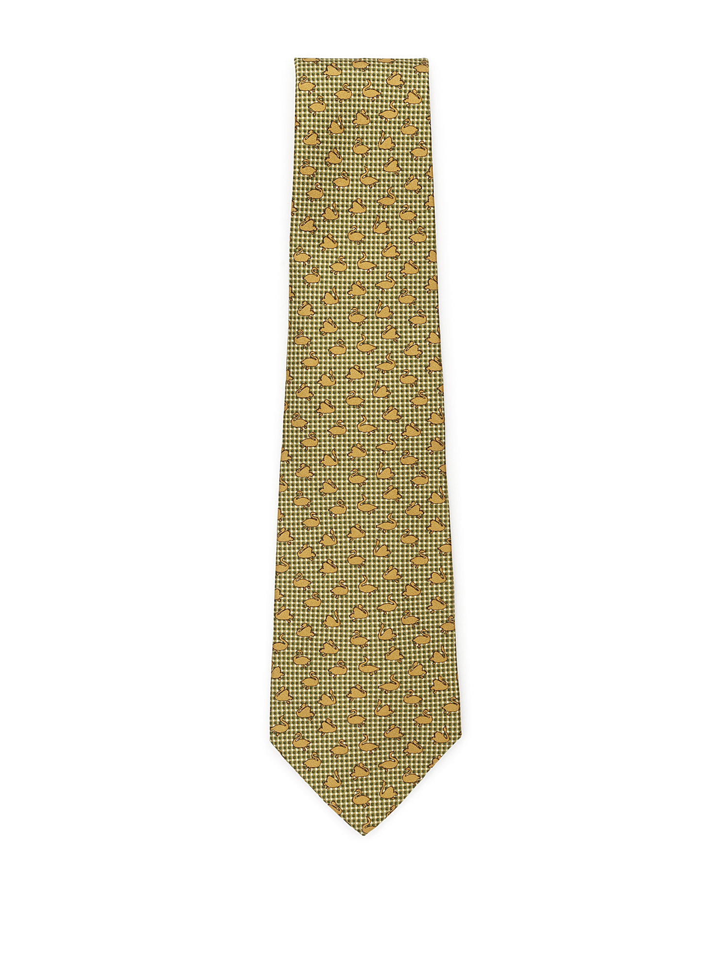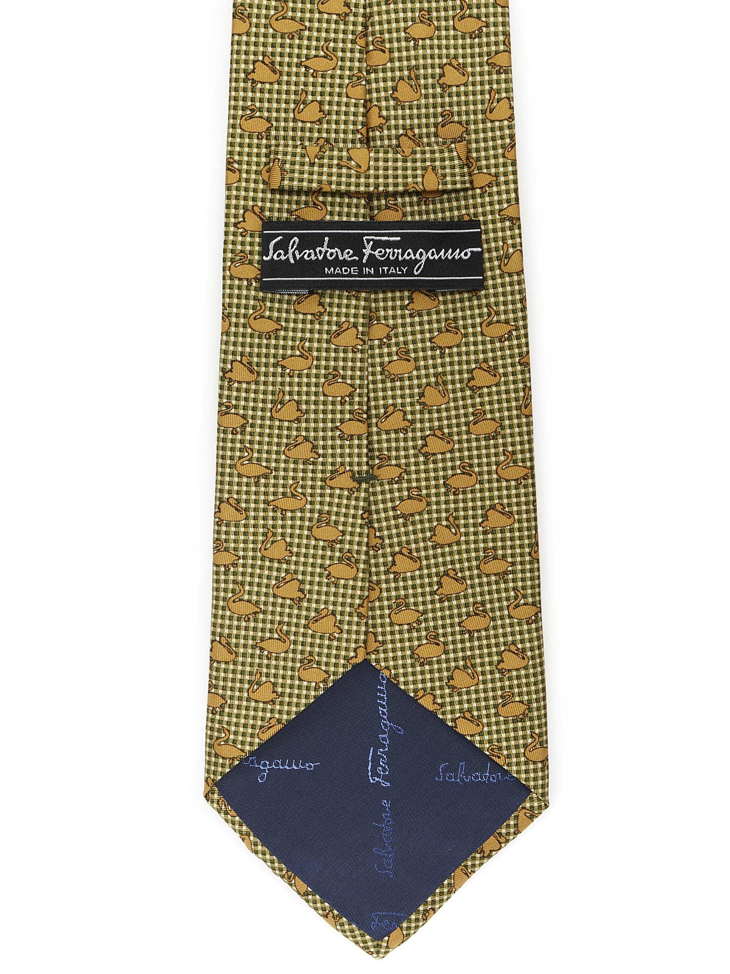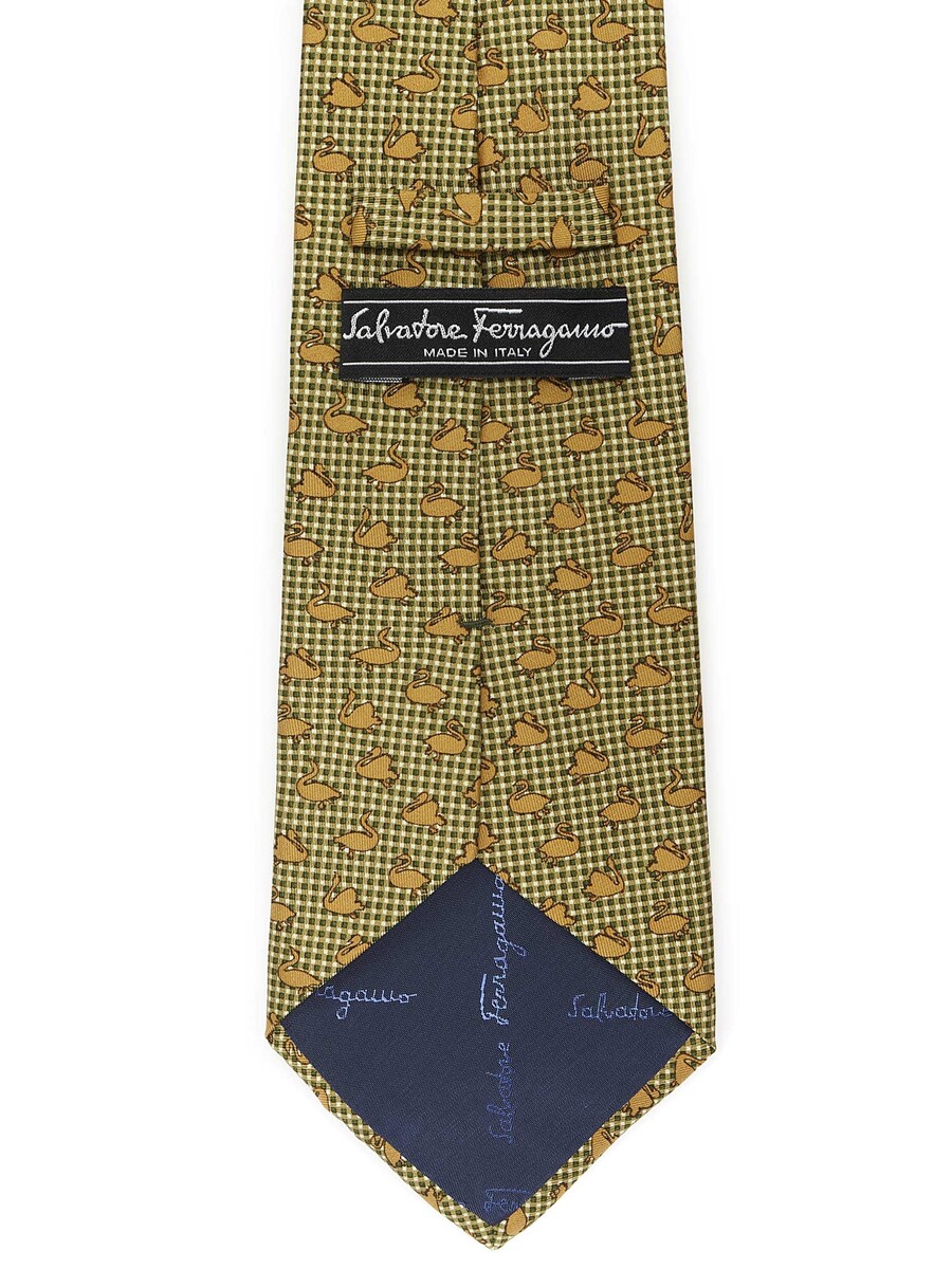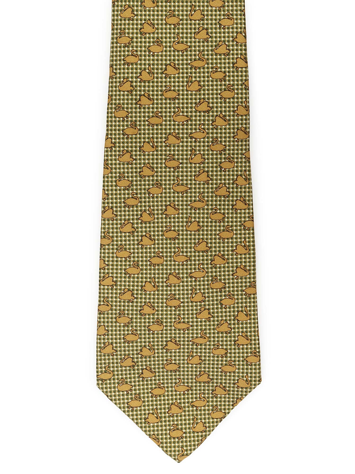 Vibrant green and yellow checkered silk tie featuring swan print.