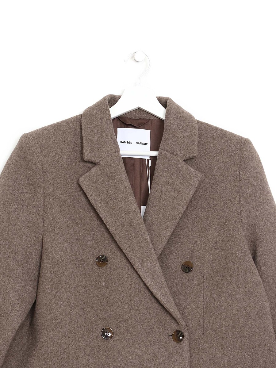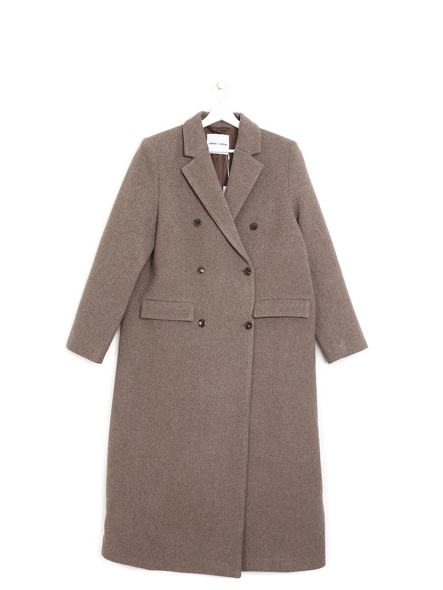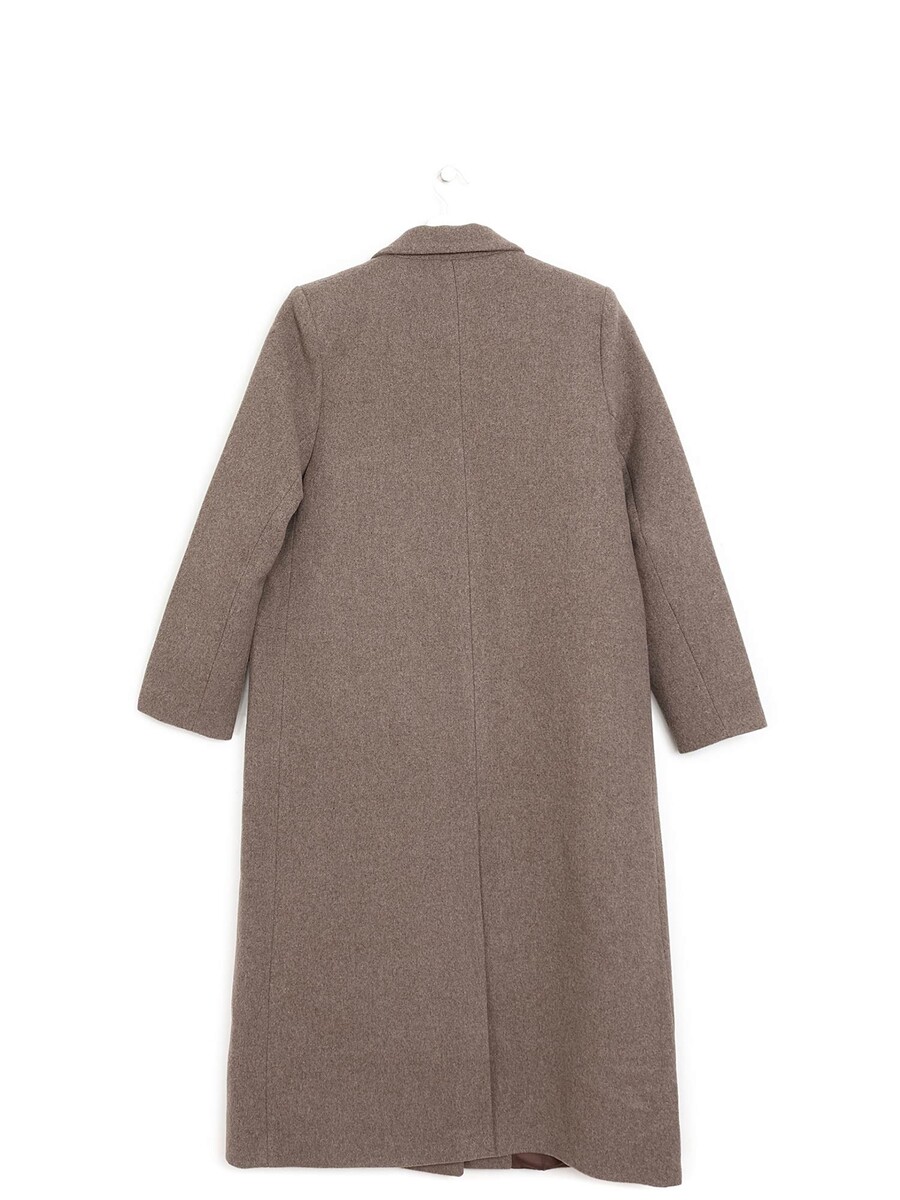 Long wool coat in brown. Classic tailoring with notched lapels and button closure. Side pockets. Fully lined.