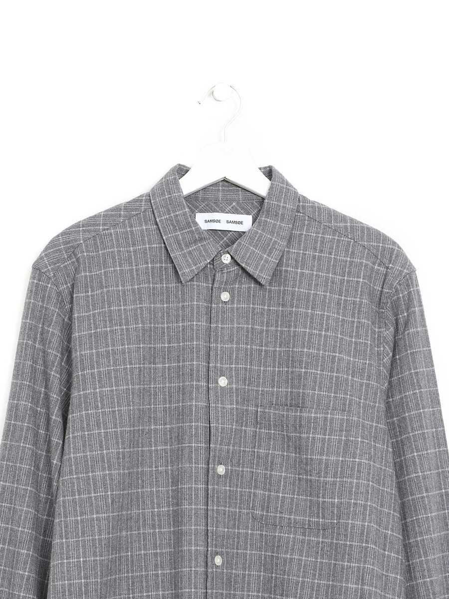 Long sleeve flannel shirt in grey. Classic button-down design. Chest patch pocket.
