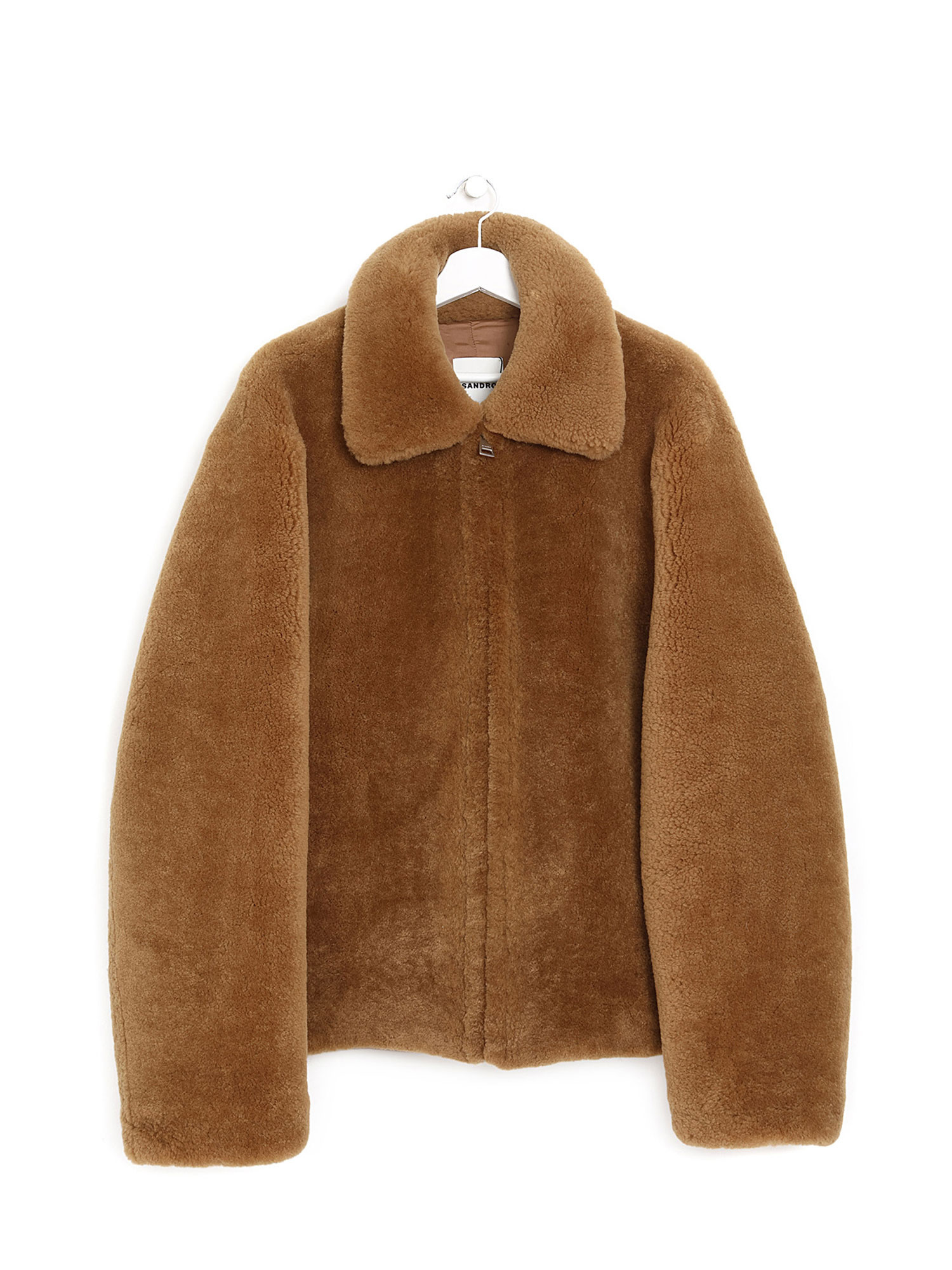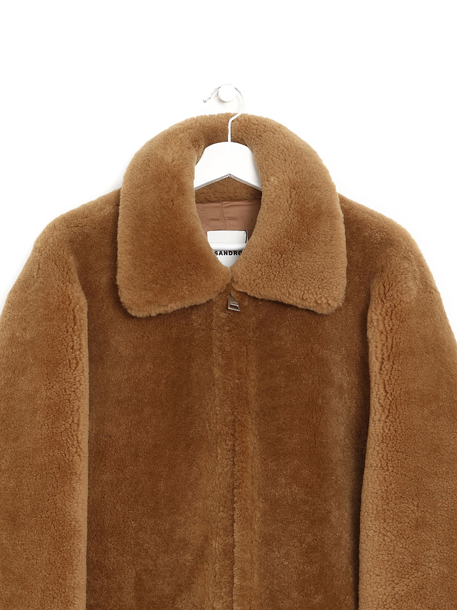 Zip jacket in brown sheepskin. Zip front closure. Classic collar. Two front pockets.