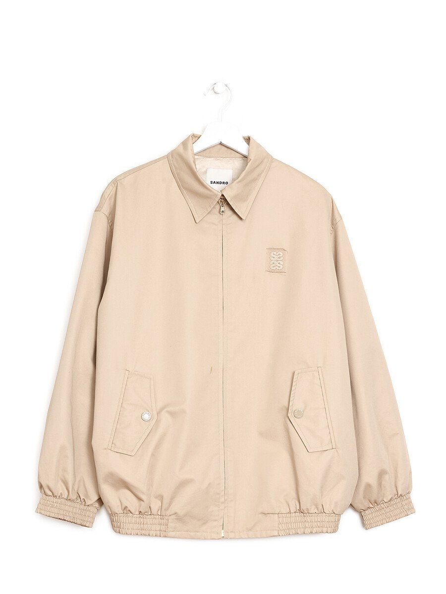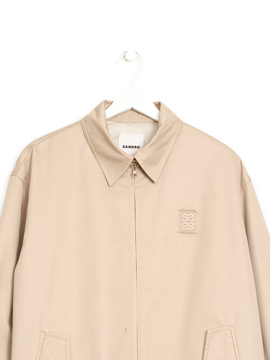Long sleeve beige cotton jacket with zipper closure. Classic collar and two front pockets. Slight signs of wear with scratches on hardware.