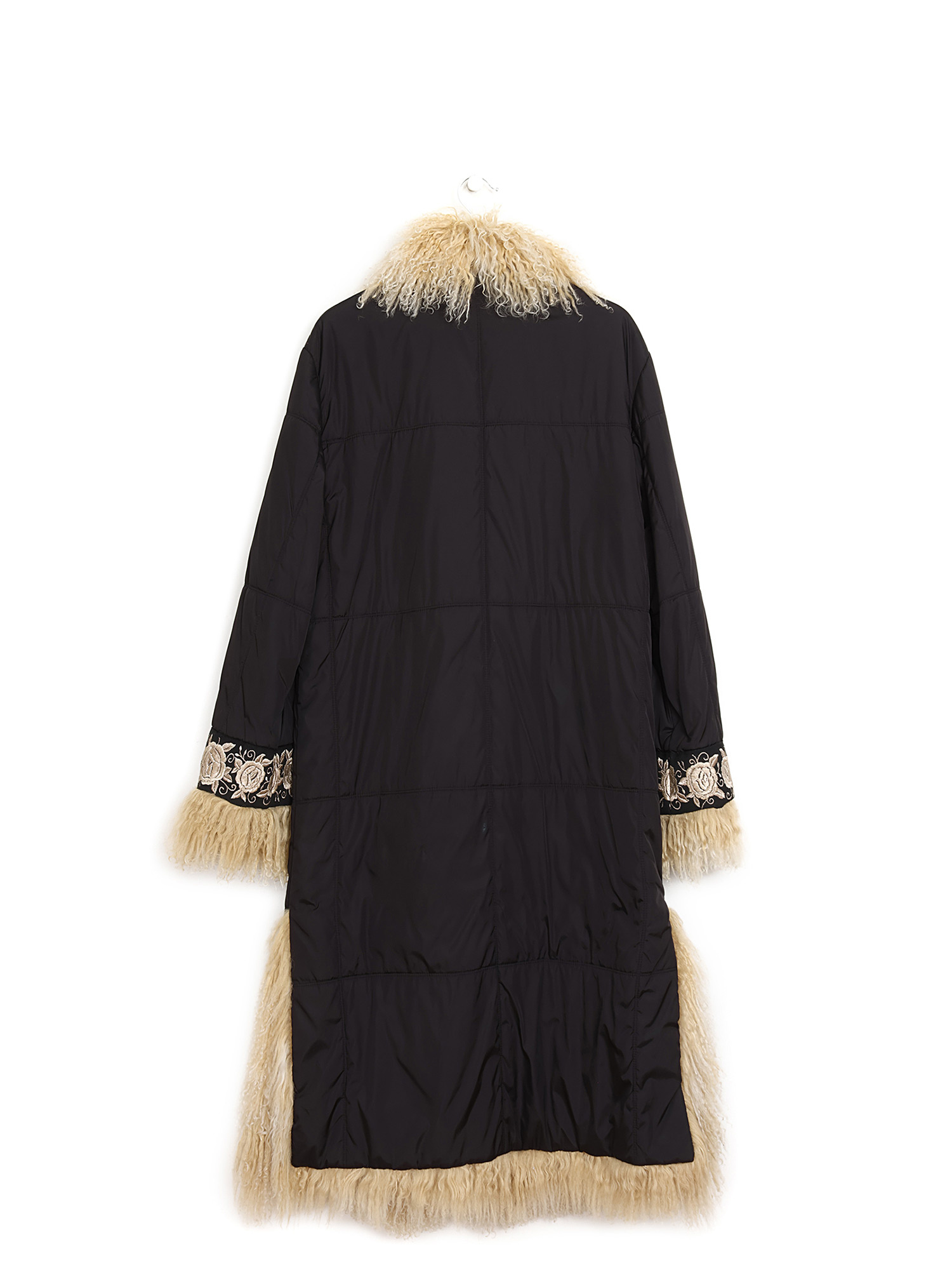 Long coat in black featuring Mongolian fur trim throughout. Button closure with embroidery detail at cuffs, offering a touch of elegance.