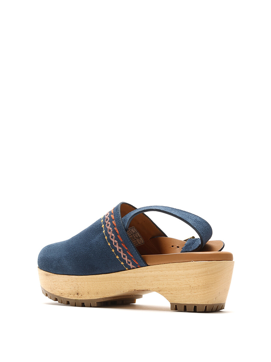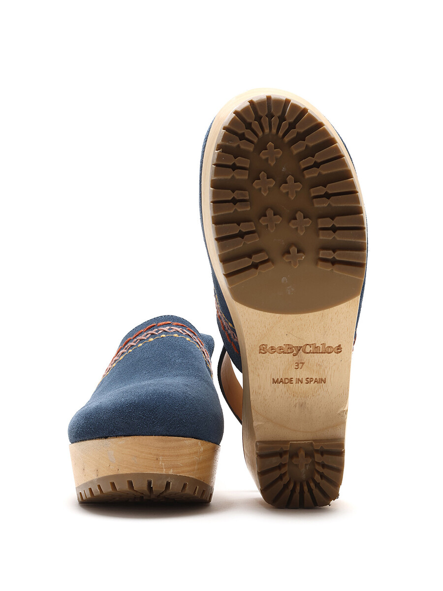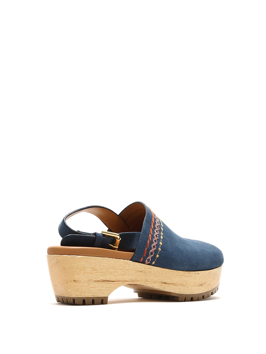 Embroidered suede clogs in blue. Closed round toe. Buckle fastening. Chunky treaded rubber sole.