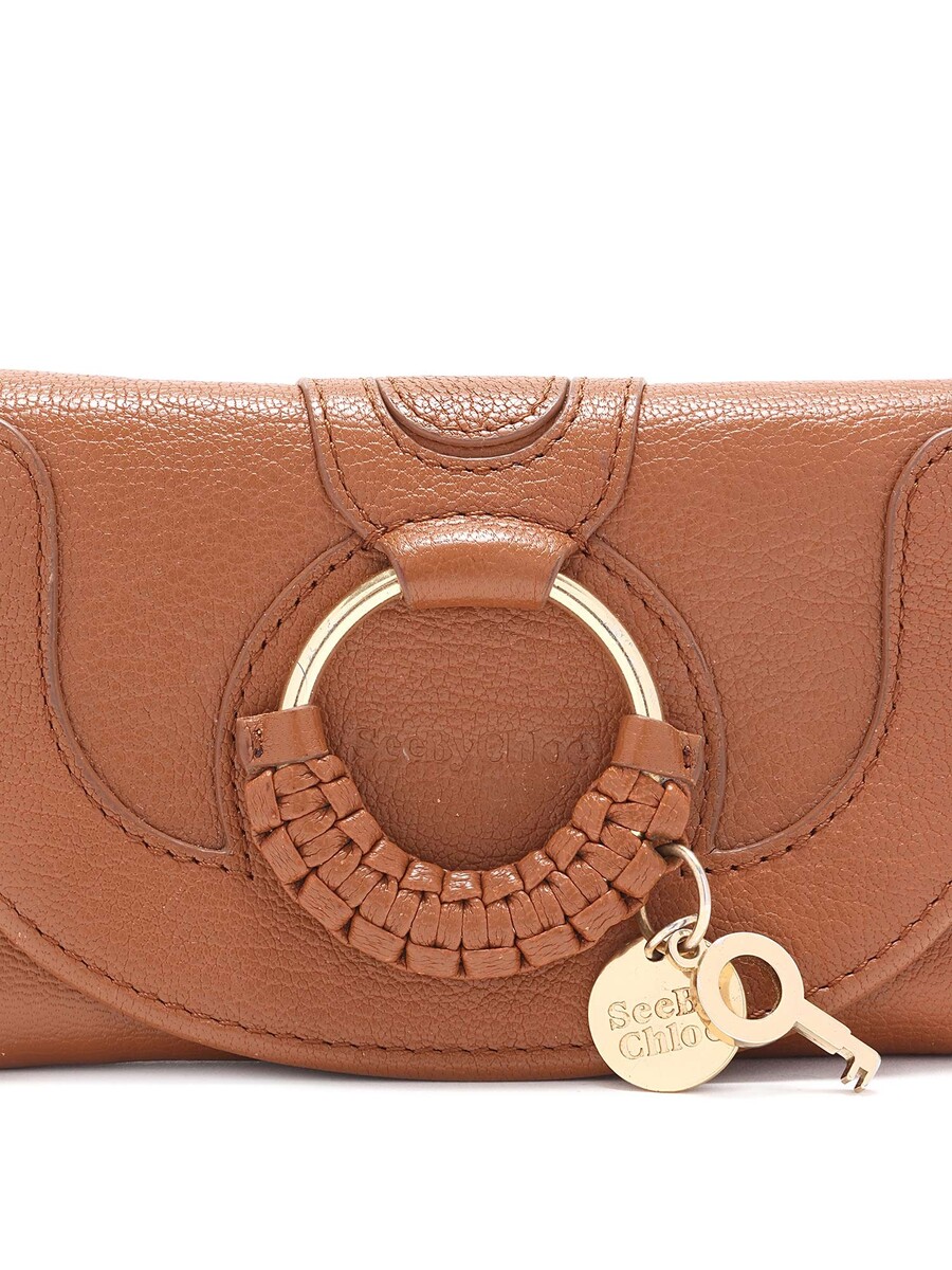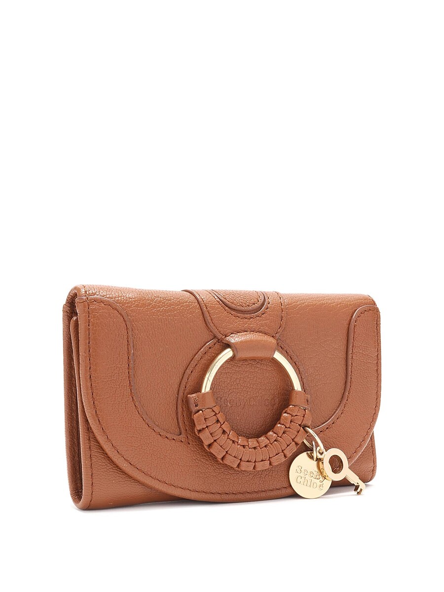 Grained leather wallet in brown featuring a braided gold-tone metal ring. Snap-button closure. Gold hardware.
