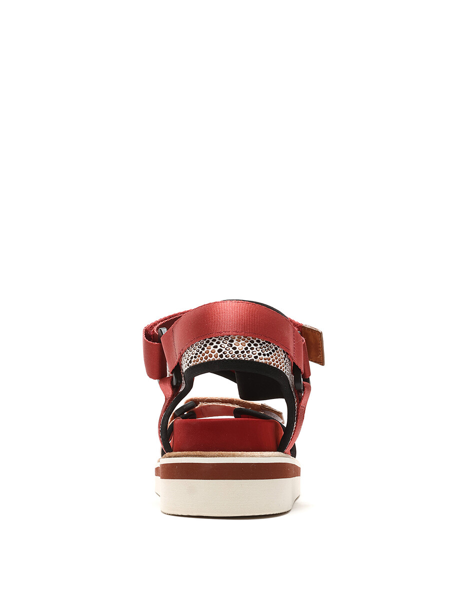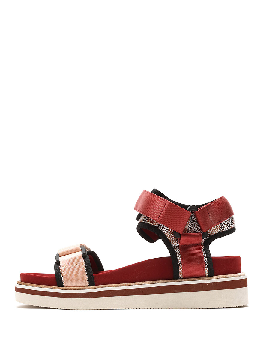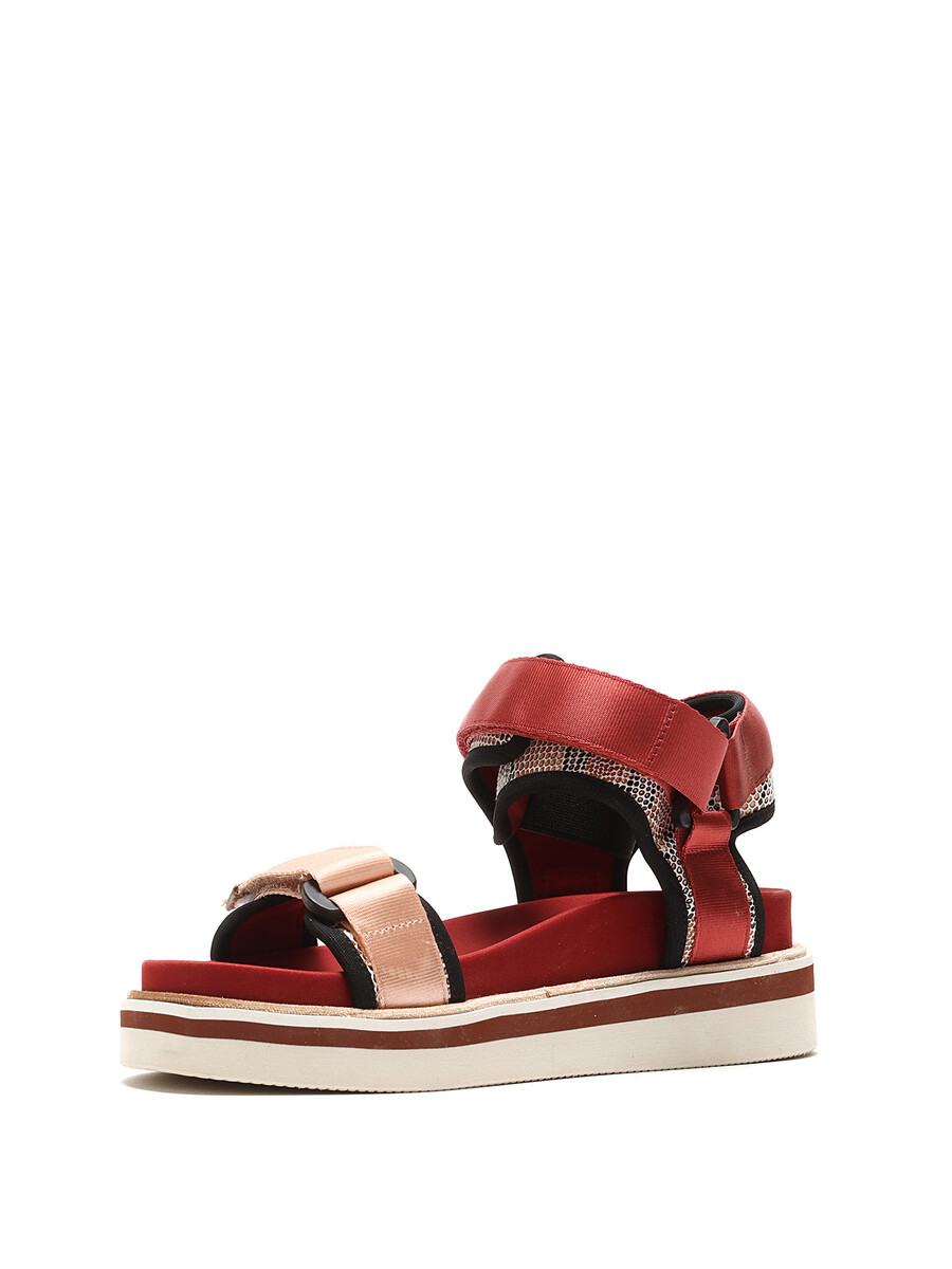 Red and pink fabric platform sandals. Open toe. Velcro closure. Rubber wedge sole. With box.