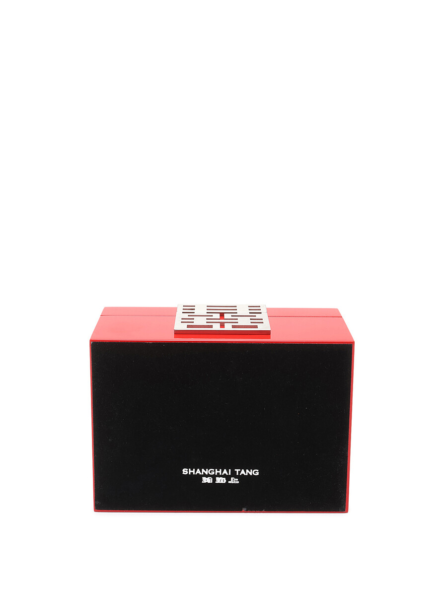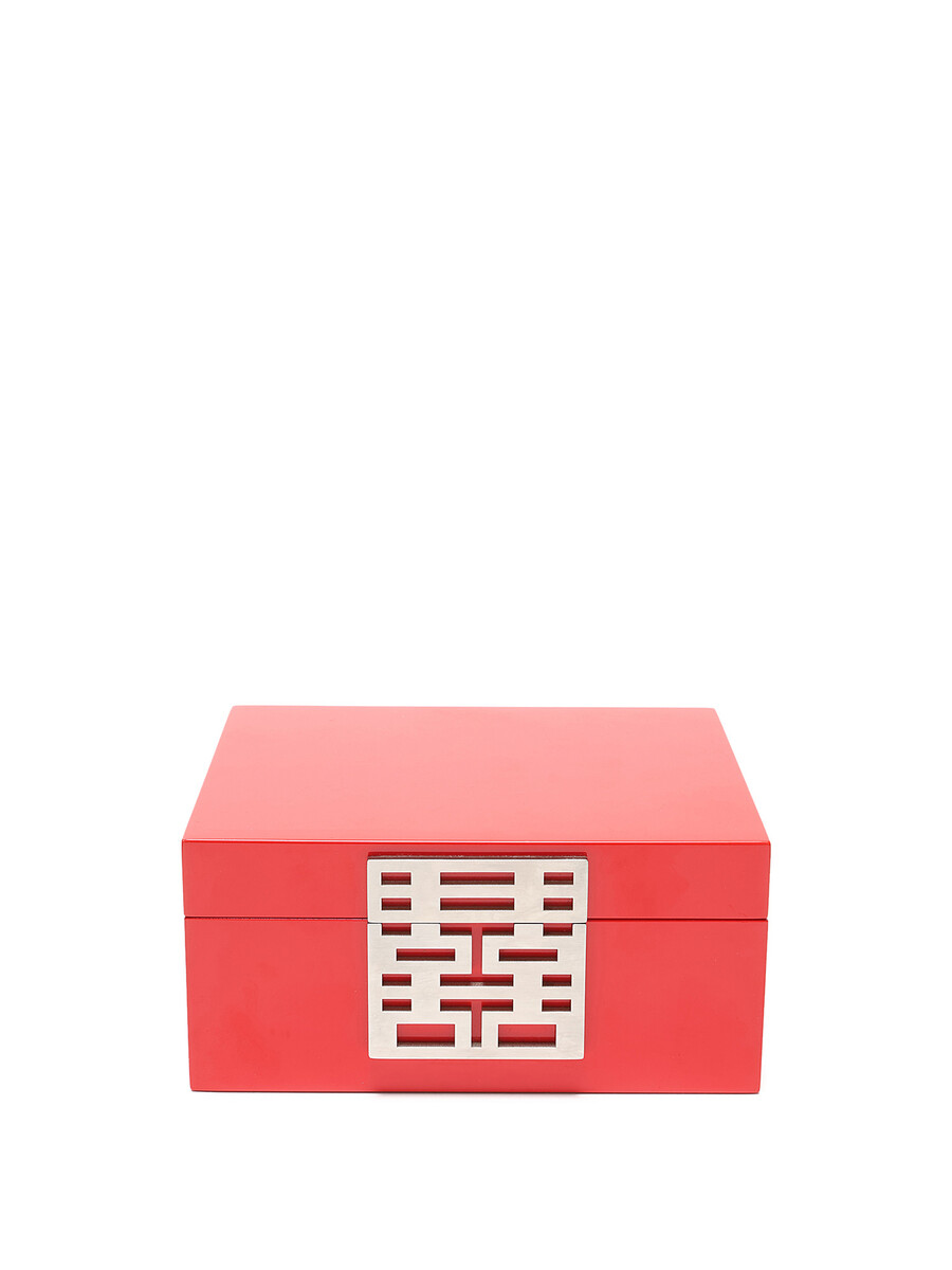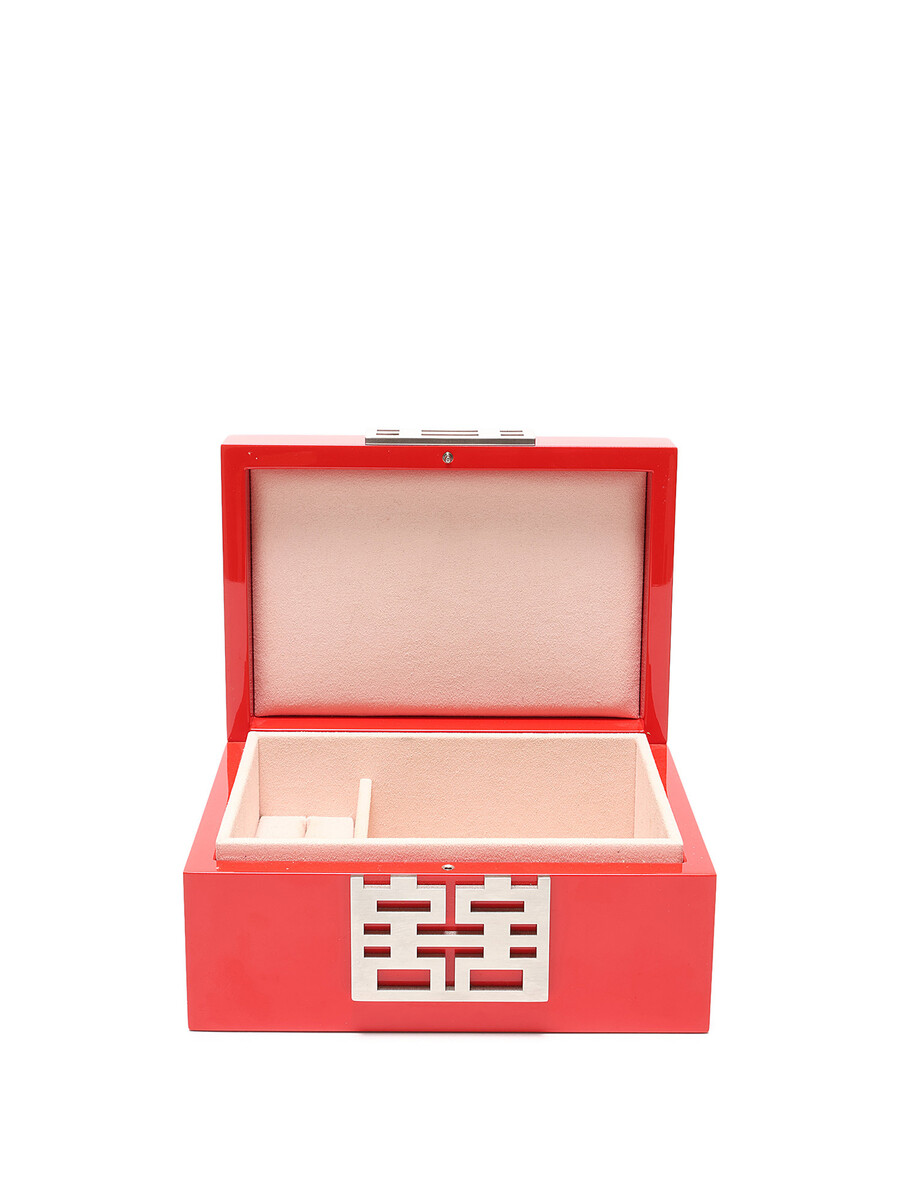 Red lacquered wooden jewelry box featuring a silver-tone metal plate. Hinged closure. Sleek design with a vibrant finish.