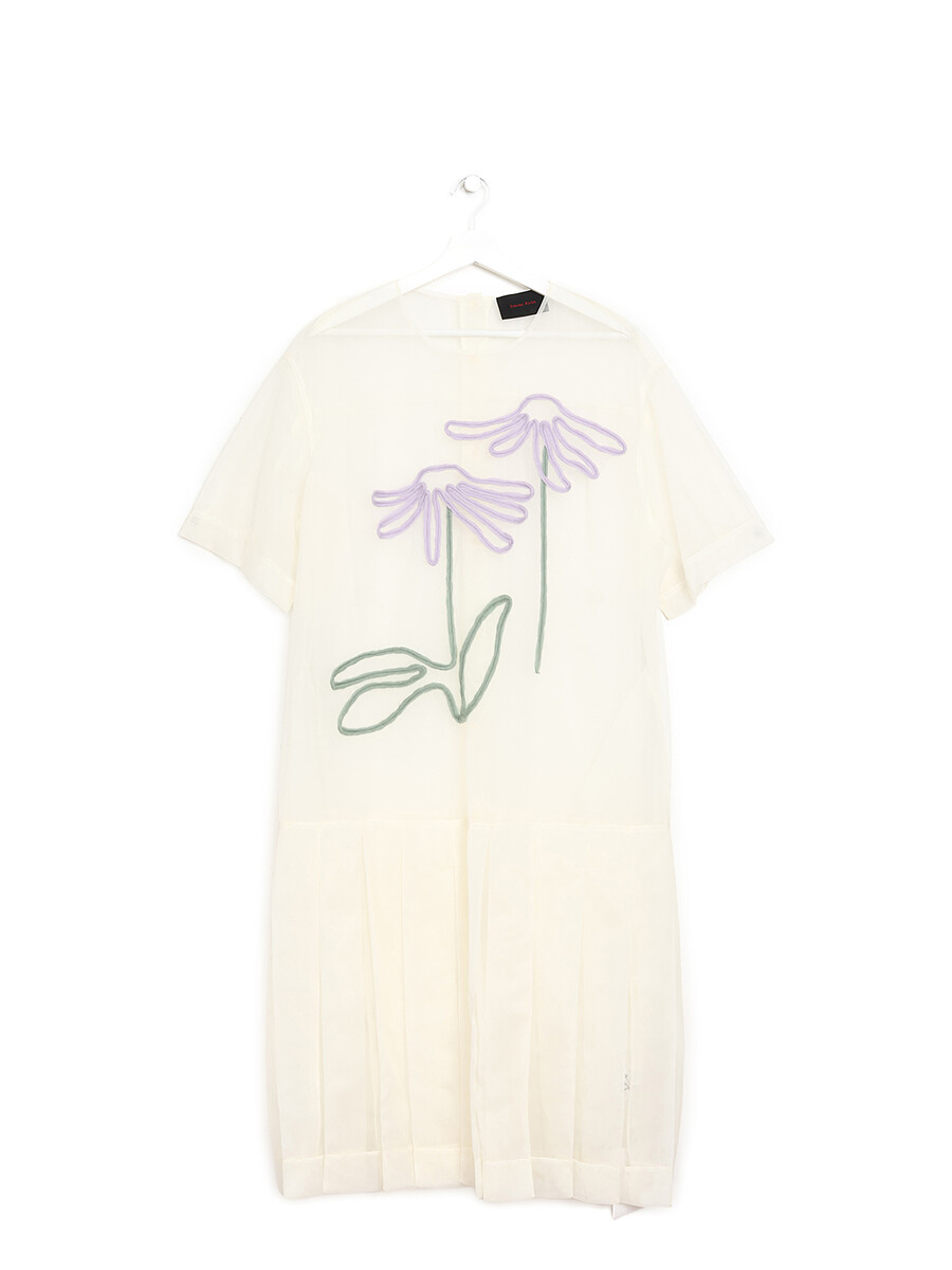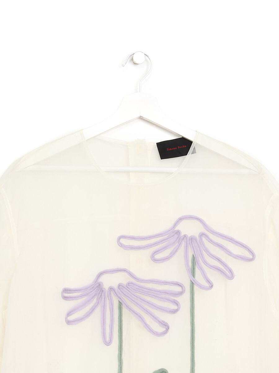 Long tunic with short sleeves featuring floral embroidery. White base with purple and green patterns. Back button closure. Round neck.