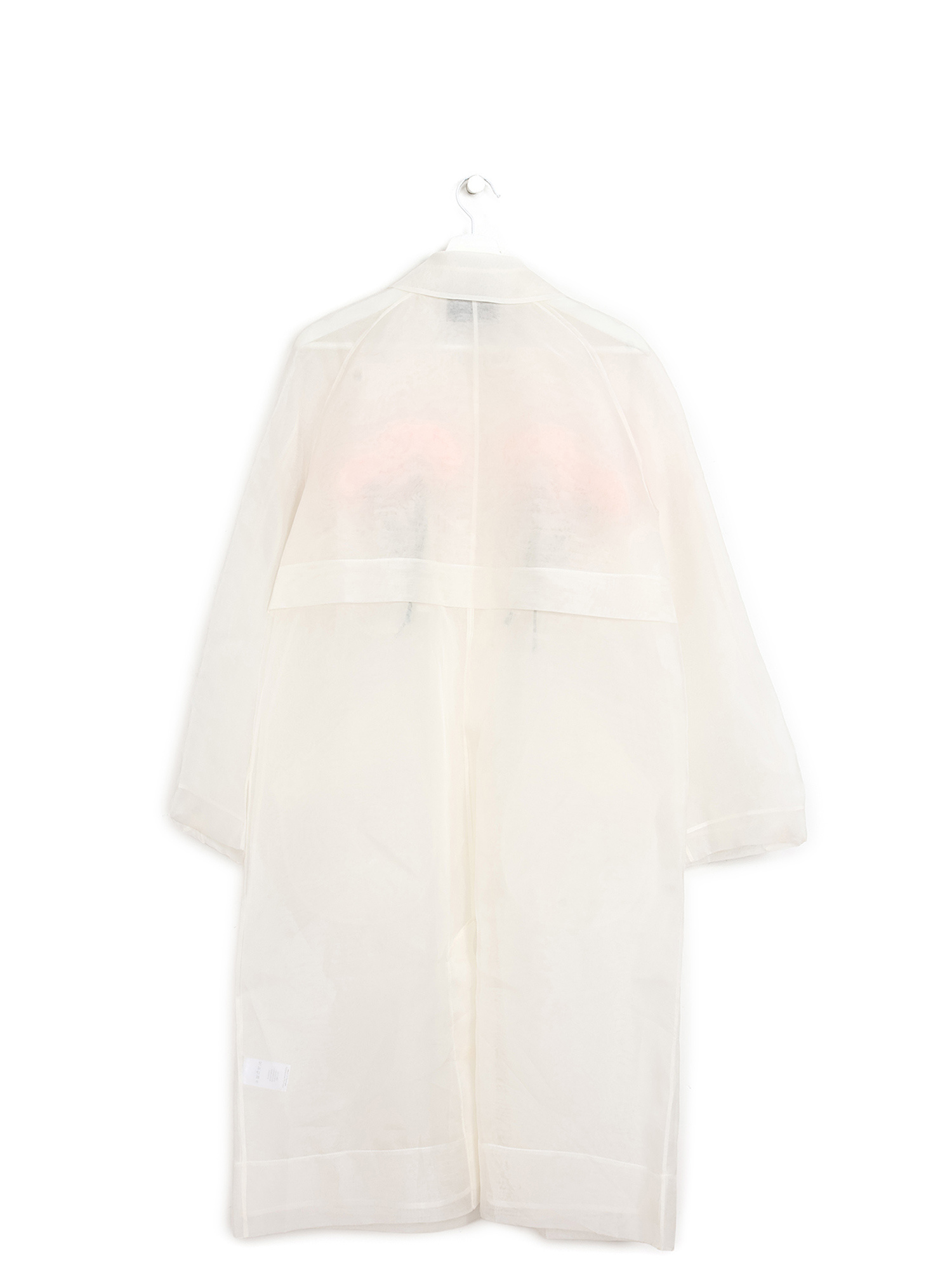 Sheer silk floral embellished coat in off-white. Shirt collar. Button closure at front. Flower patch details at chest. Patch pockets.