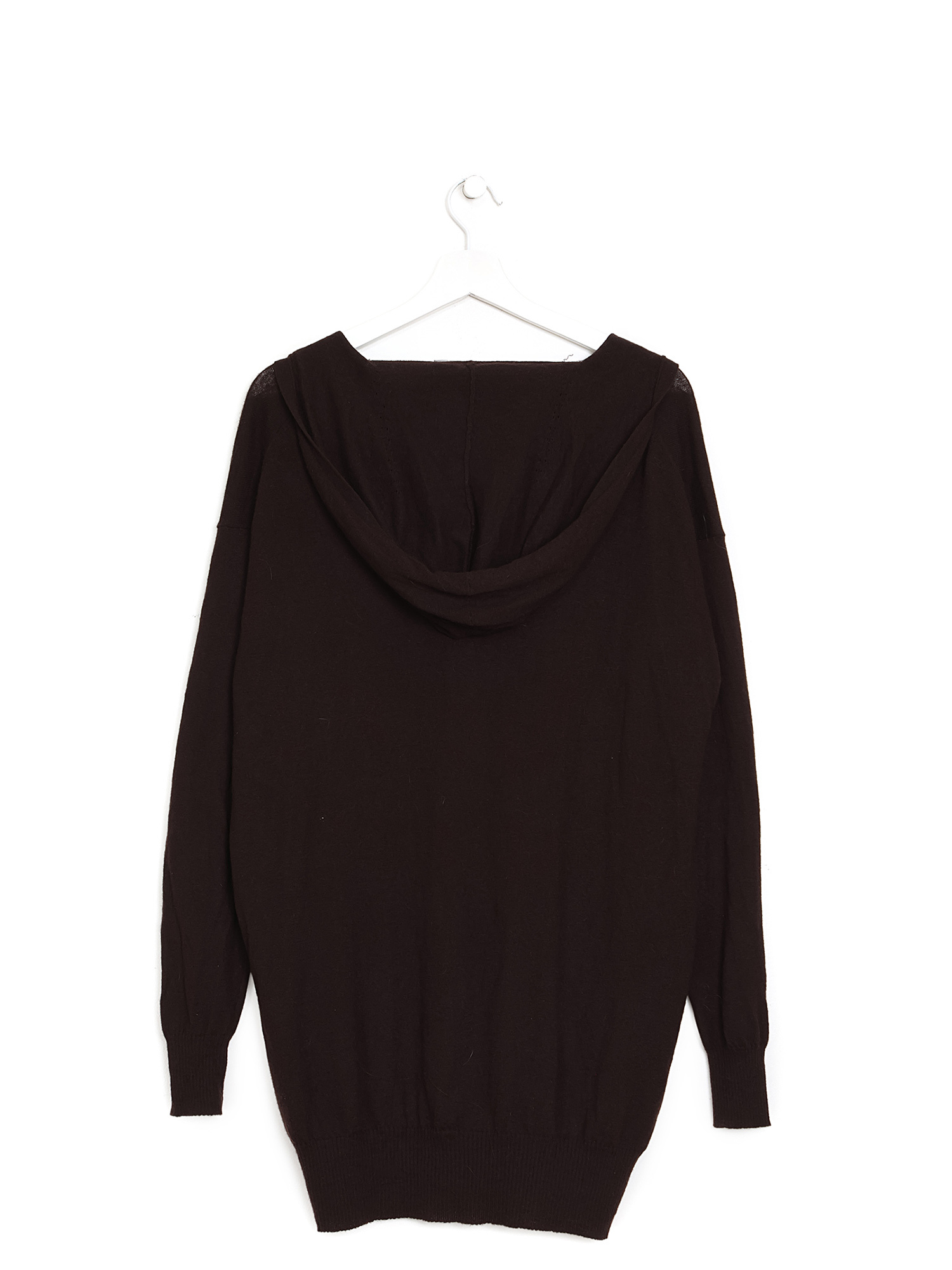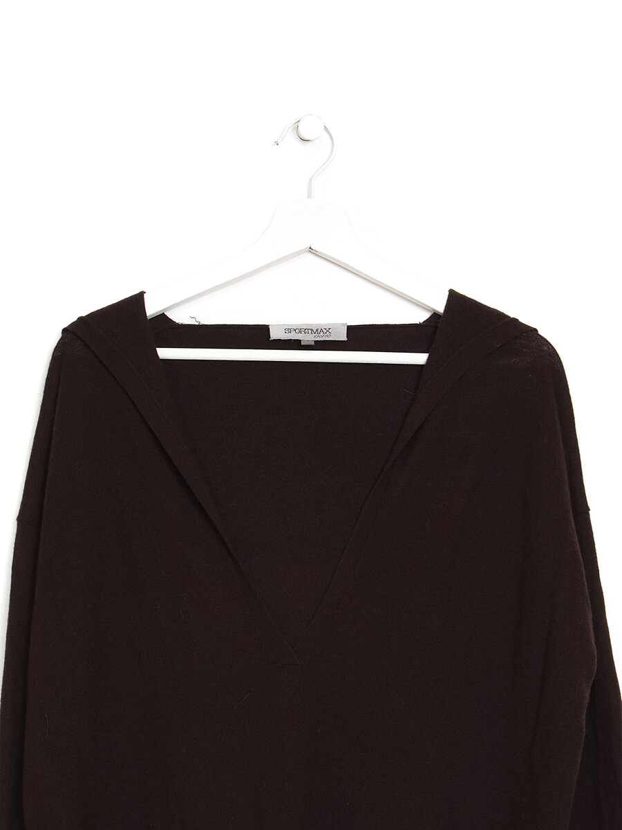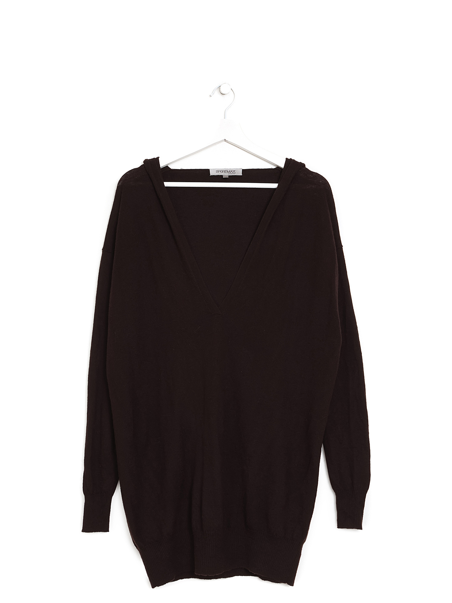 Cashmere V-neck hoodie sweater. Soft texture. Relaxed fit. Rib-knit cuffs and hem.