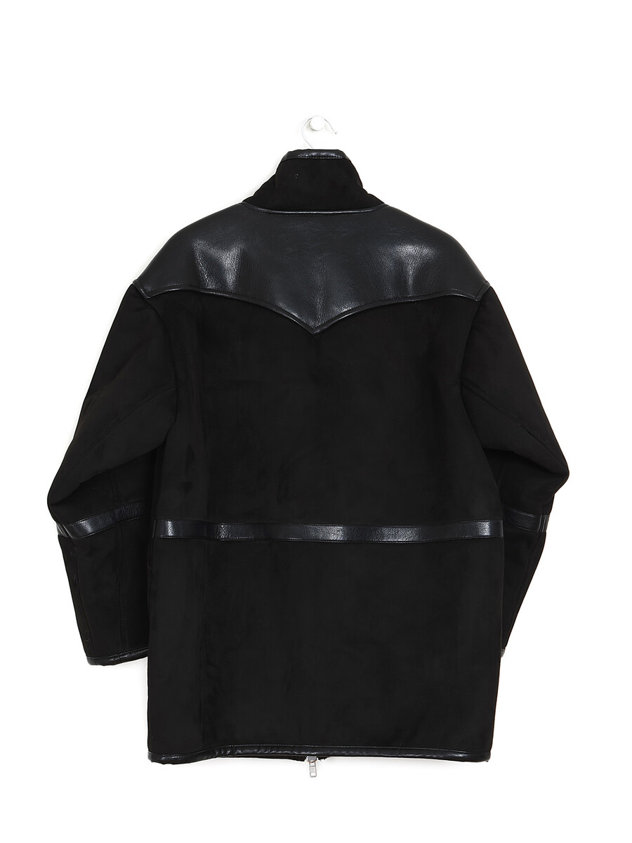 Long sleeve faux shearling jacket in black with faux suede and leather detailing. Silver front zipper closure.