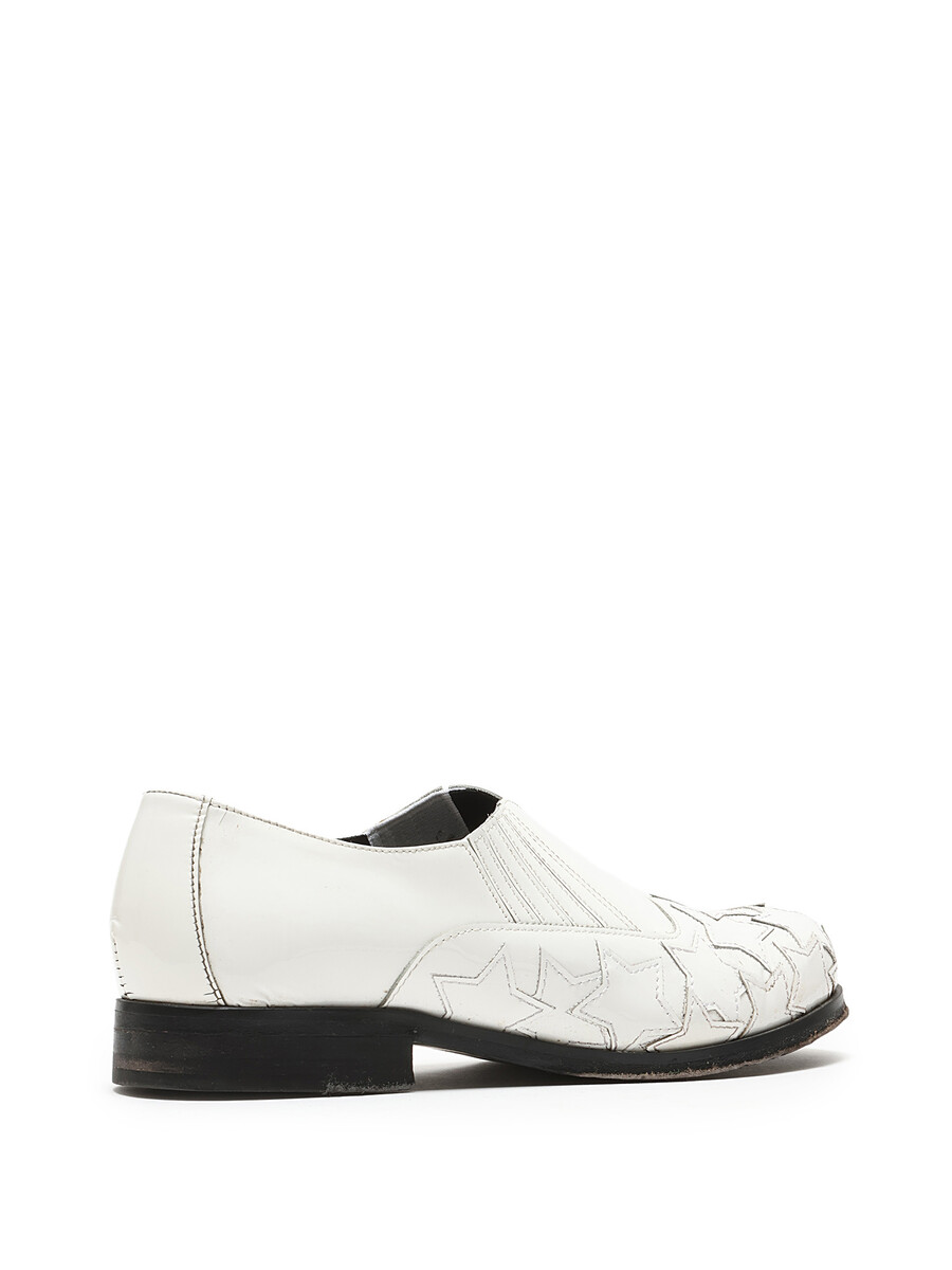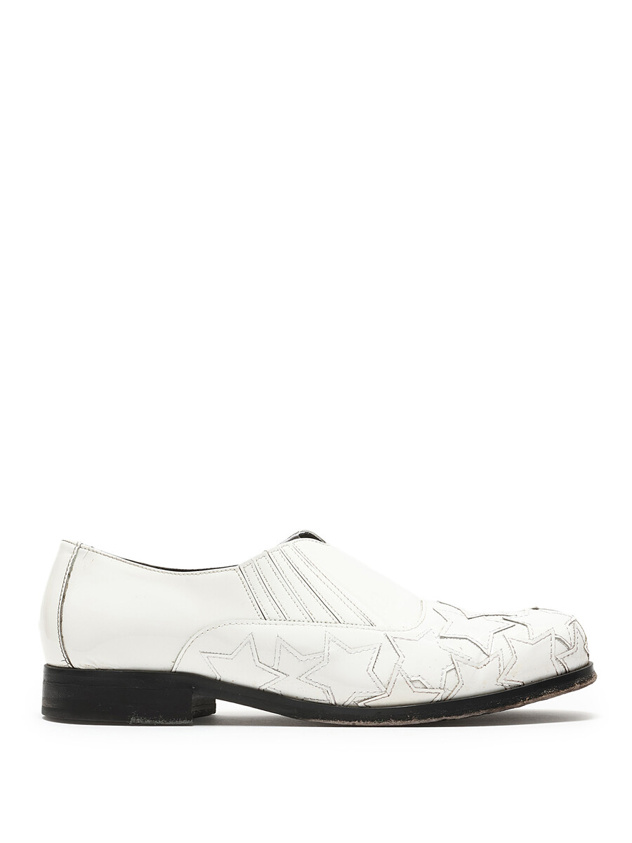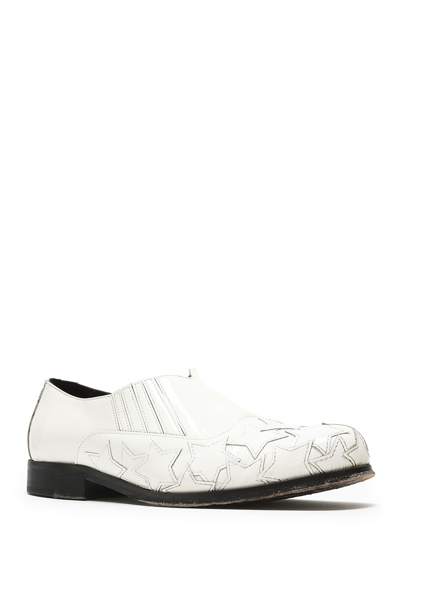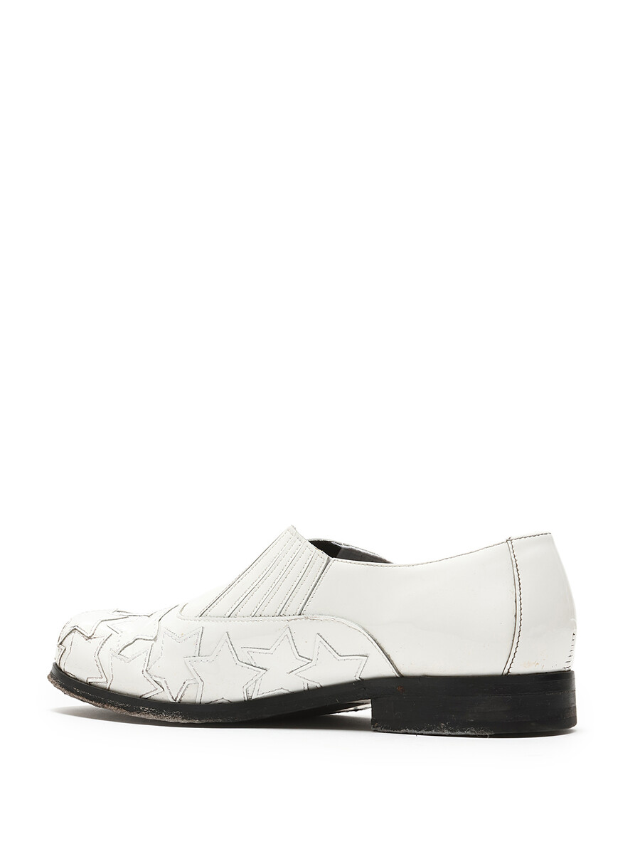 White leather slip-on shoes with star pattern detailing. Round toe design. Easy slip-on closure. Includes dustbag.