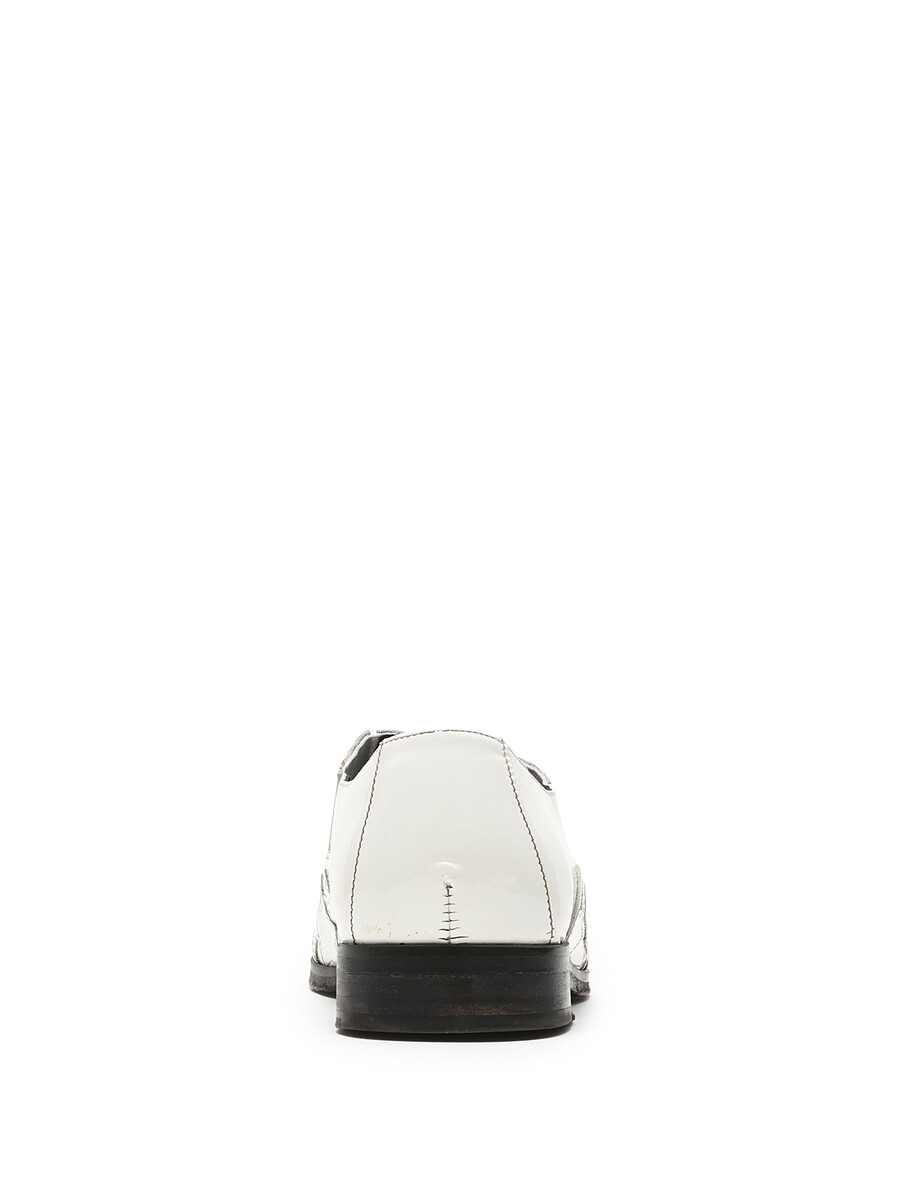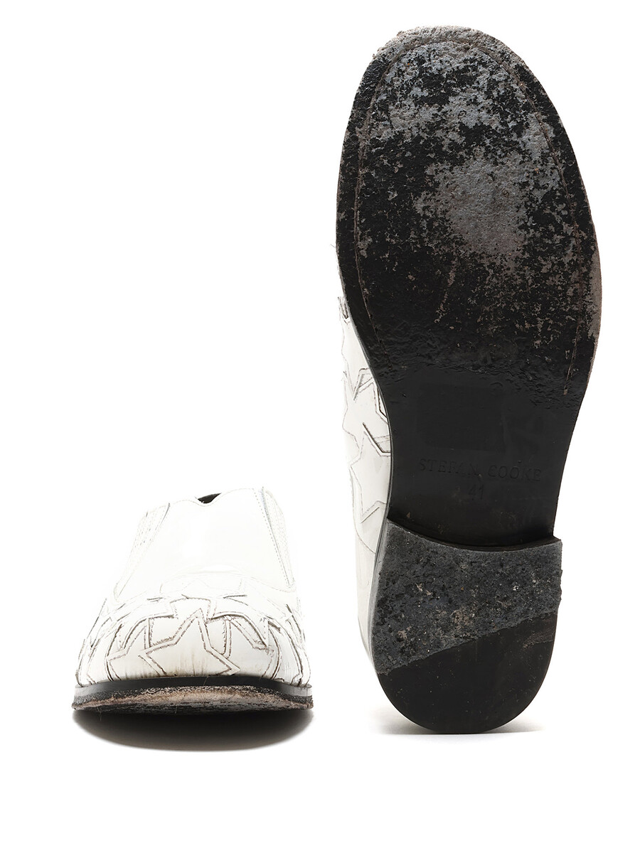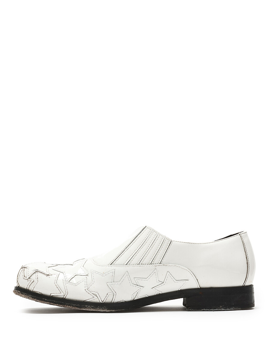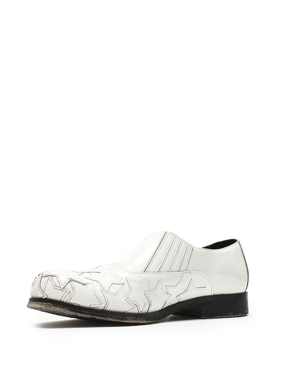 White leather slip-on shoes with star pattern detailing. Round toe design. Easy slip-on closure. Includes dustbag.