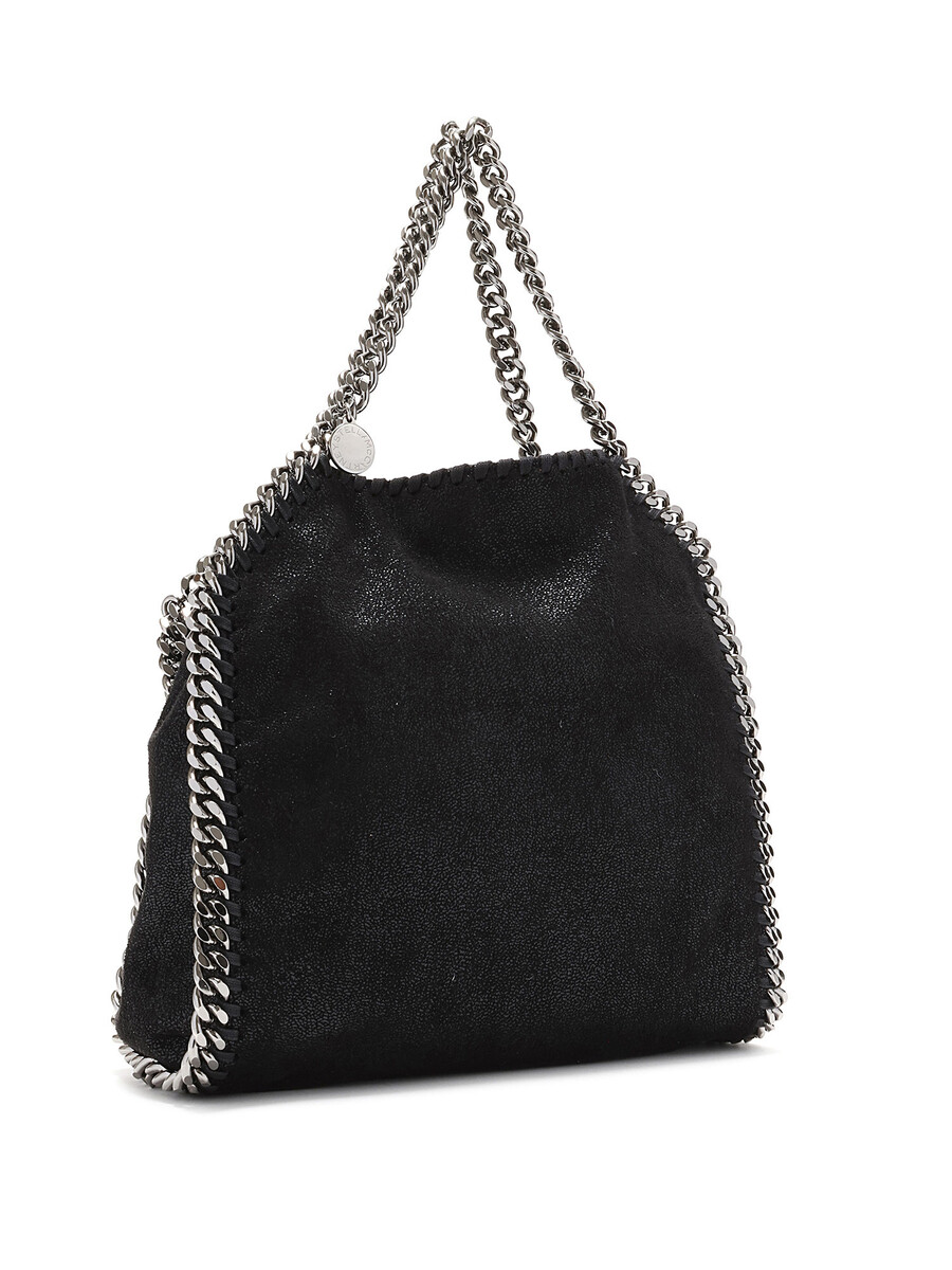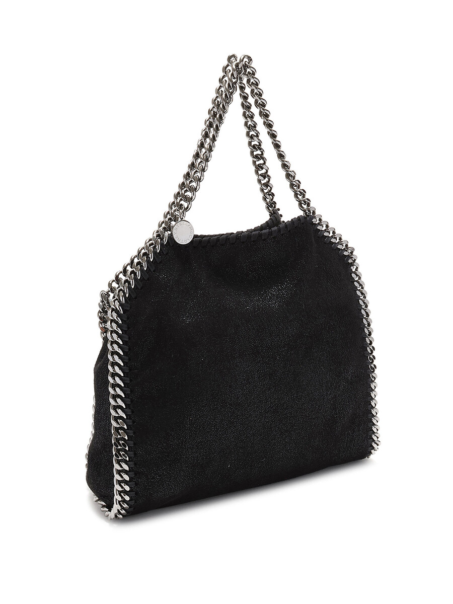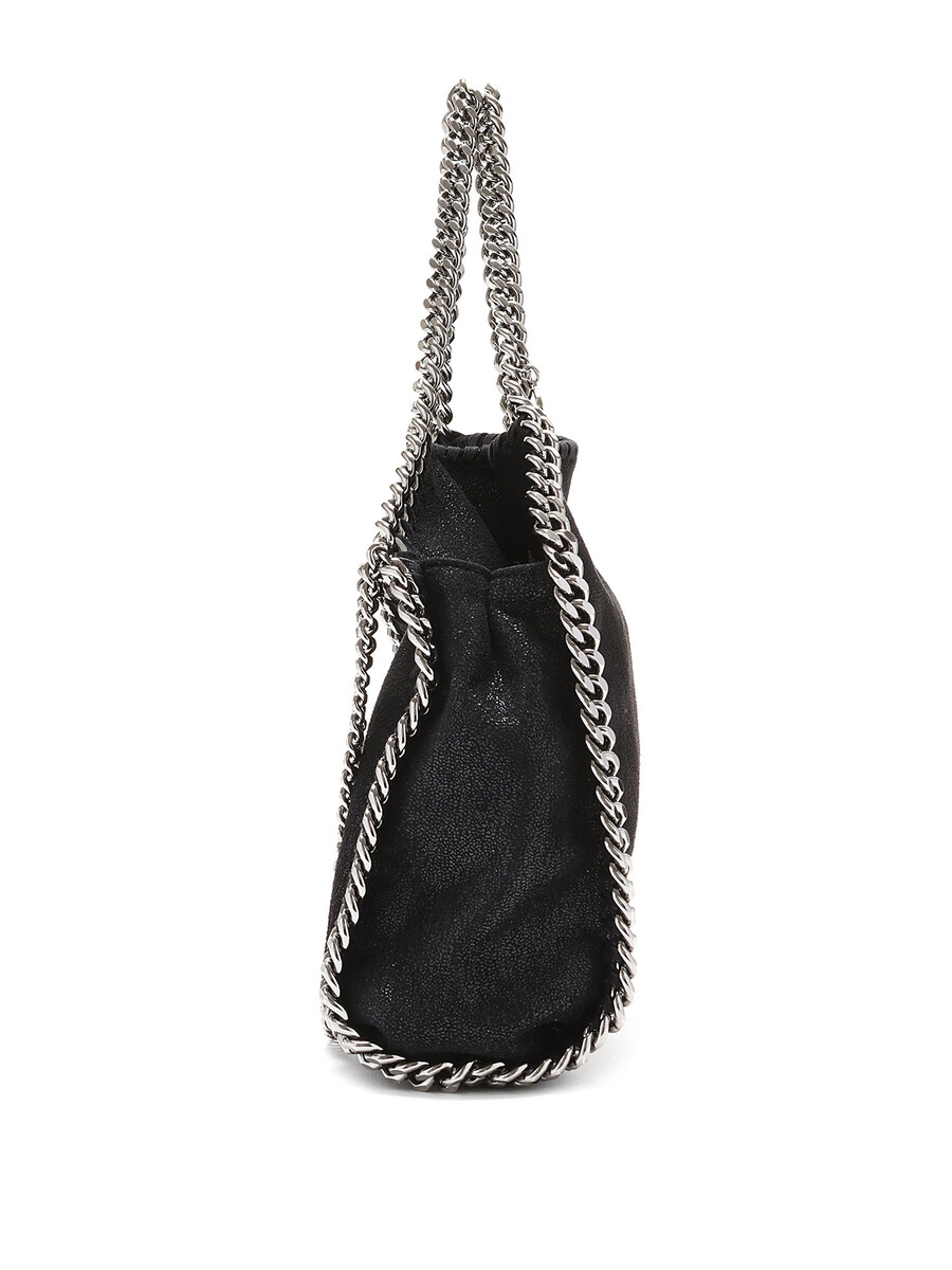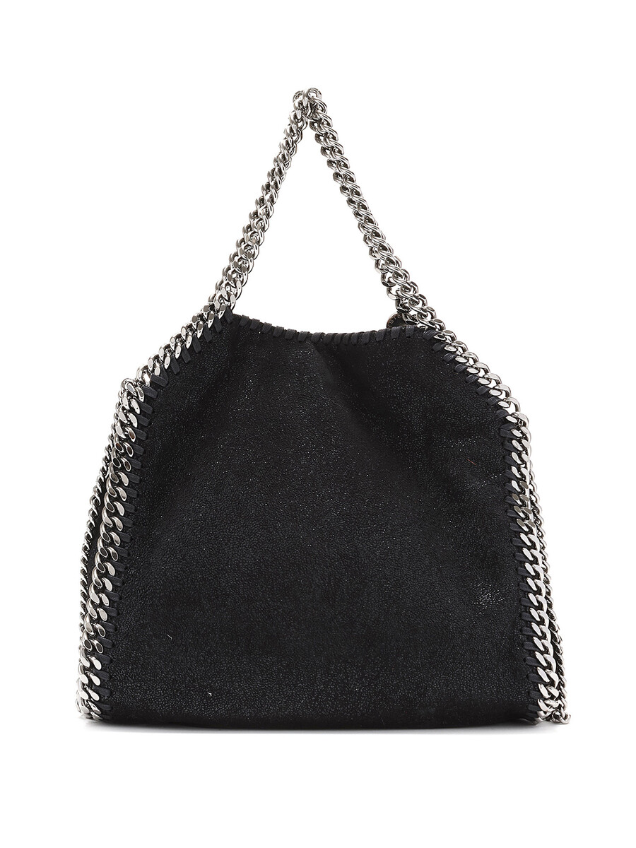Faux suede tote bag in black with a magnetic snap closure. Featuring a chain shoulder strap and silver-tone hardware.