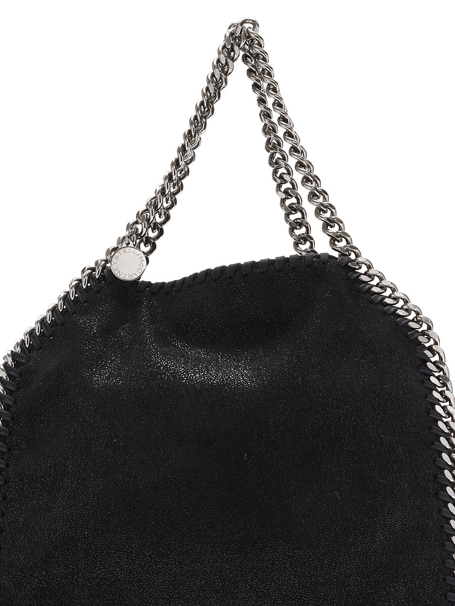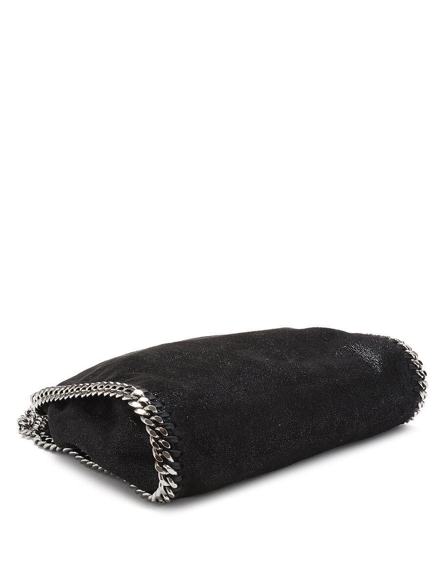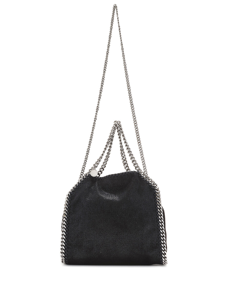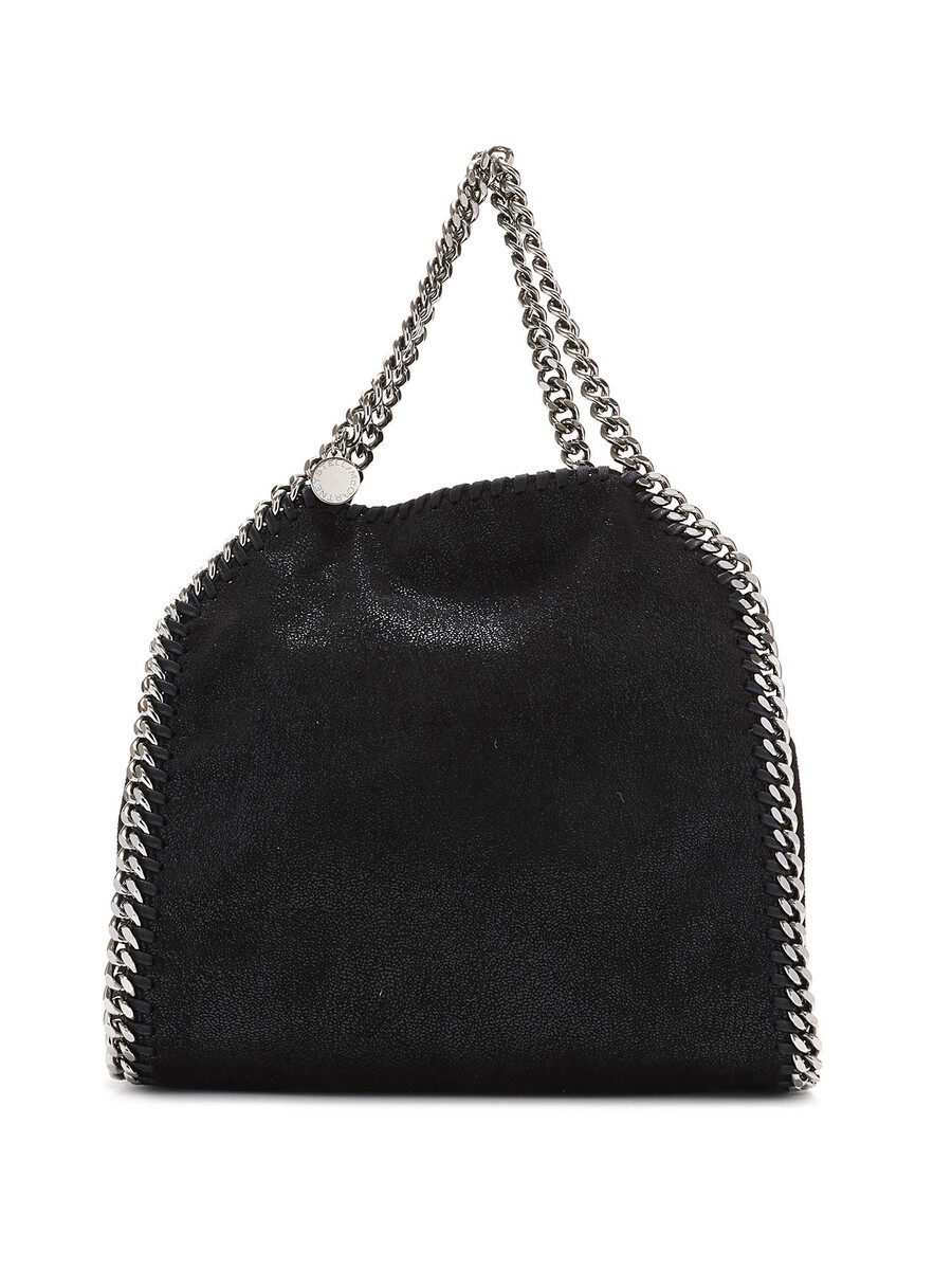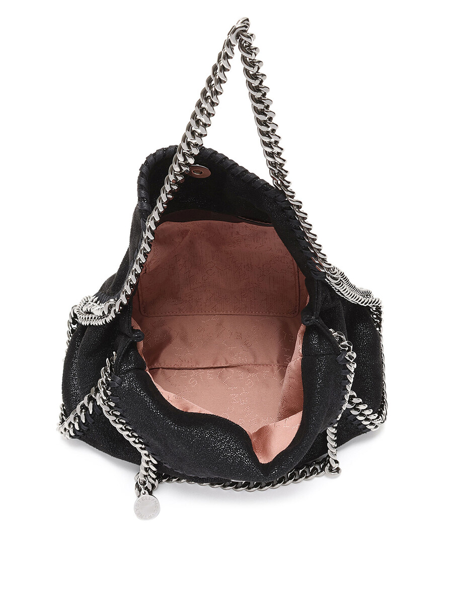 Faux suede tote bag in black with a magnetic snap closure. Featuring a chain shoulder strap and silver-tone hardware.