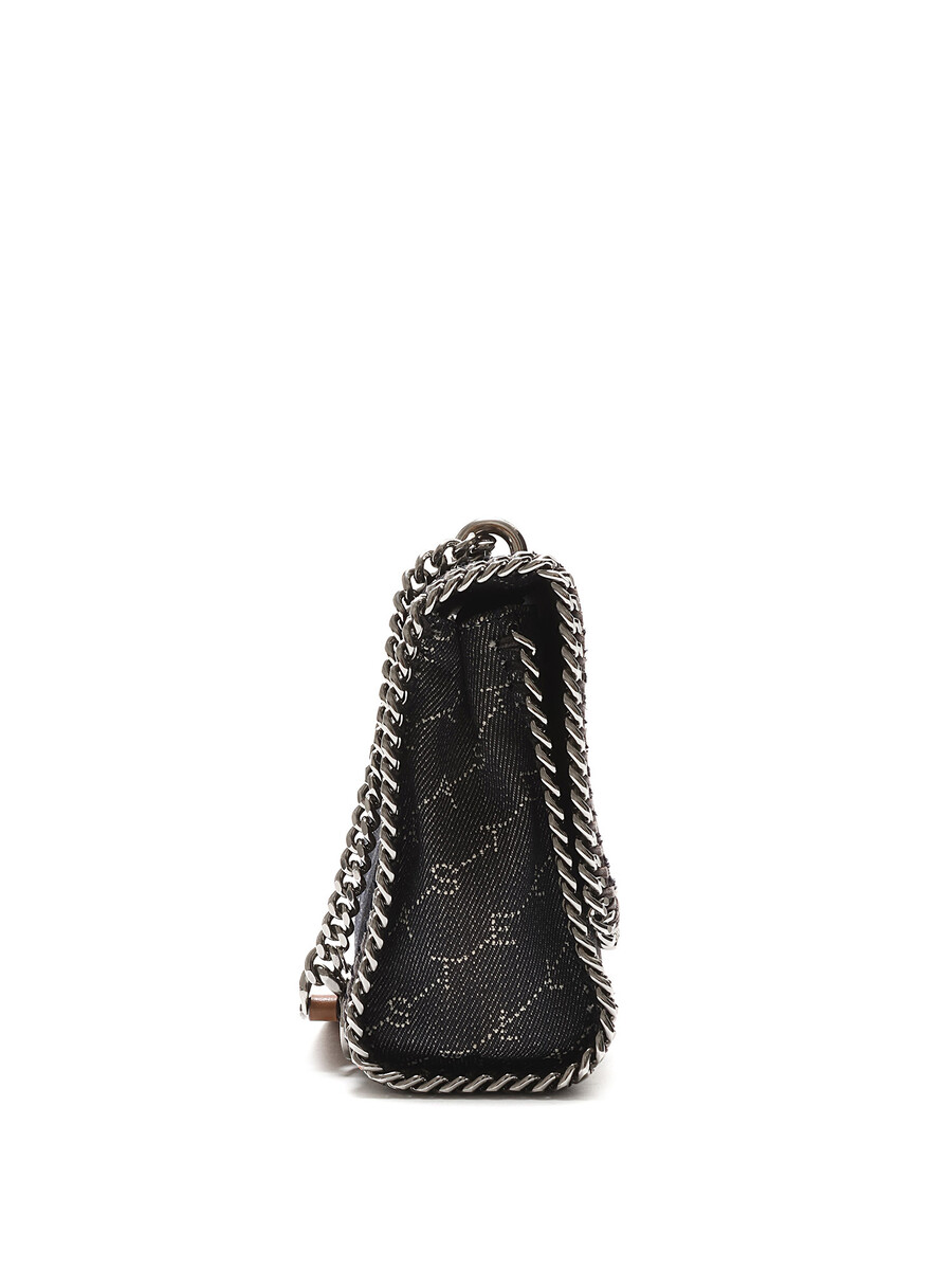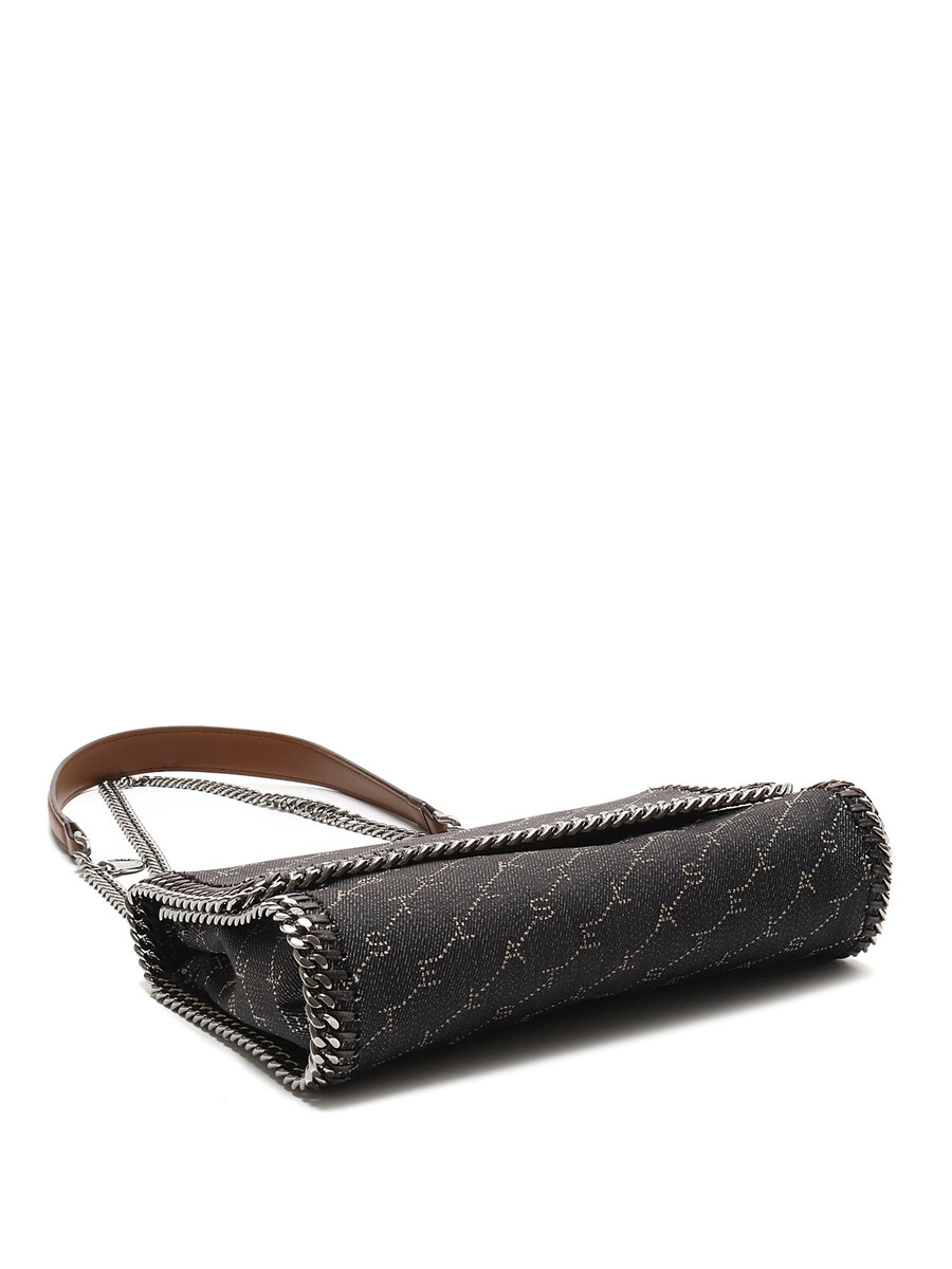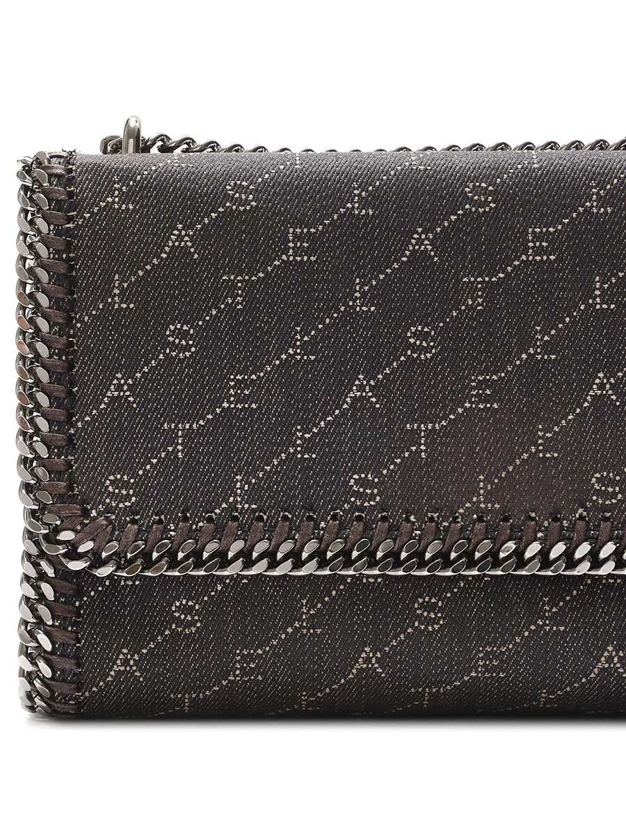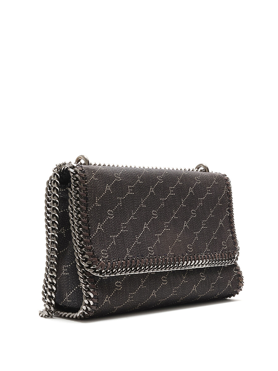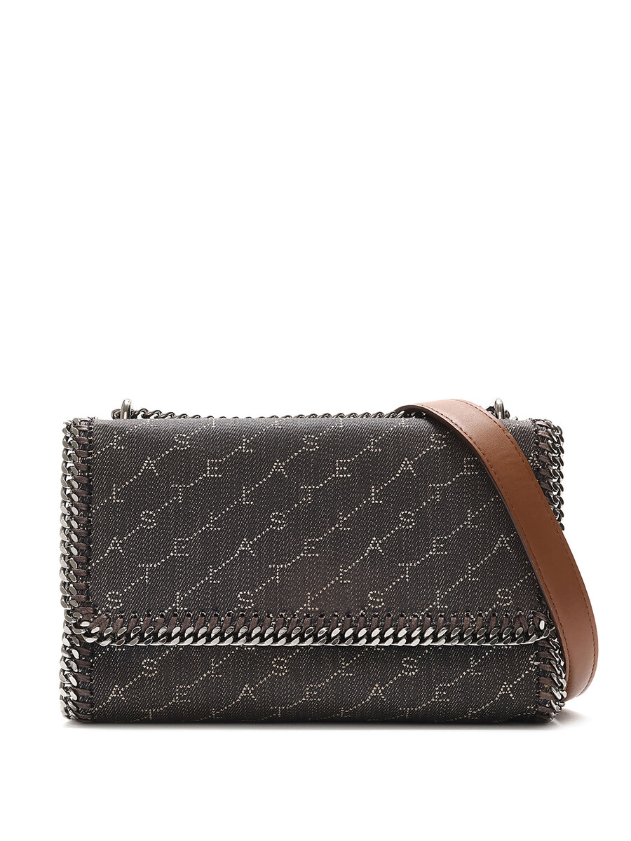 Dark denim monogram crossbody bag featuring brown leather accents. Magnetic snap closure. Chain strap with leather inlay. Silver-tone metal hardware.