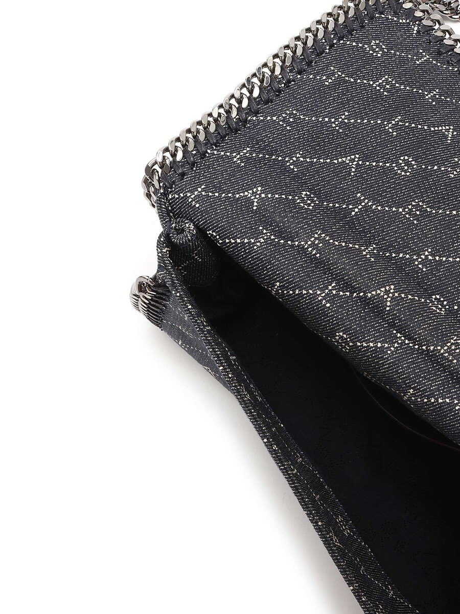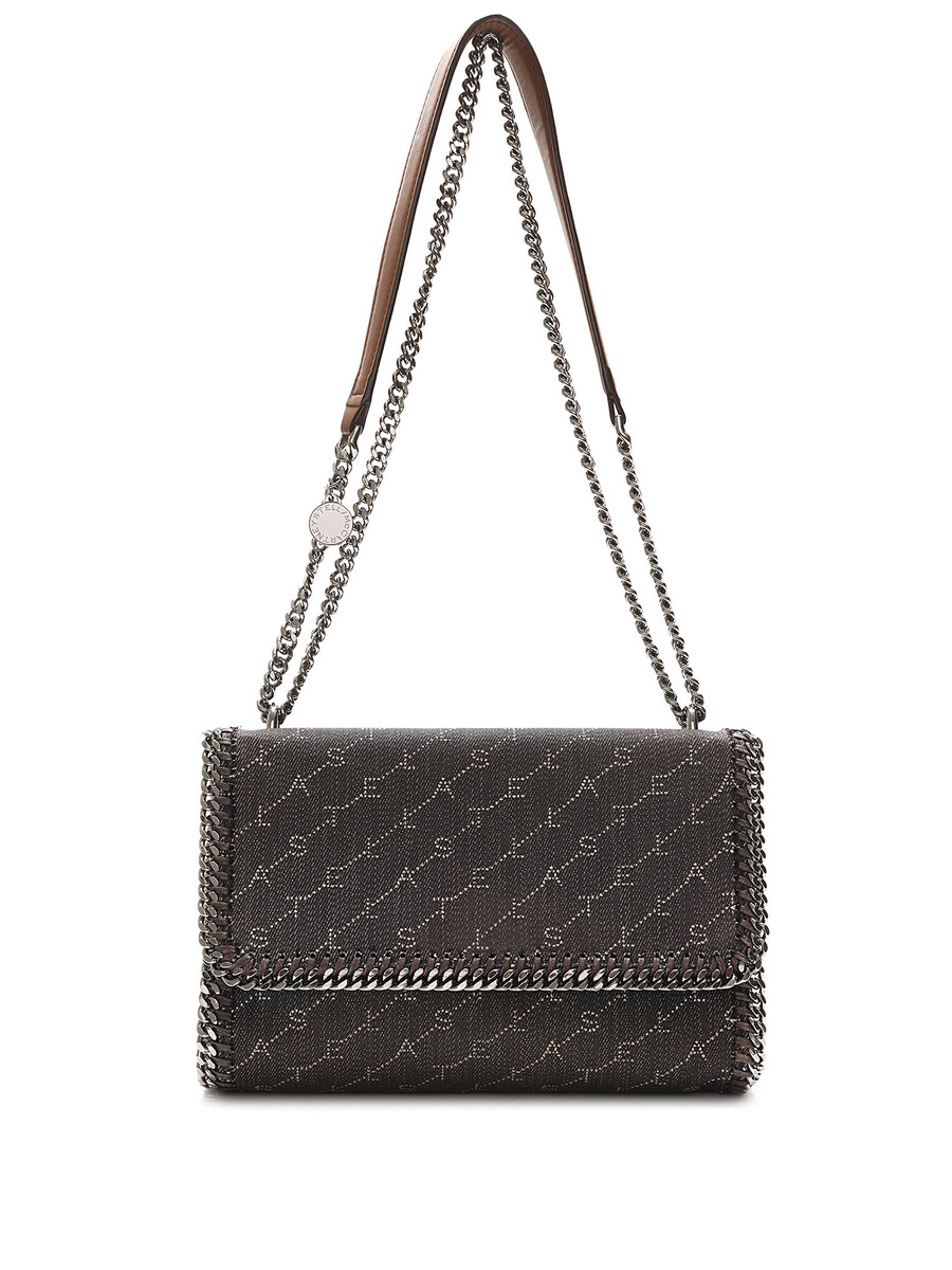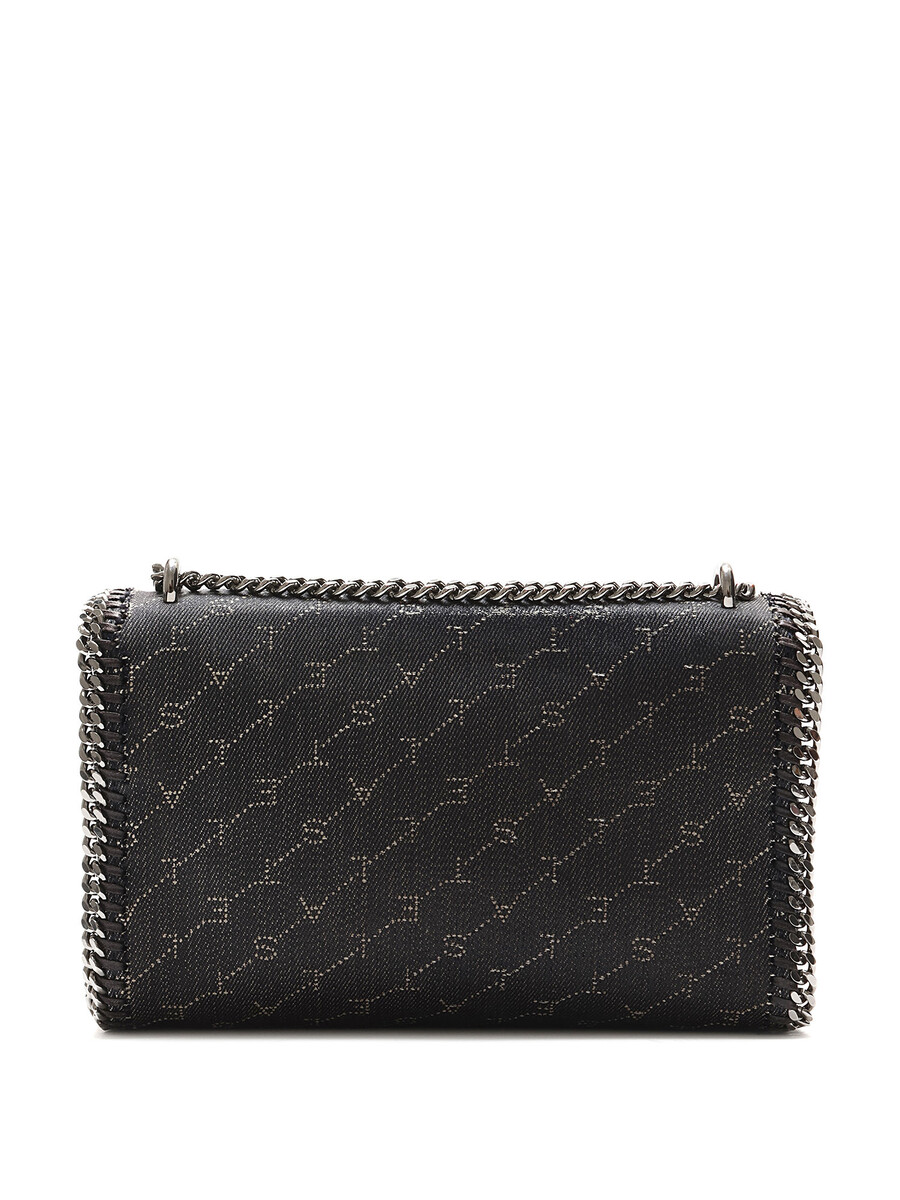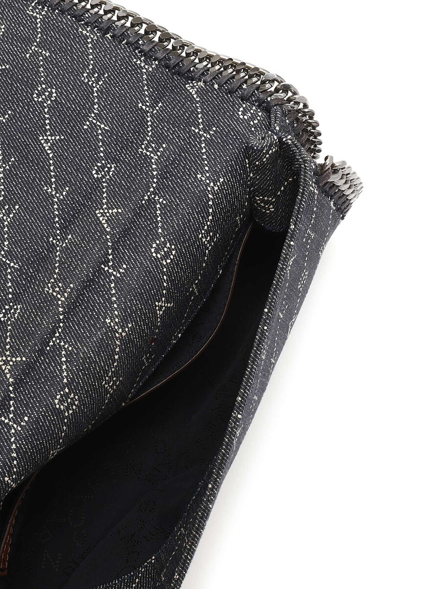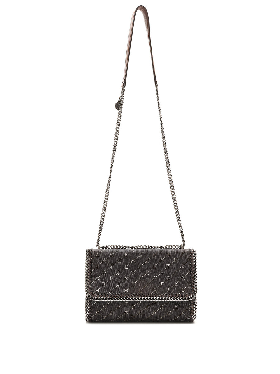 Dark denim monogram crossbody bag featuring brown leather accents. Magnetic snap closure. Chain strap with leather inlay. Silver-tone metal hardware.