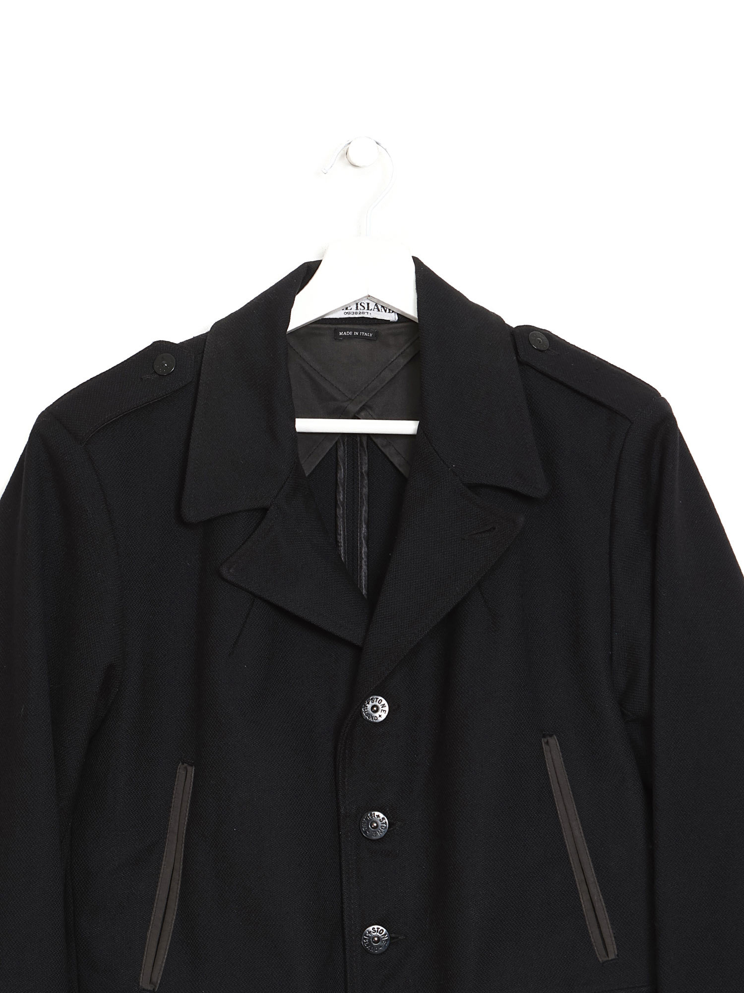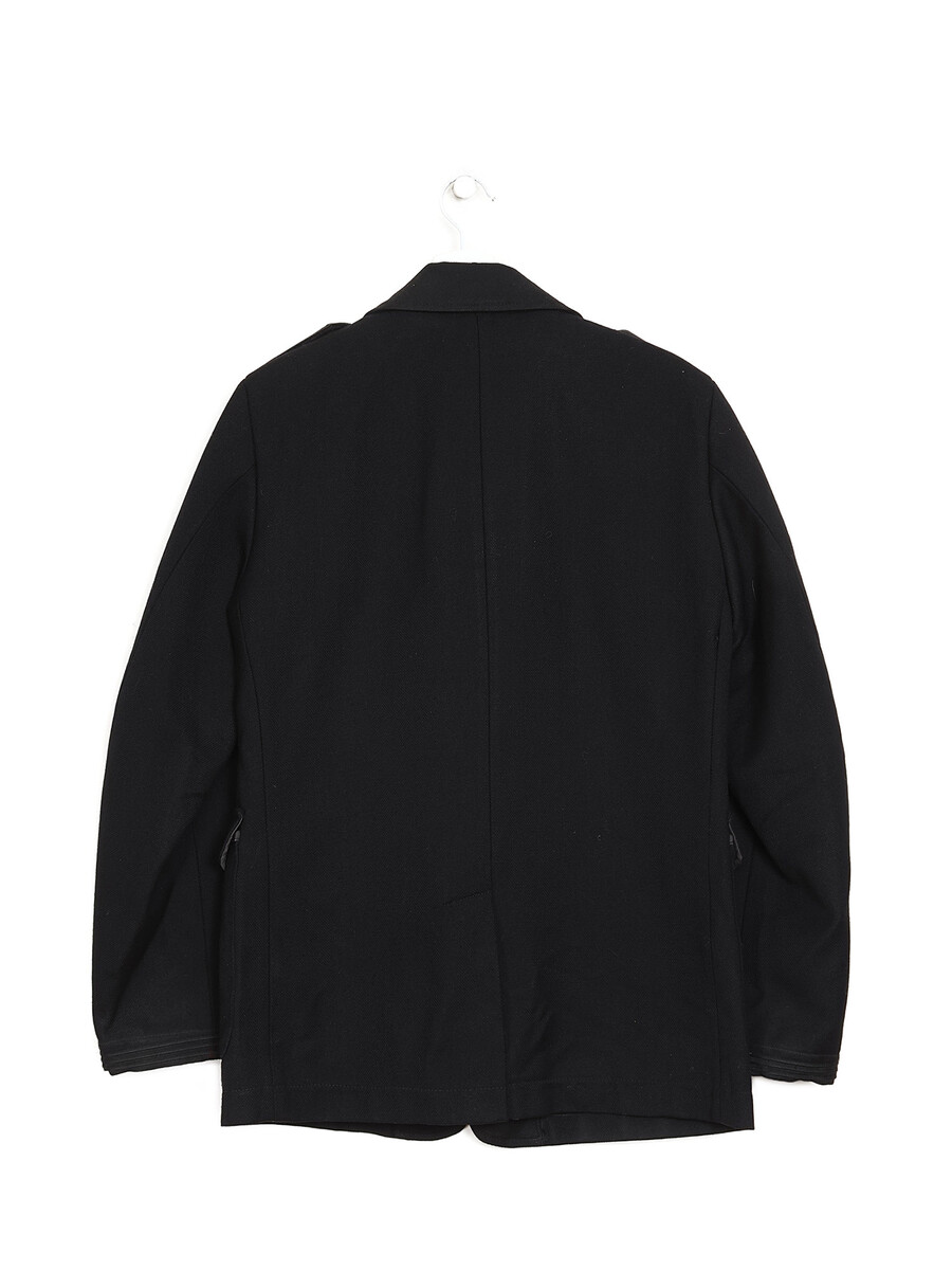 Long sleeve black jacket. Épaulettes. Lapel collar. Button closure. Features front flap pockets.