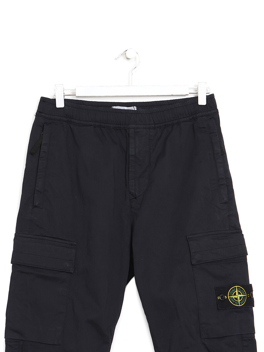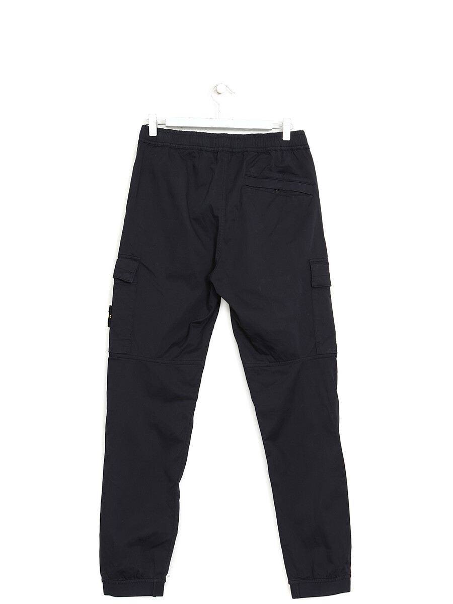 Stretch cotton cargo pants featuring an elastic waistband. Side patch pockets and tonal stitching throughout.