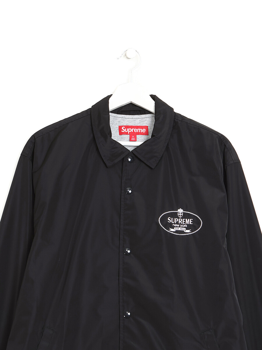 Long sleeve jacket with black and white graphic pattern. Features snap button front closure, shirt collar, and side pockets.