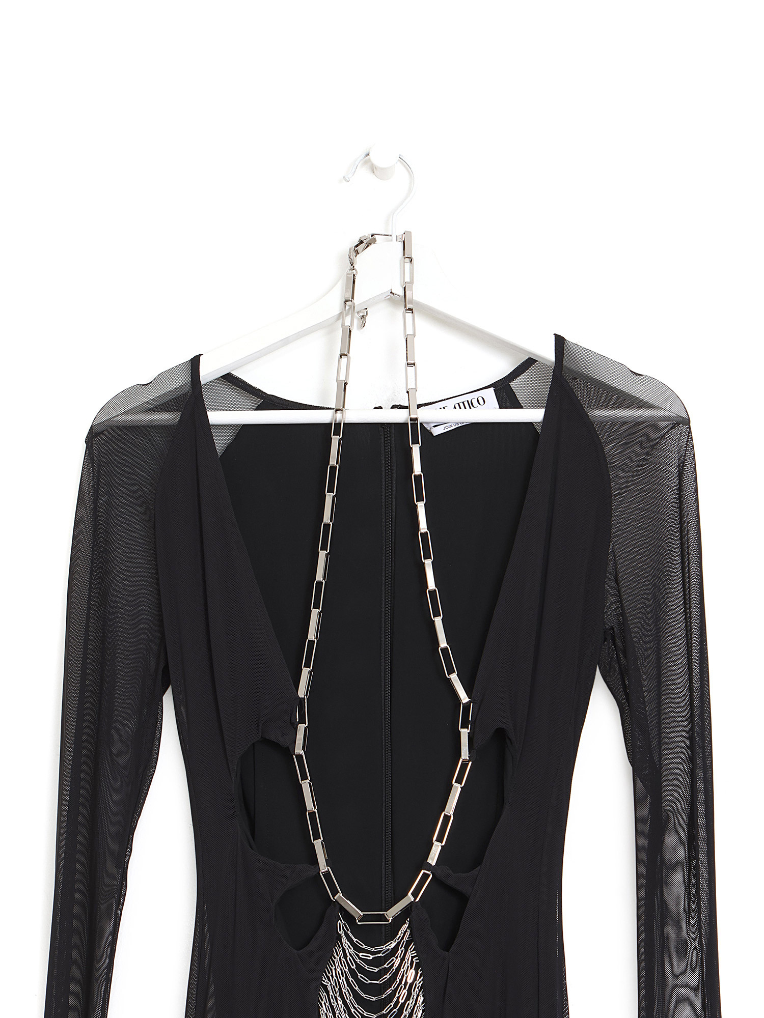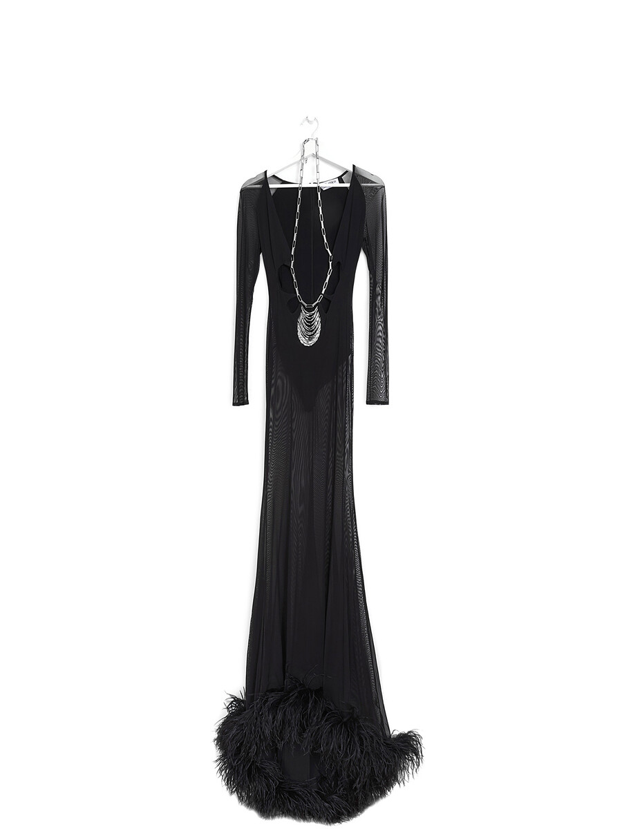 Maxi long sleeve dress with mesh panels and feather accents in black. Bodysuit lining. Chain details at the front.