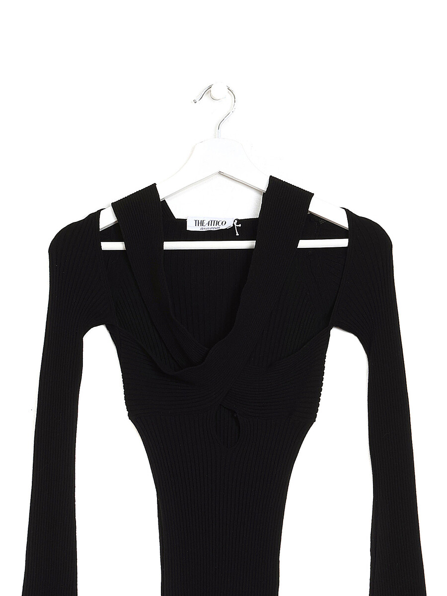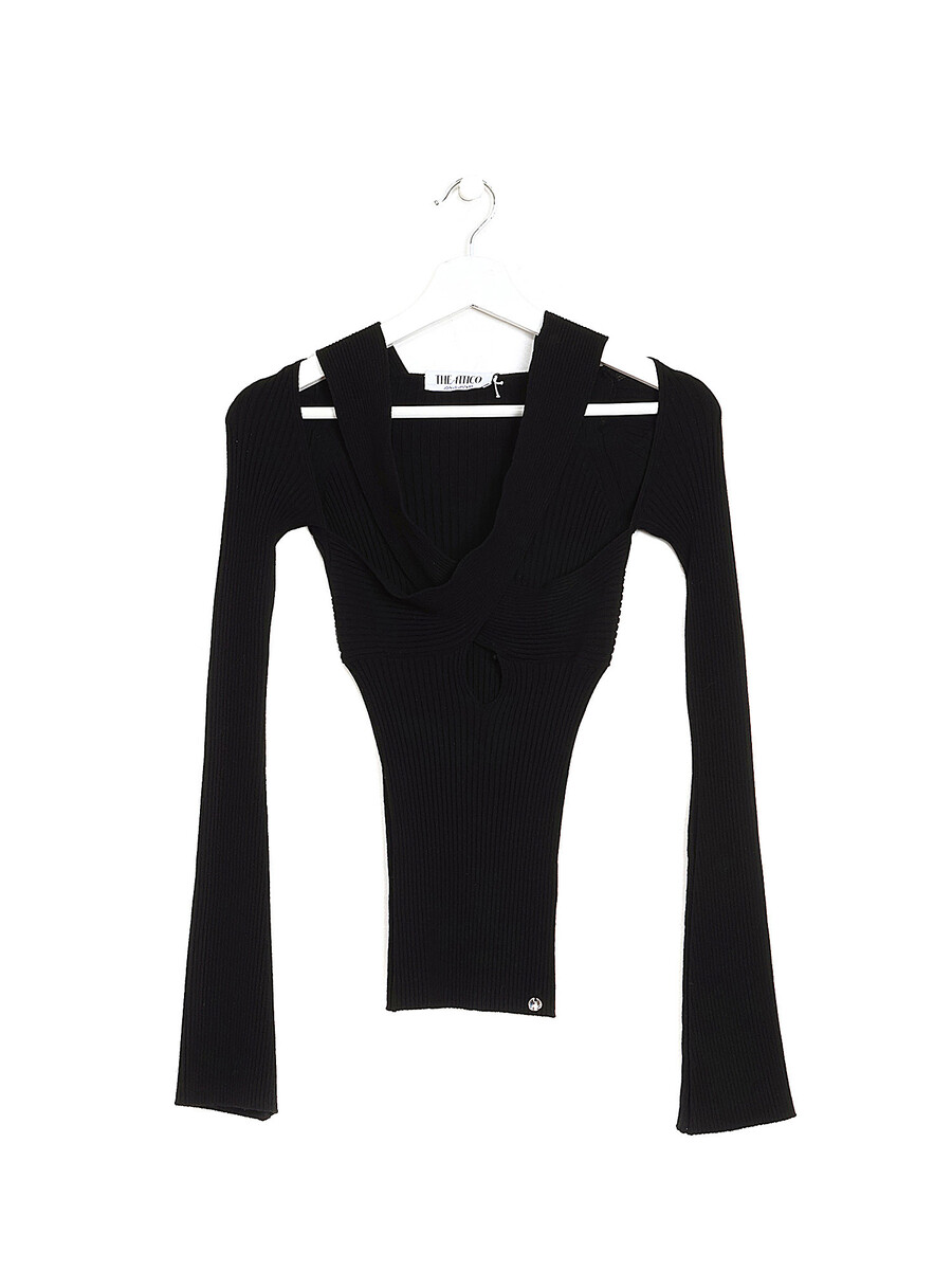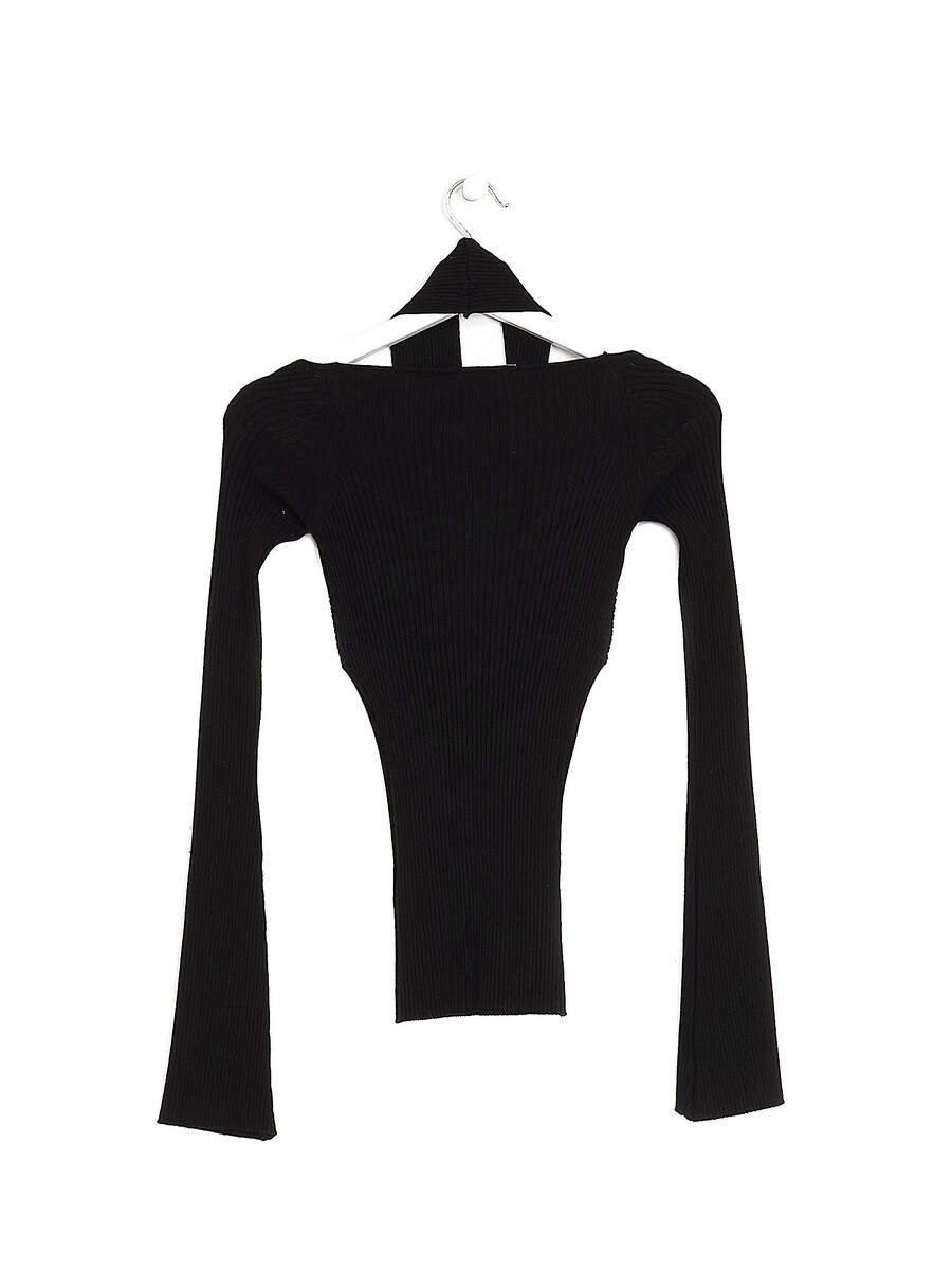 Ribbed knit long sleeve top in black. Features a tie neck detailing. Silver metal logo plaque at hip. Keyhole opening at the front.