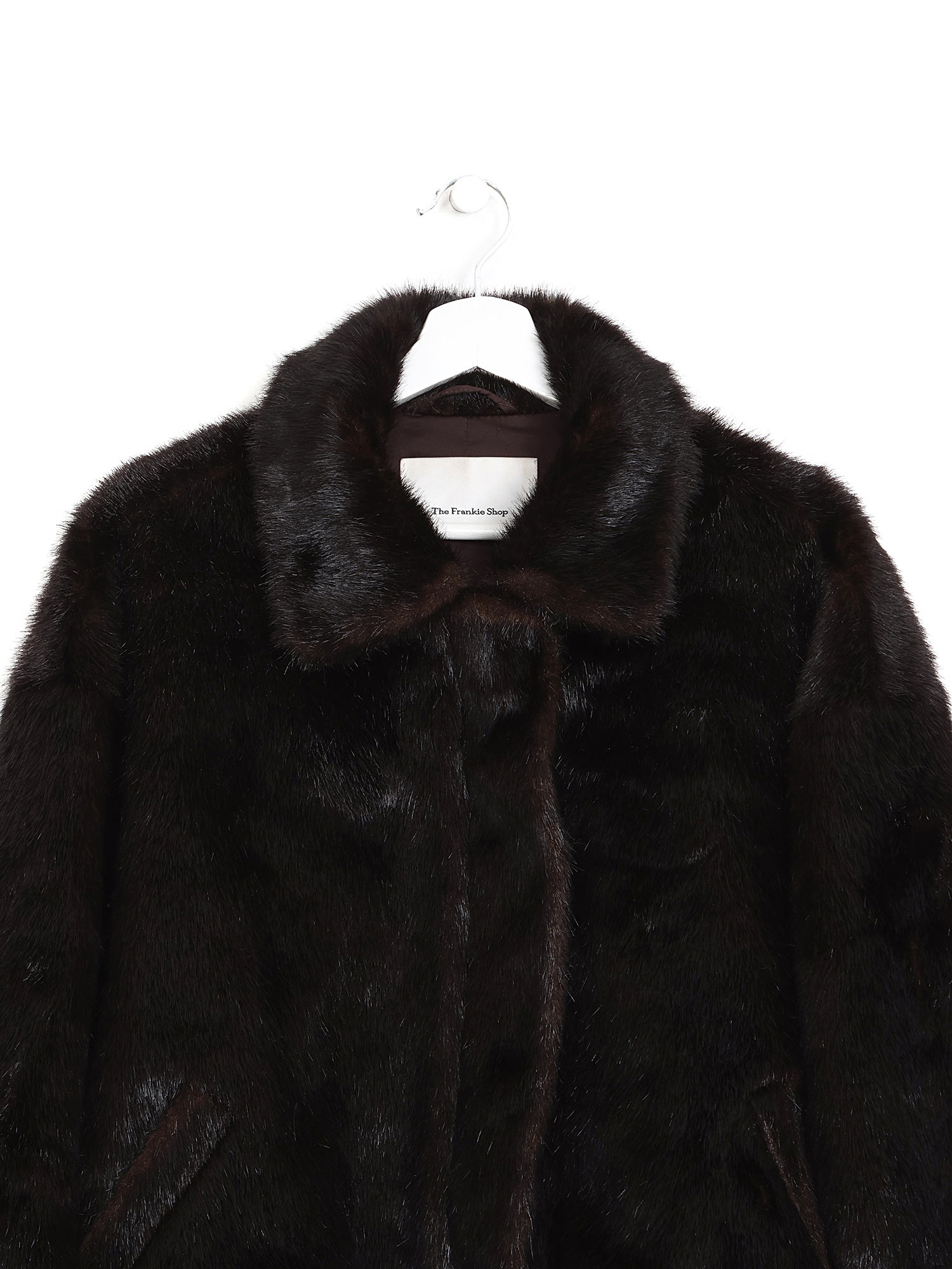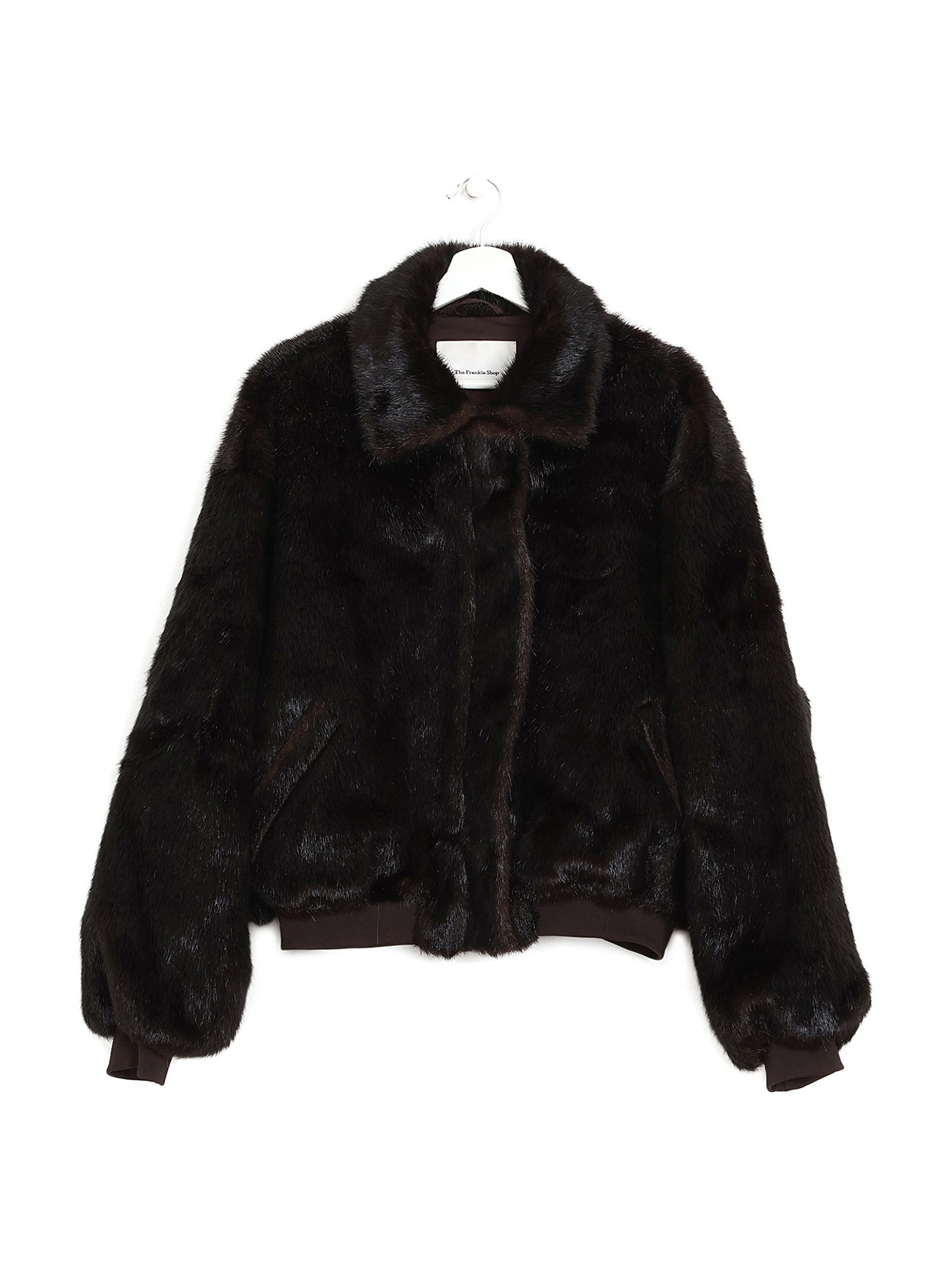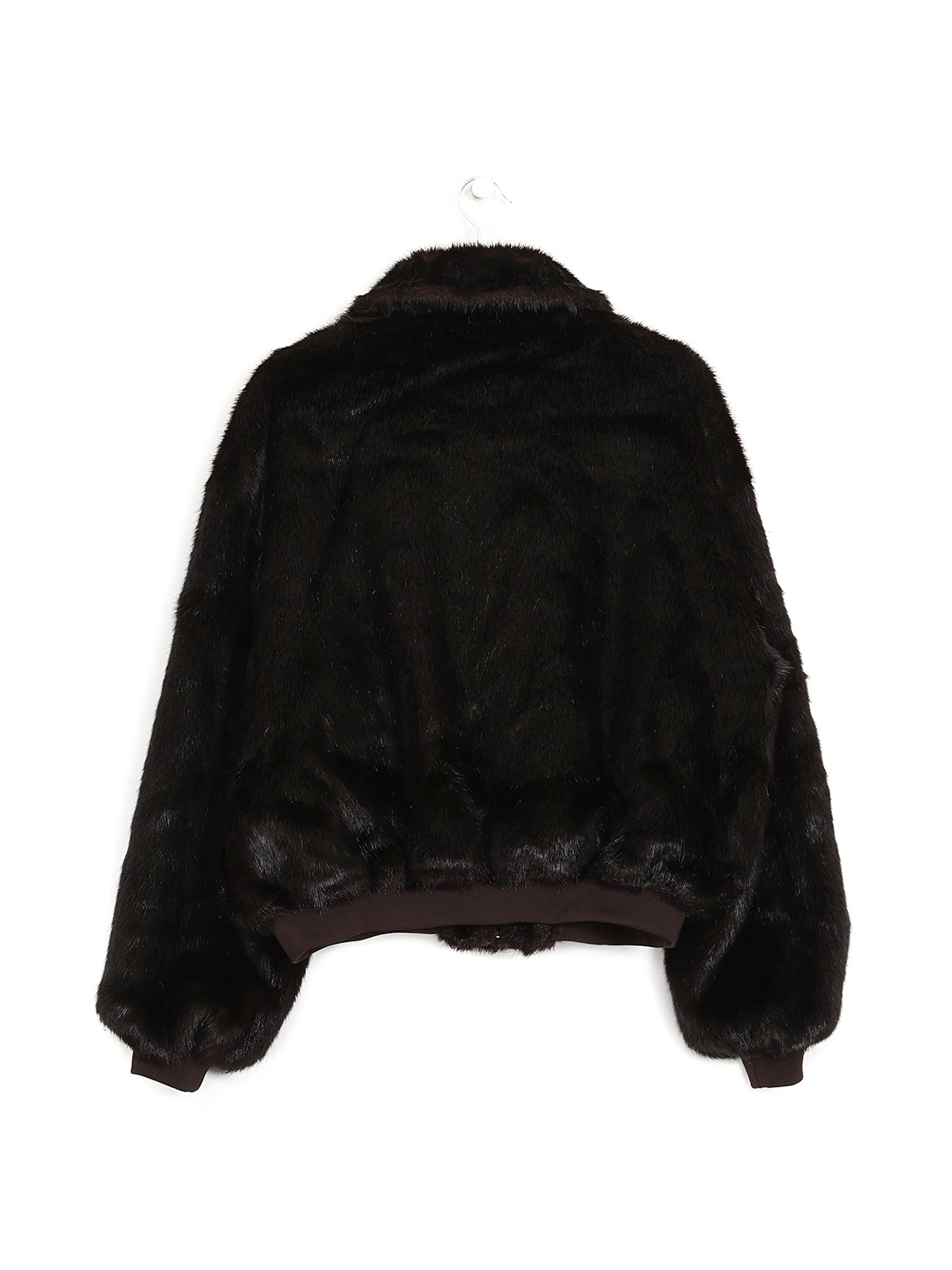 Black faux fur jacket with long sleeves. Features a cropped fit and open front design.