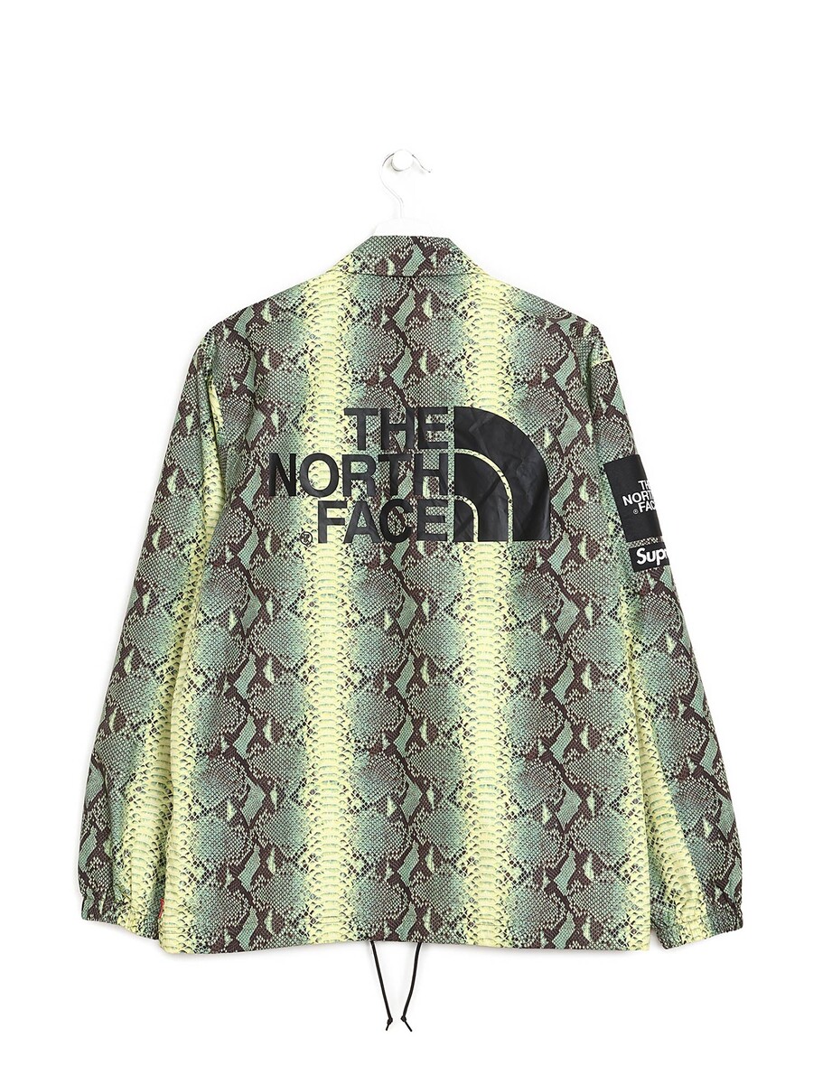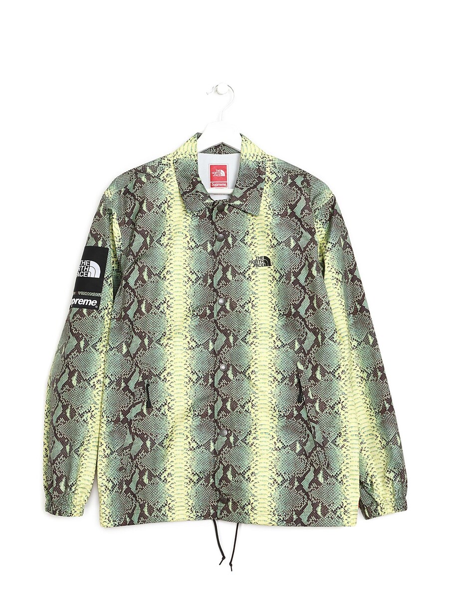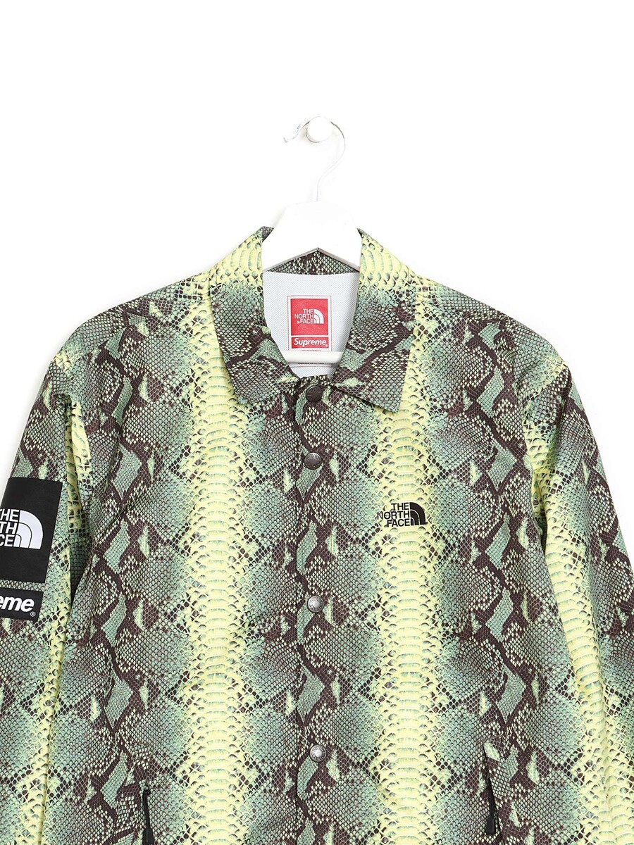 Snakeskin print jacket in shades of green and yellow. Features classic collar and button closure. Logos are prominently displayed on the front, back, and sleeve.