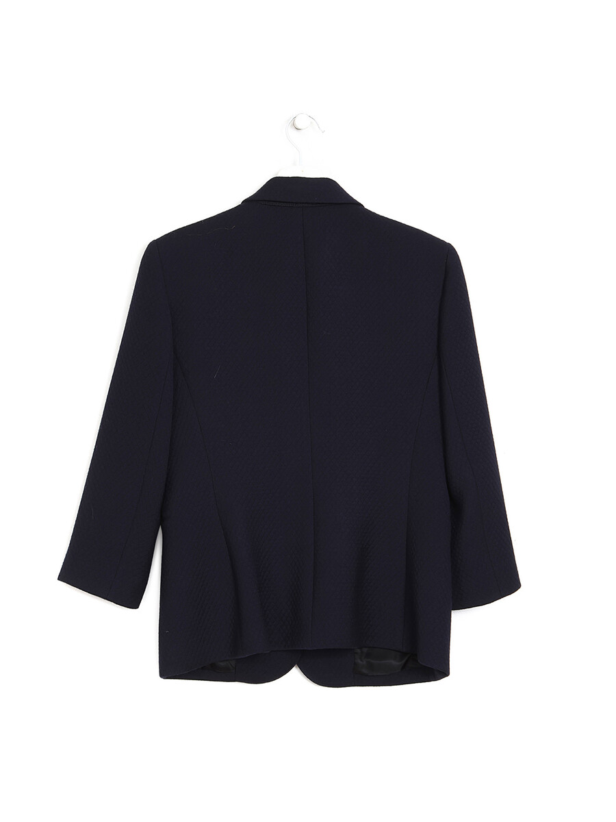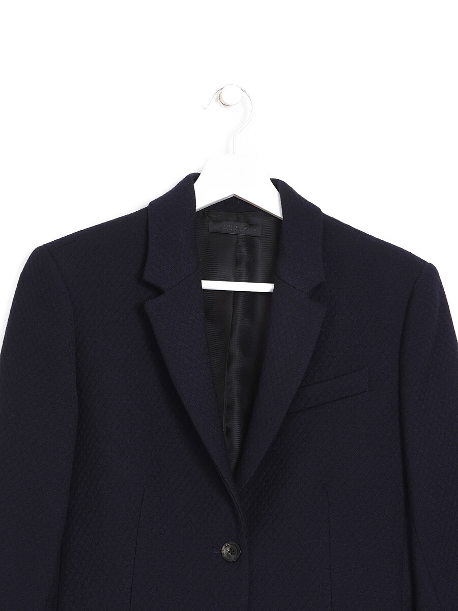 Textured long-sleeve wool jacket in dark blue. Notched lapel collar. Front button closure. Three pockets.