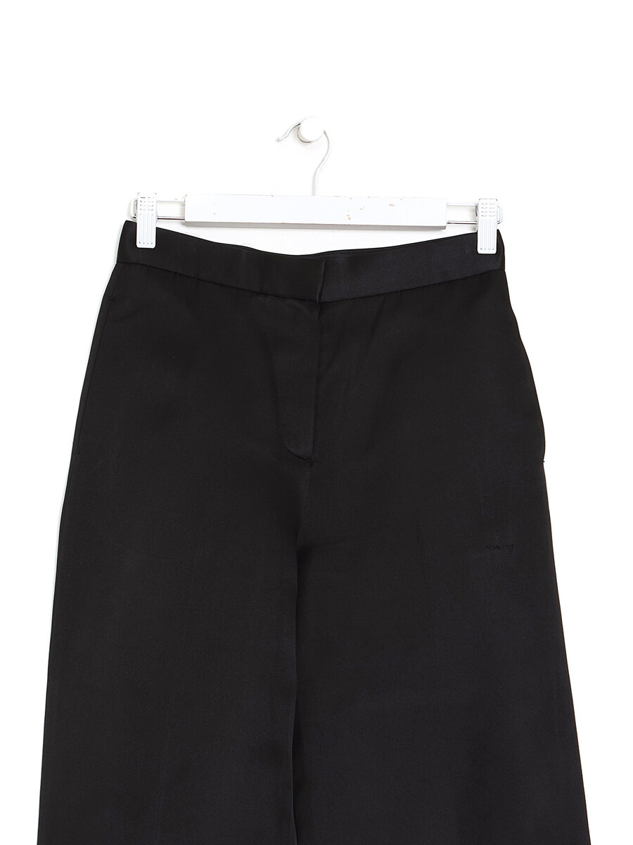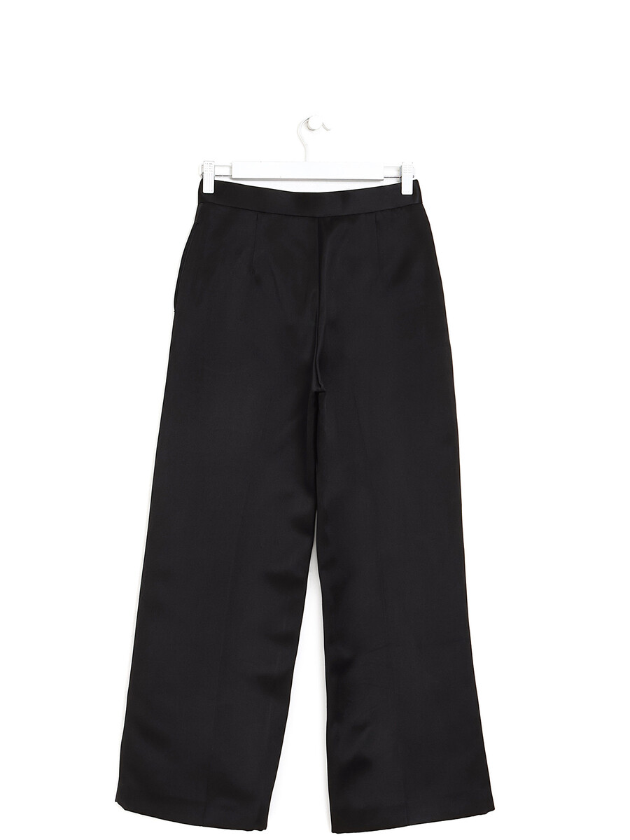 Wide-leg silk trousers in black. Zipper with button closure. Elegant and flowing silhouette.