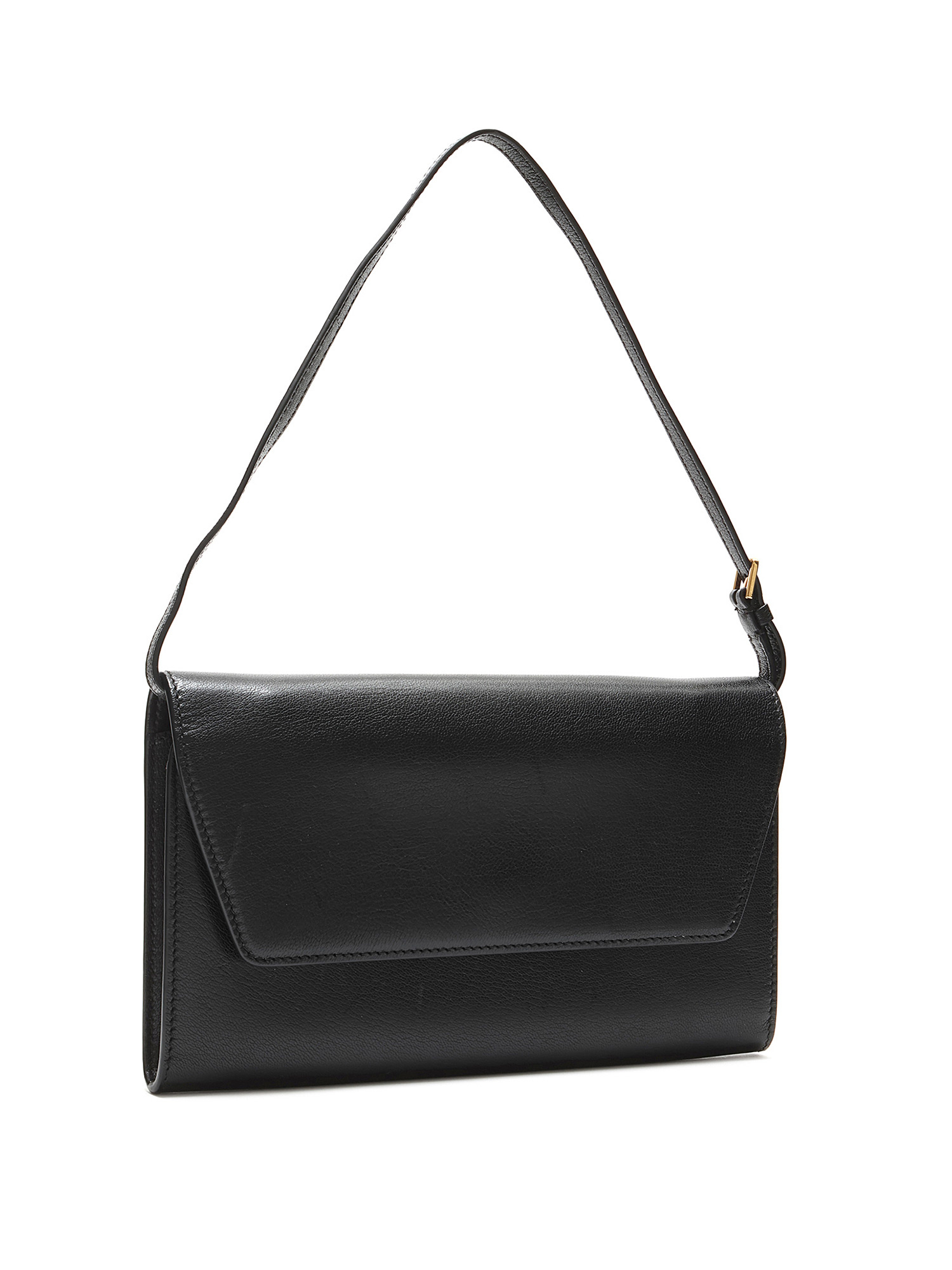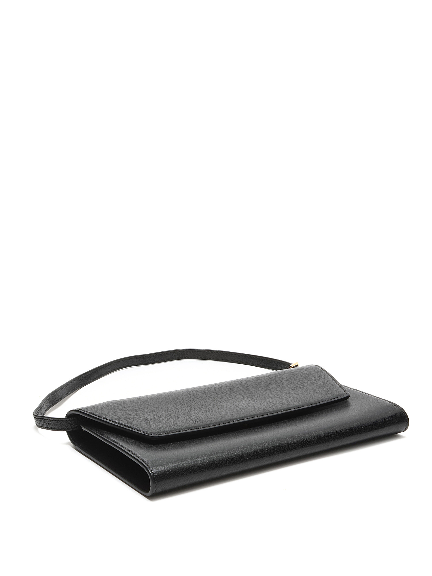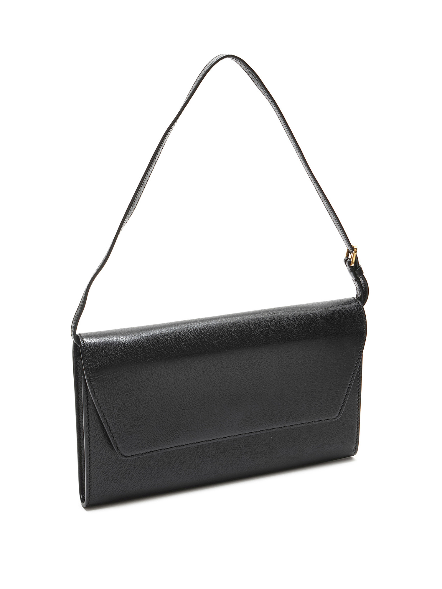 Leather clutch with tonal stitching in black. Magnetic snap closure. Adjustable leather shoulder strap. Gold hardware. Interior compartment for organization. Comes with a protective pouch.
