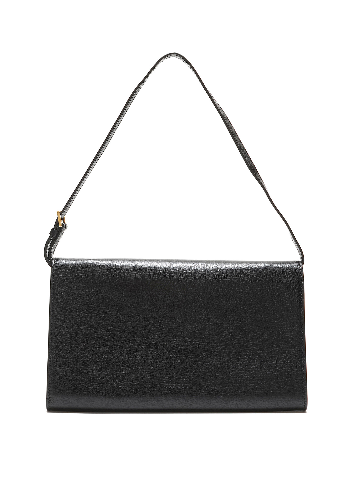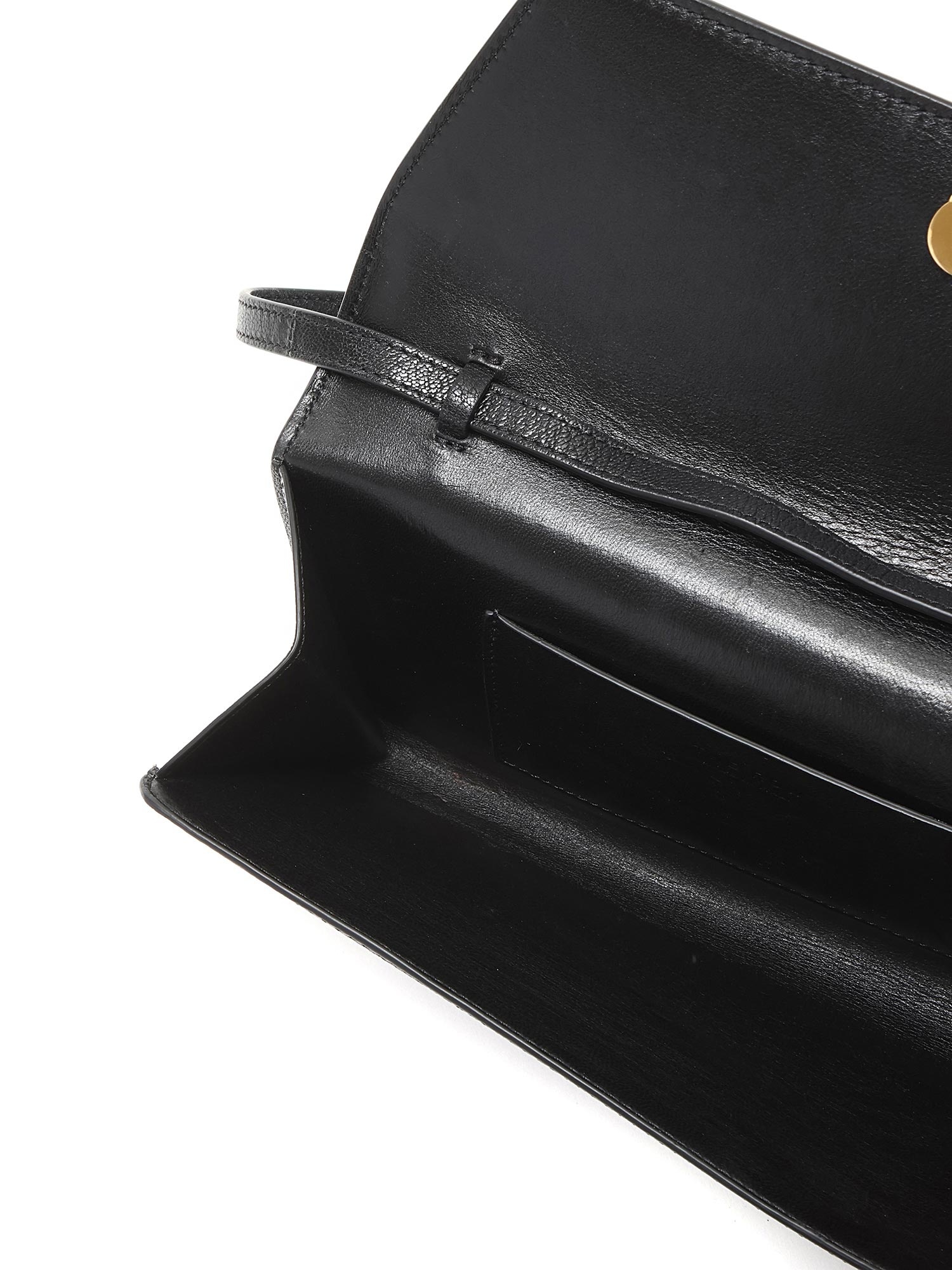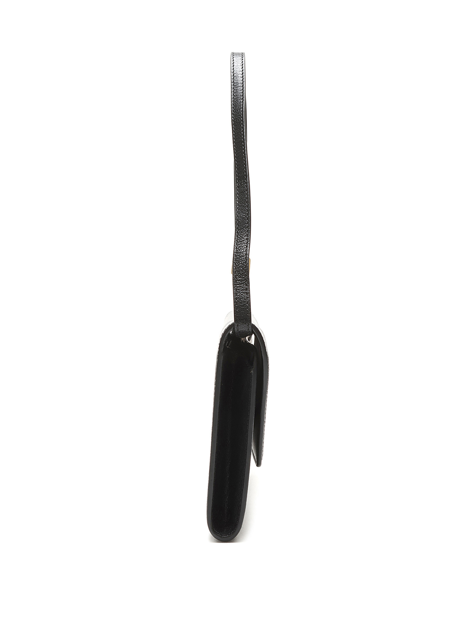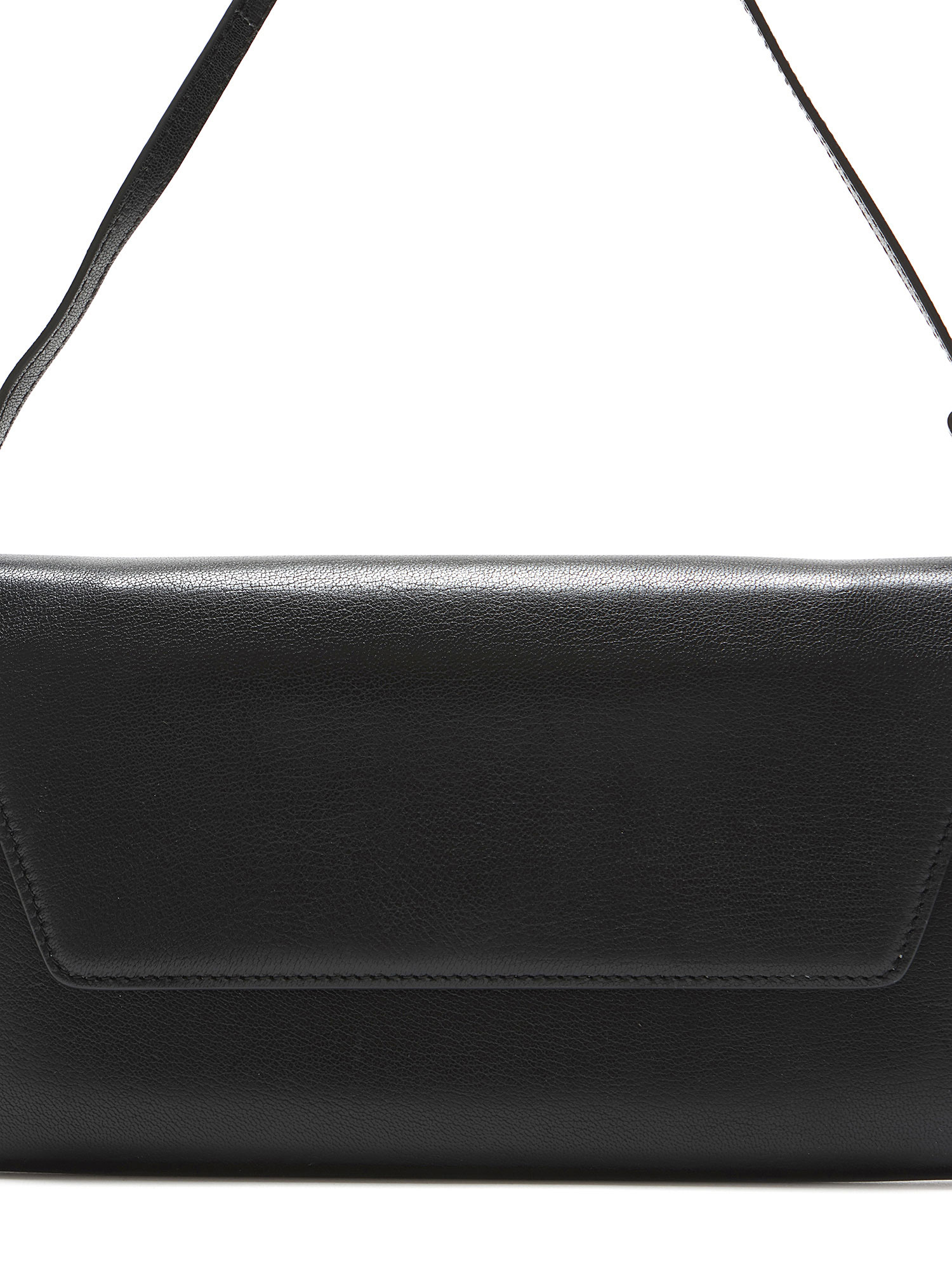 Leather clutch with tonal stitching in black. Magnetic snap closure. Adjustable leather shoulder strap. Gold hardware. Interior compartment for organization. Comes with a protective pouch.