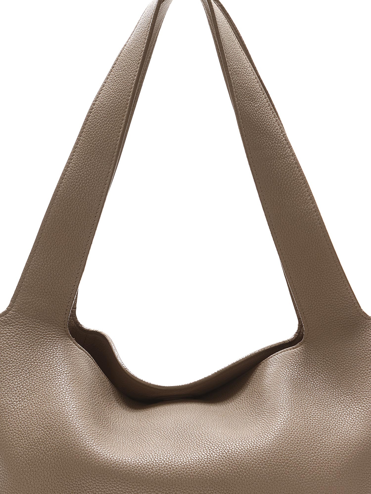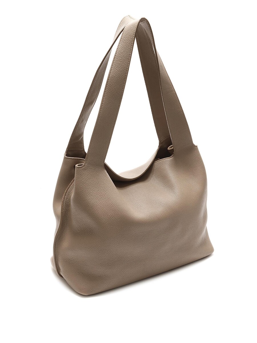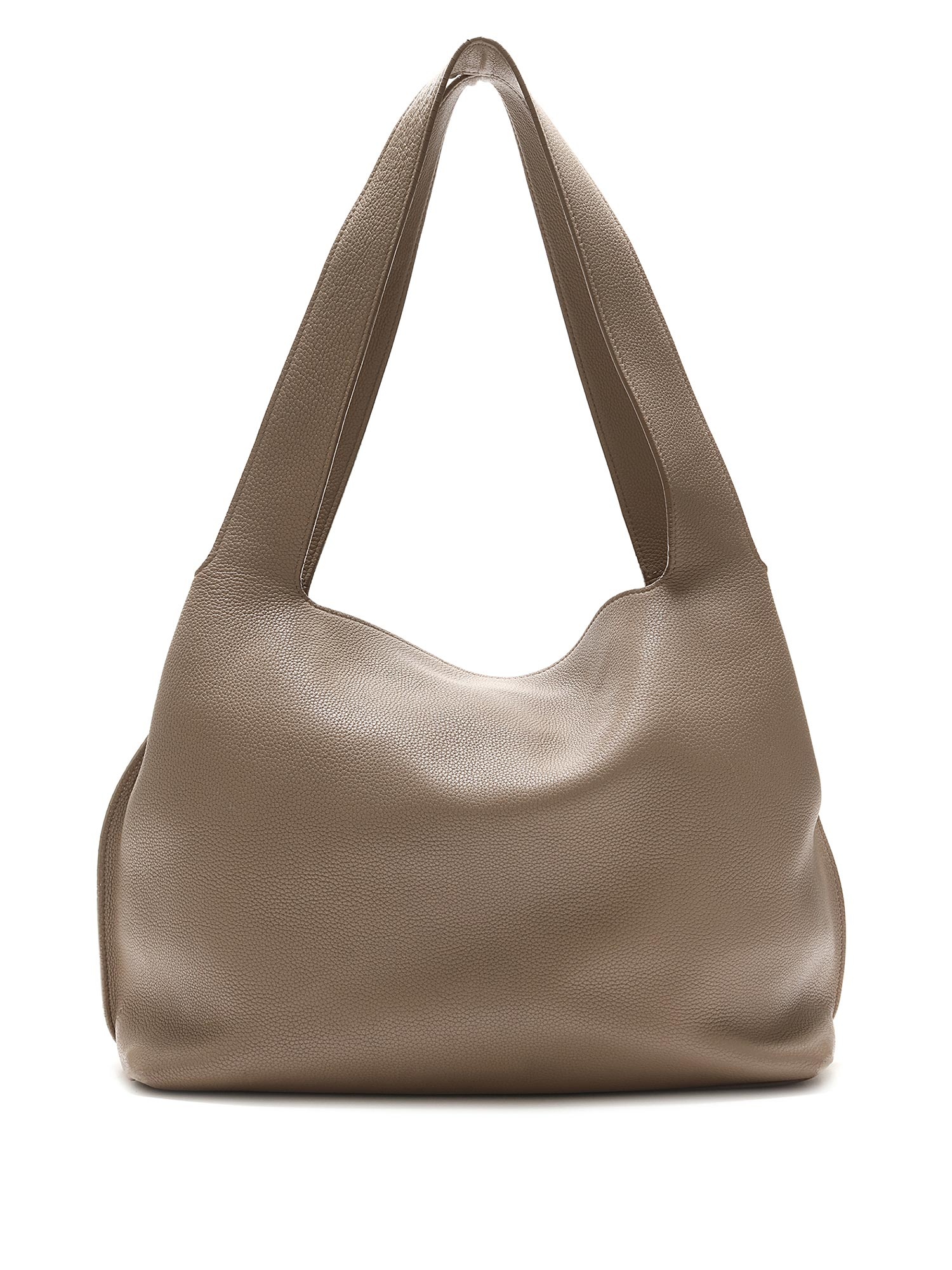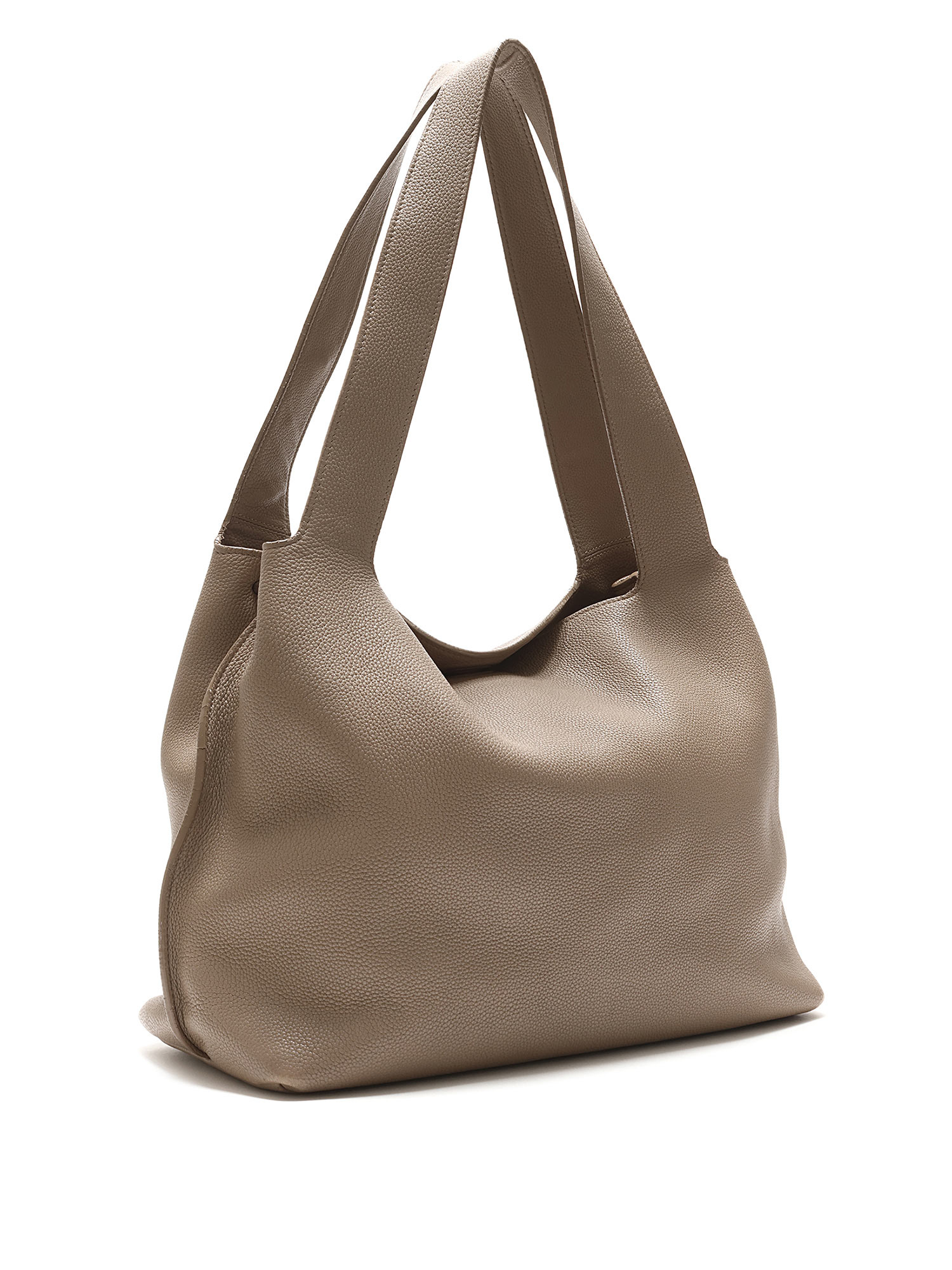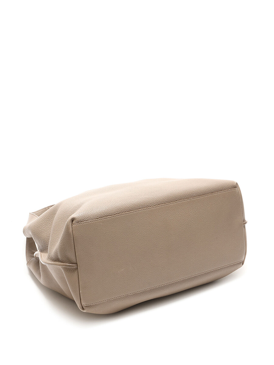 Grained leather tote bag with open top and leather strap with silver-tone metal bar closure. Fixed leather handles. Silver-tone hardware.