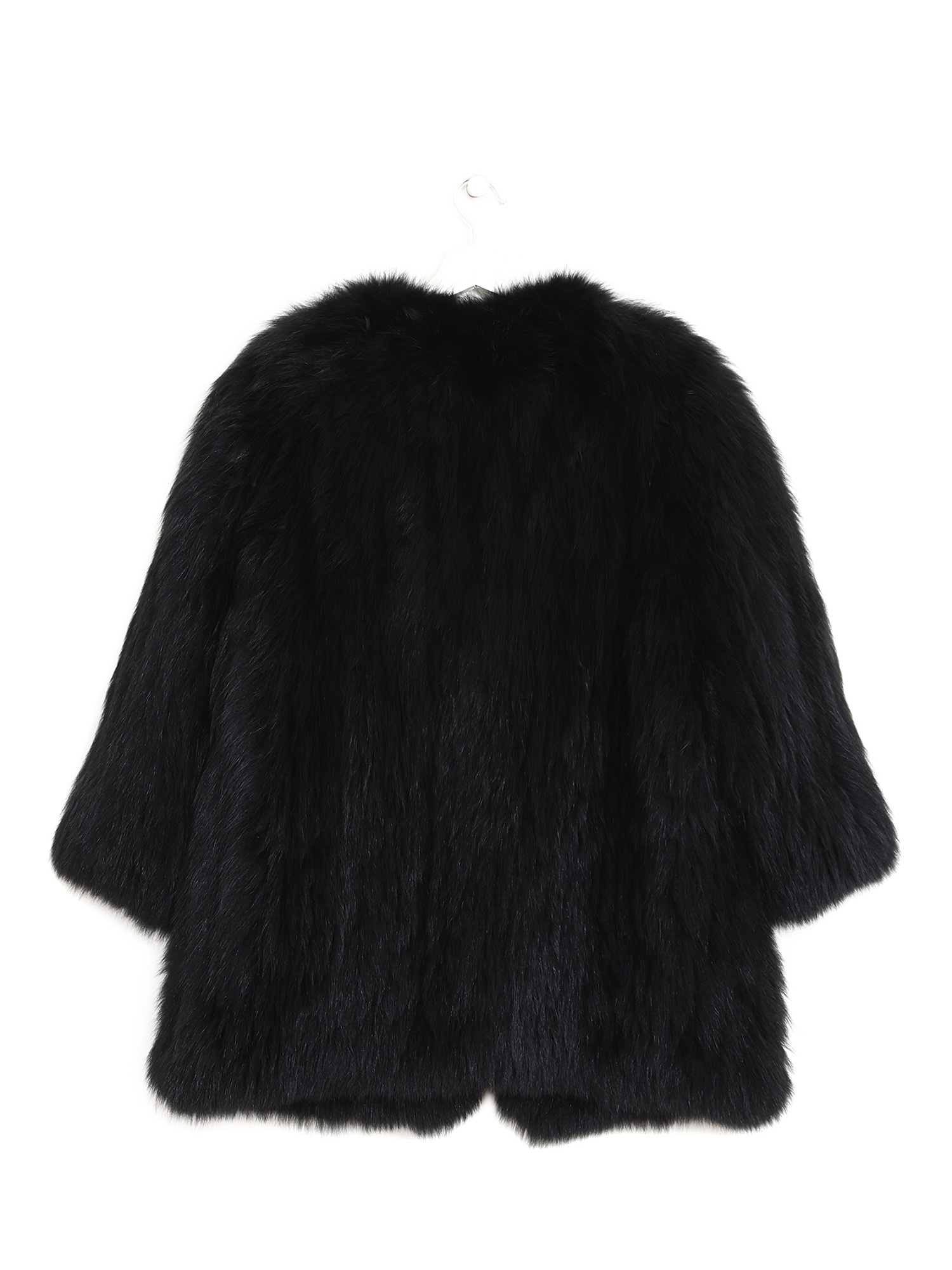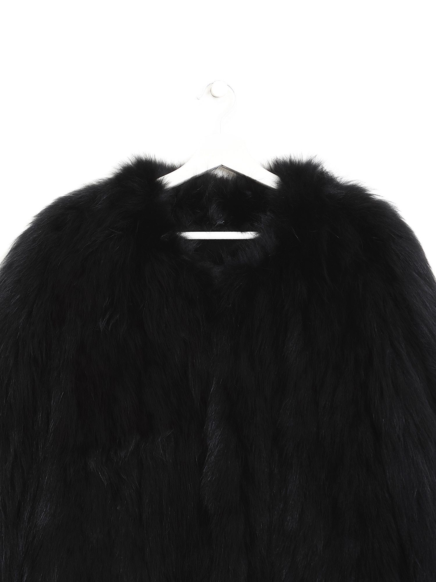 Blue fox fur jacket in black. Hook closure at the front. Luxurious and plush texture.