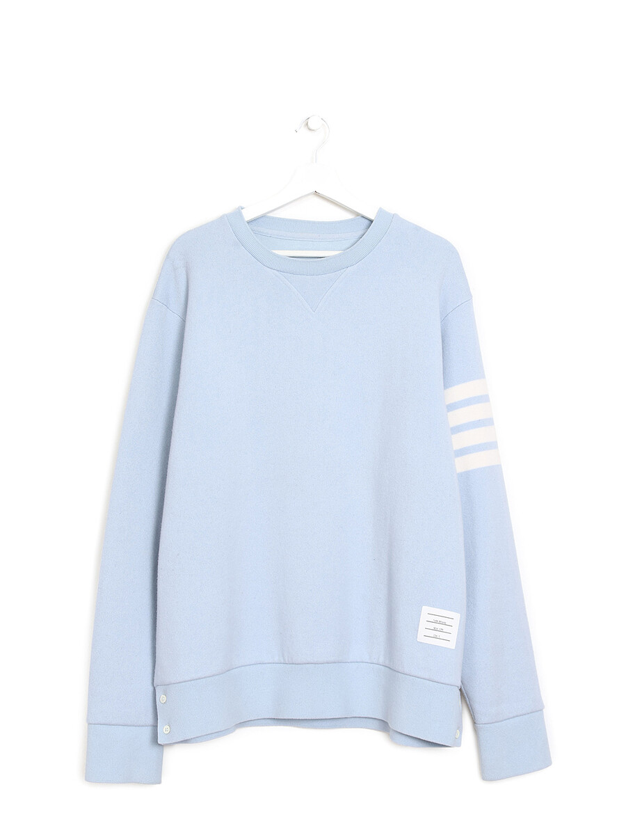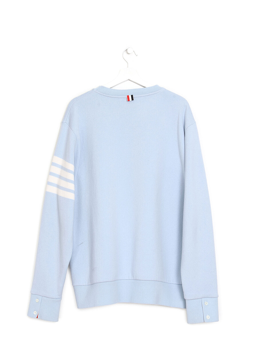 Powder blue cashmere blend crewneck sweater with long sleeves. Features signature white stripes on the sleeve. Soft and cozy for layering.