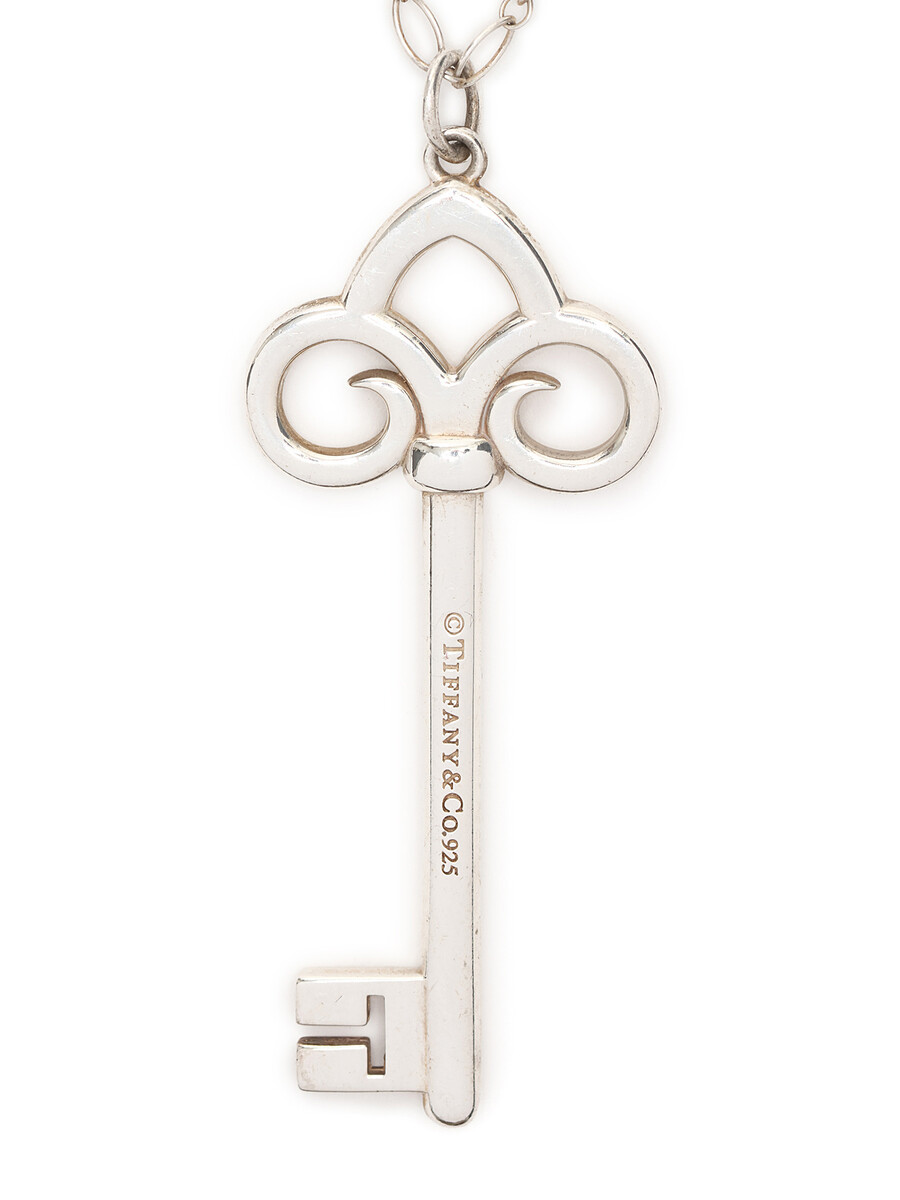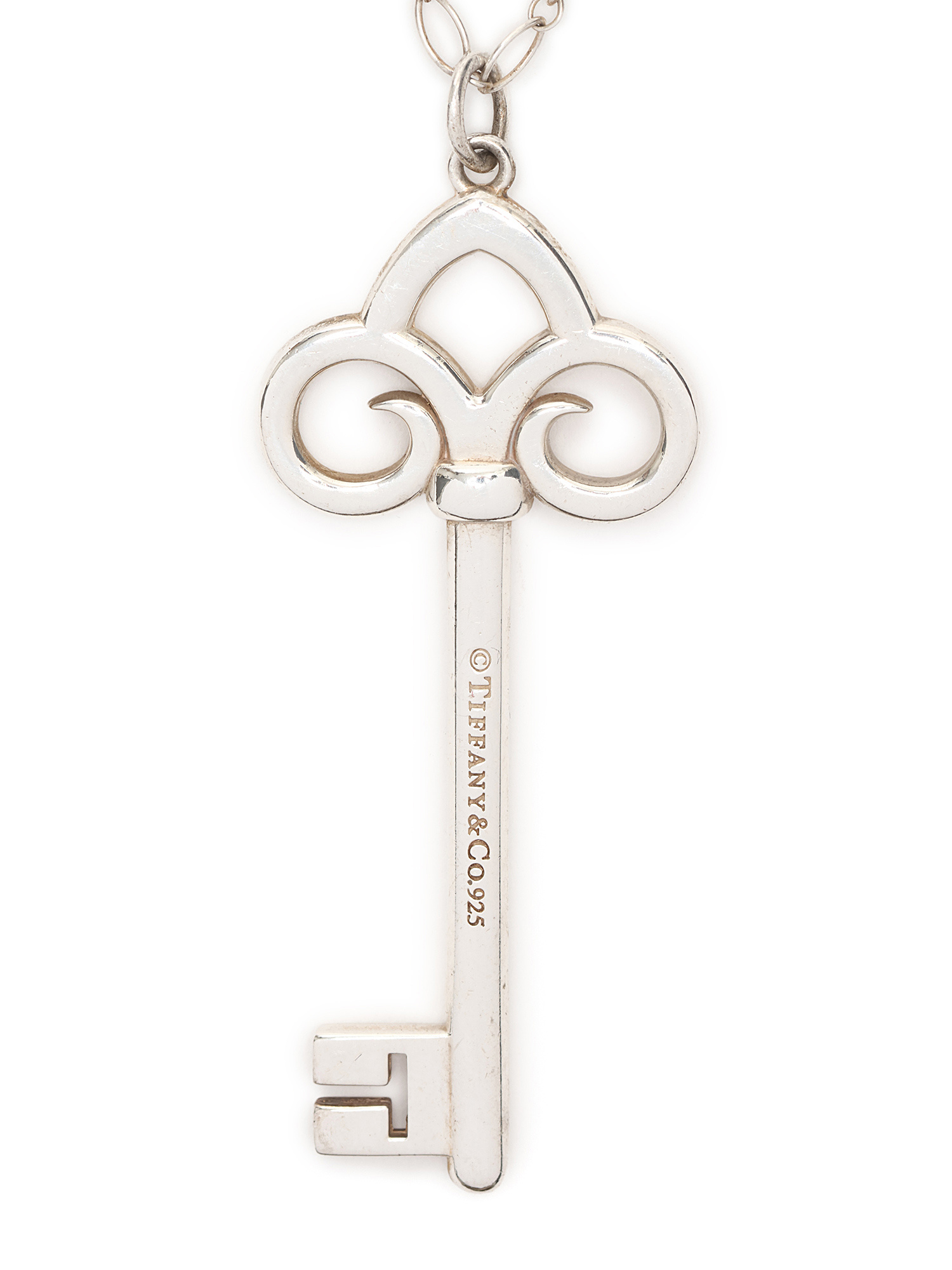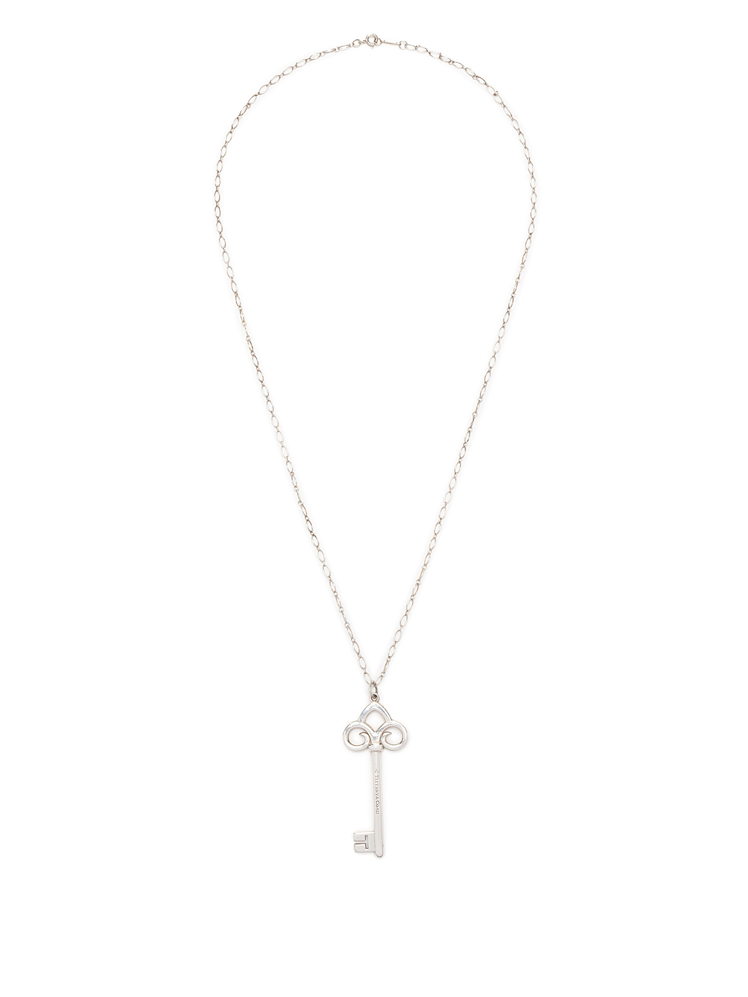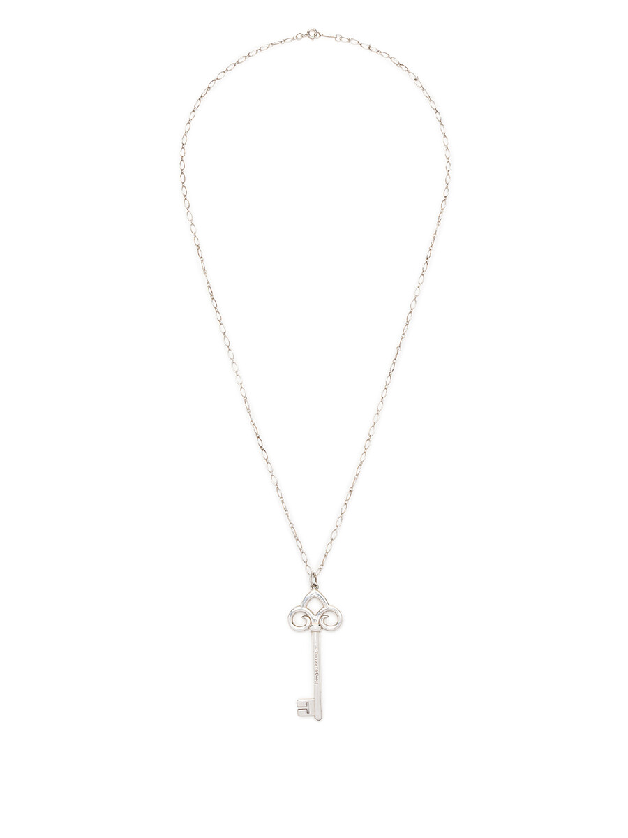 Sterling silver key pendant necklace on a long chain. Features a spring ring clasp. Comes with a dust bag and box.